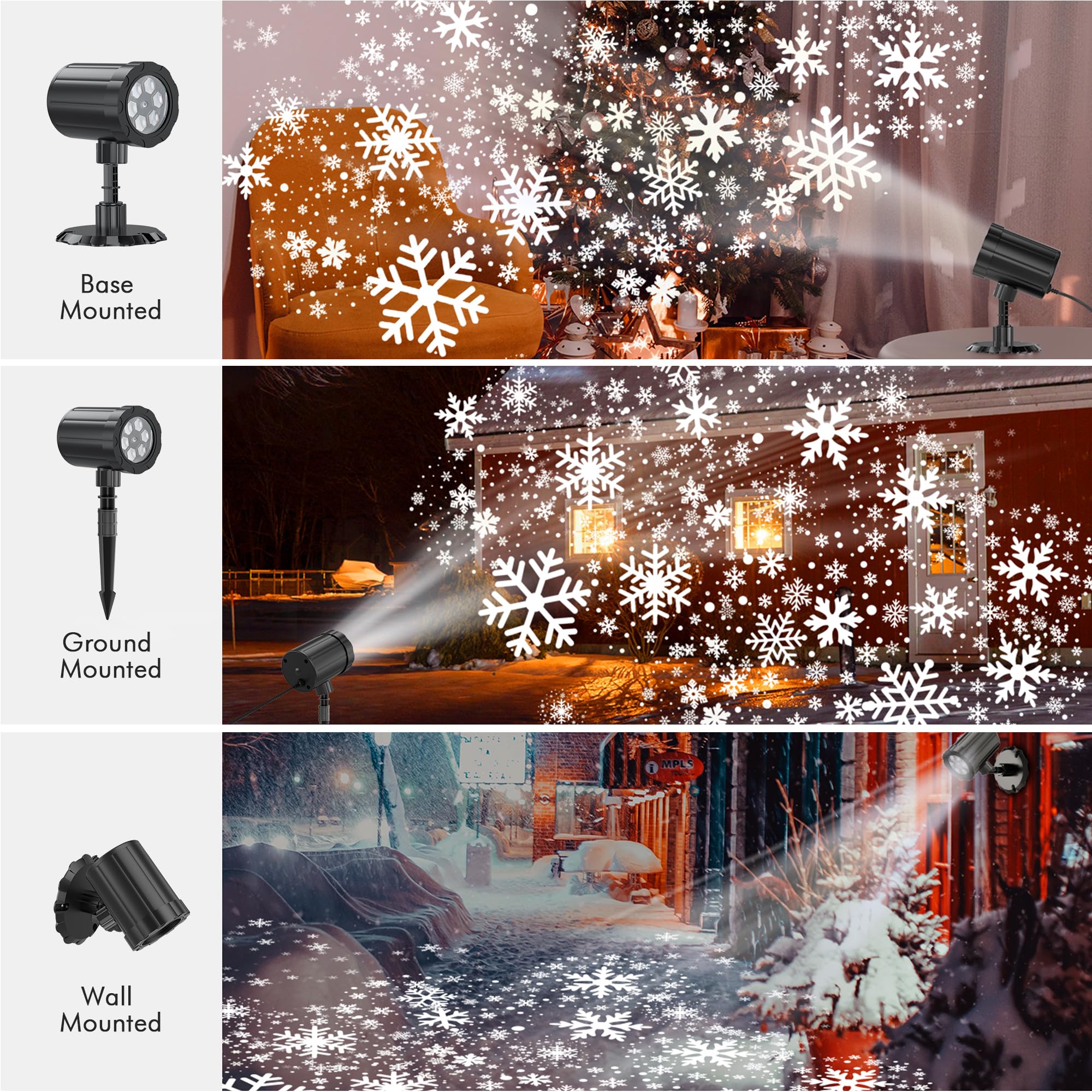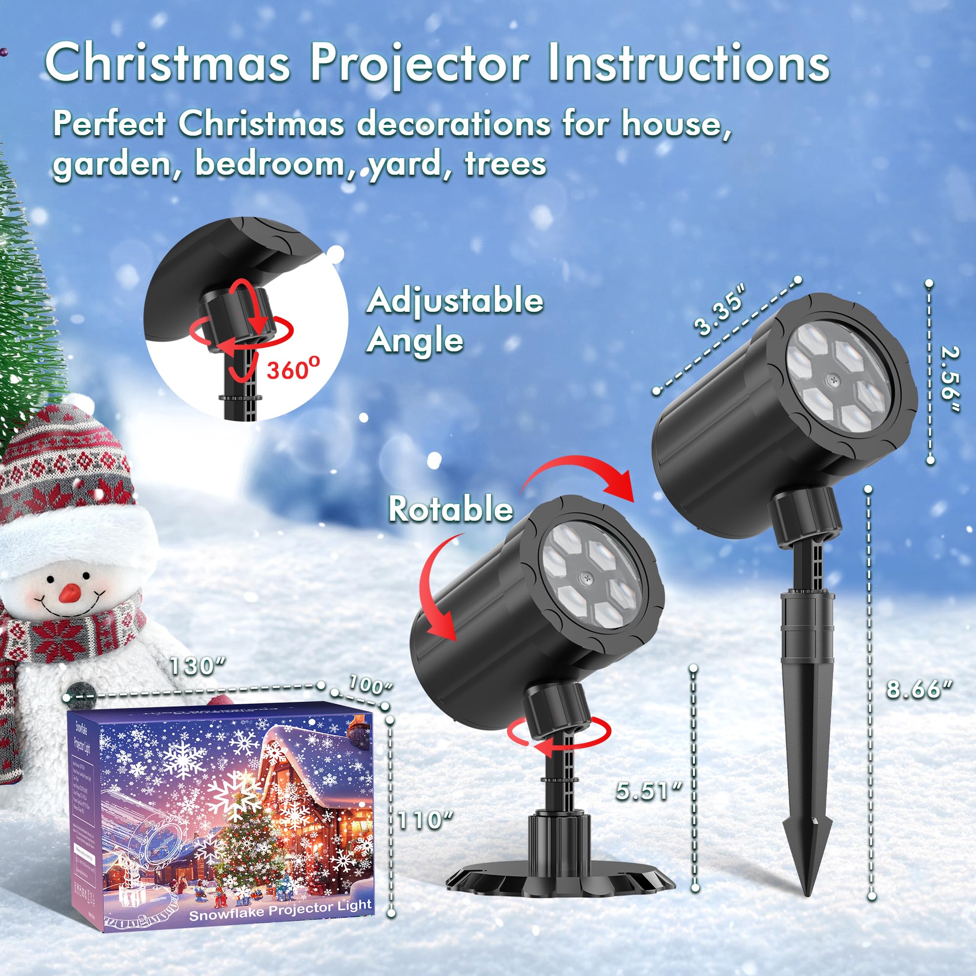 Easy & Flexible Installation: Equipped with a removable mounting bracket, a ground stake, and a base, you can insert the Christmas projection light into the lawn, snow, or screw it to the wall to project snowflakes onto your house and yard; It can also be placed on the table to decorate your living room; Whether indoors or outdoors, the LED light projector can bring you a strong festive atmosphere