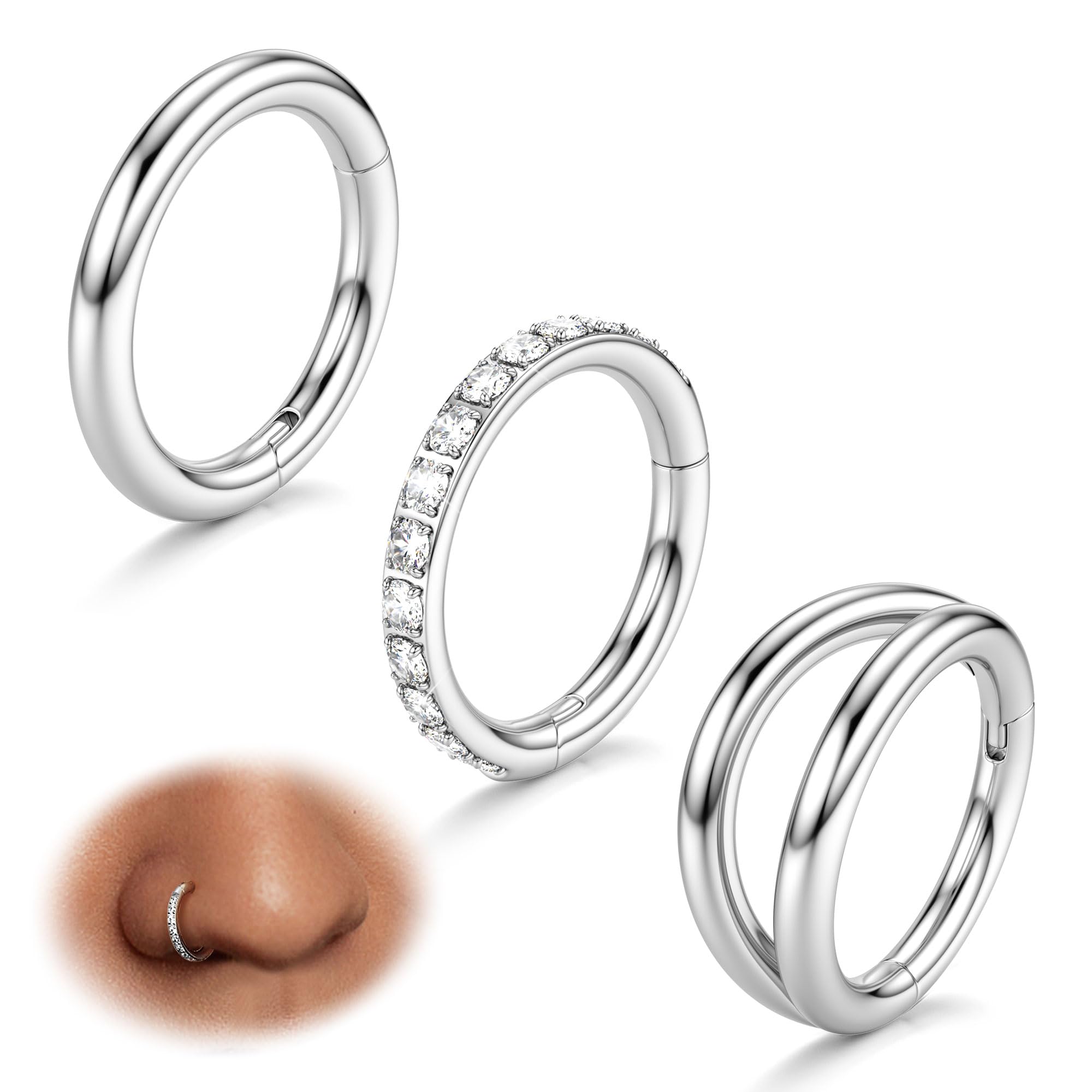 Seamless Silver Plated Nose Ring Hoop: Gauge size: 14G(1.6mm); Inner diameter: 9mm(0.35 inches); Material: 316L stainless steel; One order includes 3 piece of hinged segment ring, comes in various styles to meet your fashion needs: sparkly CZ nose hoop, double hoop nose ring, dainty single septum hoop;We've provided the size comparison chart for you reference