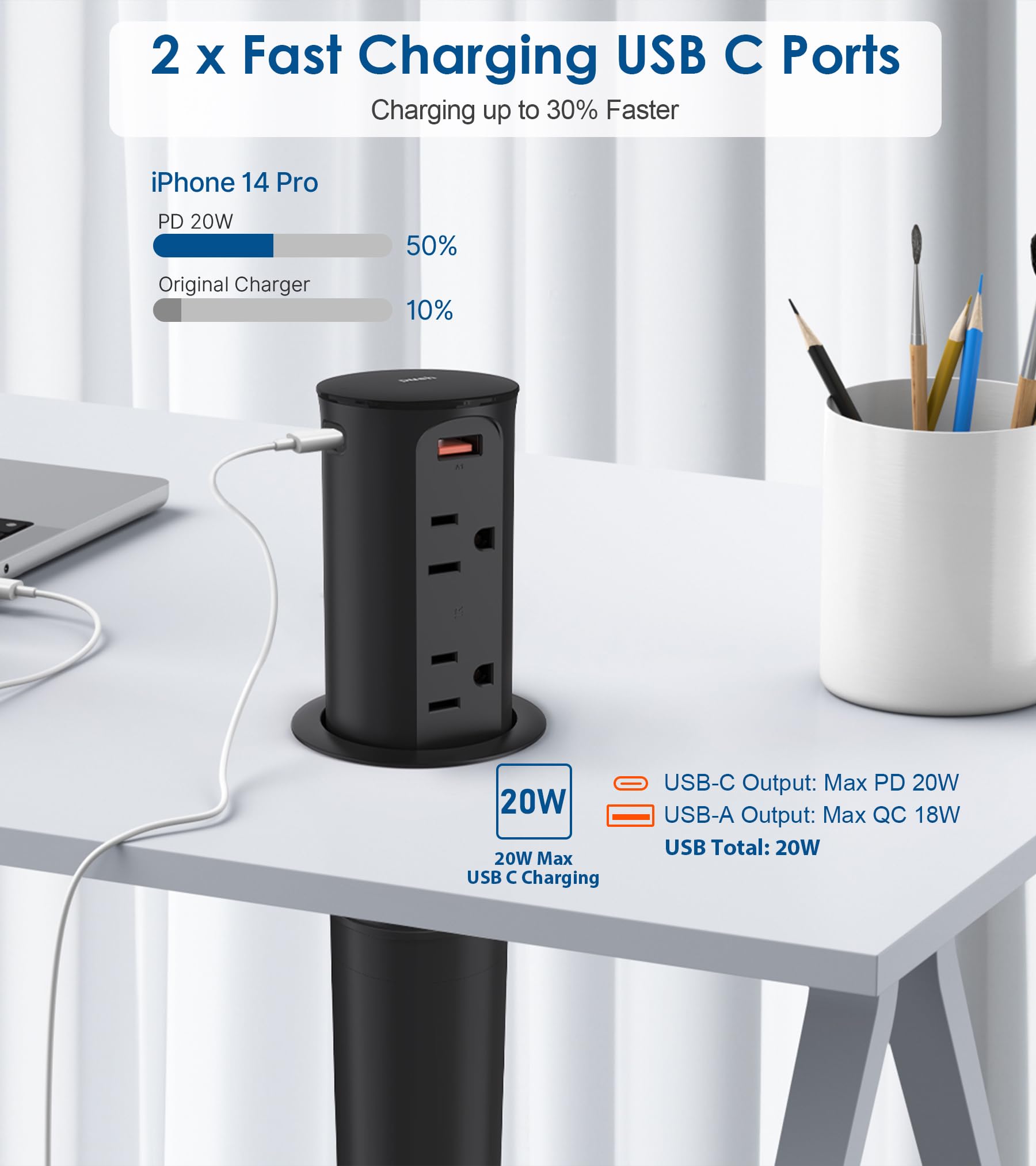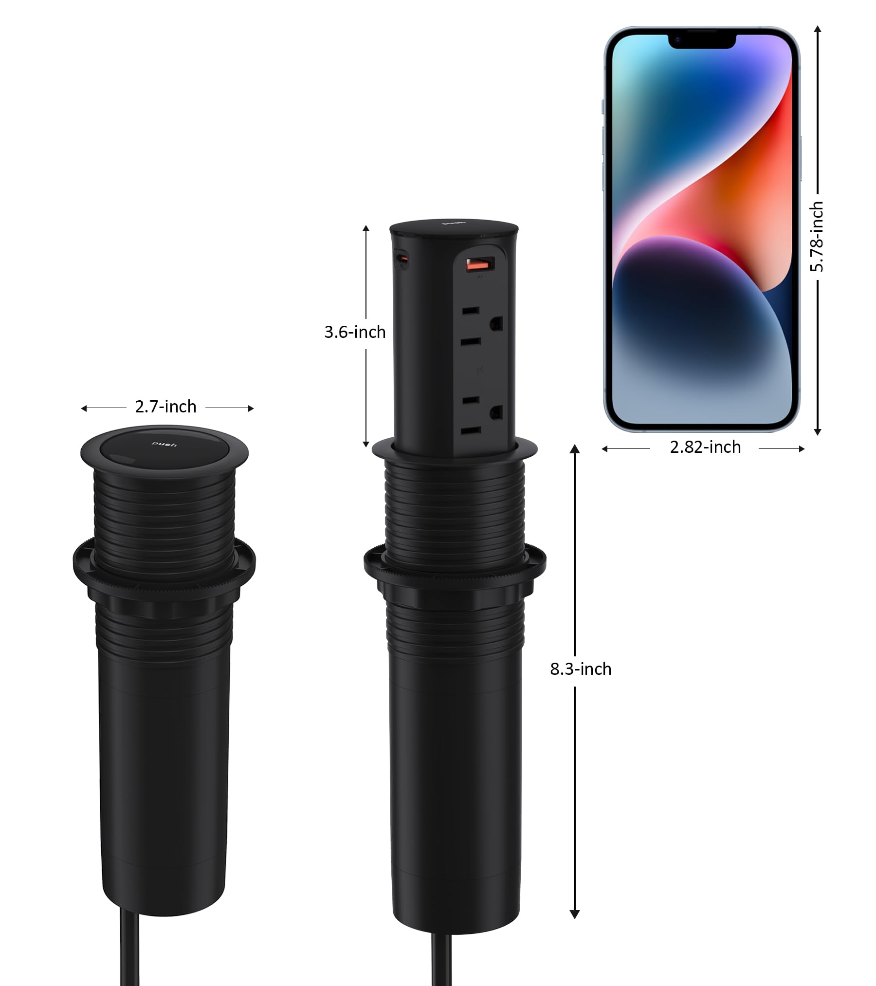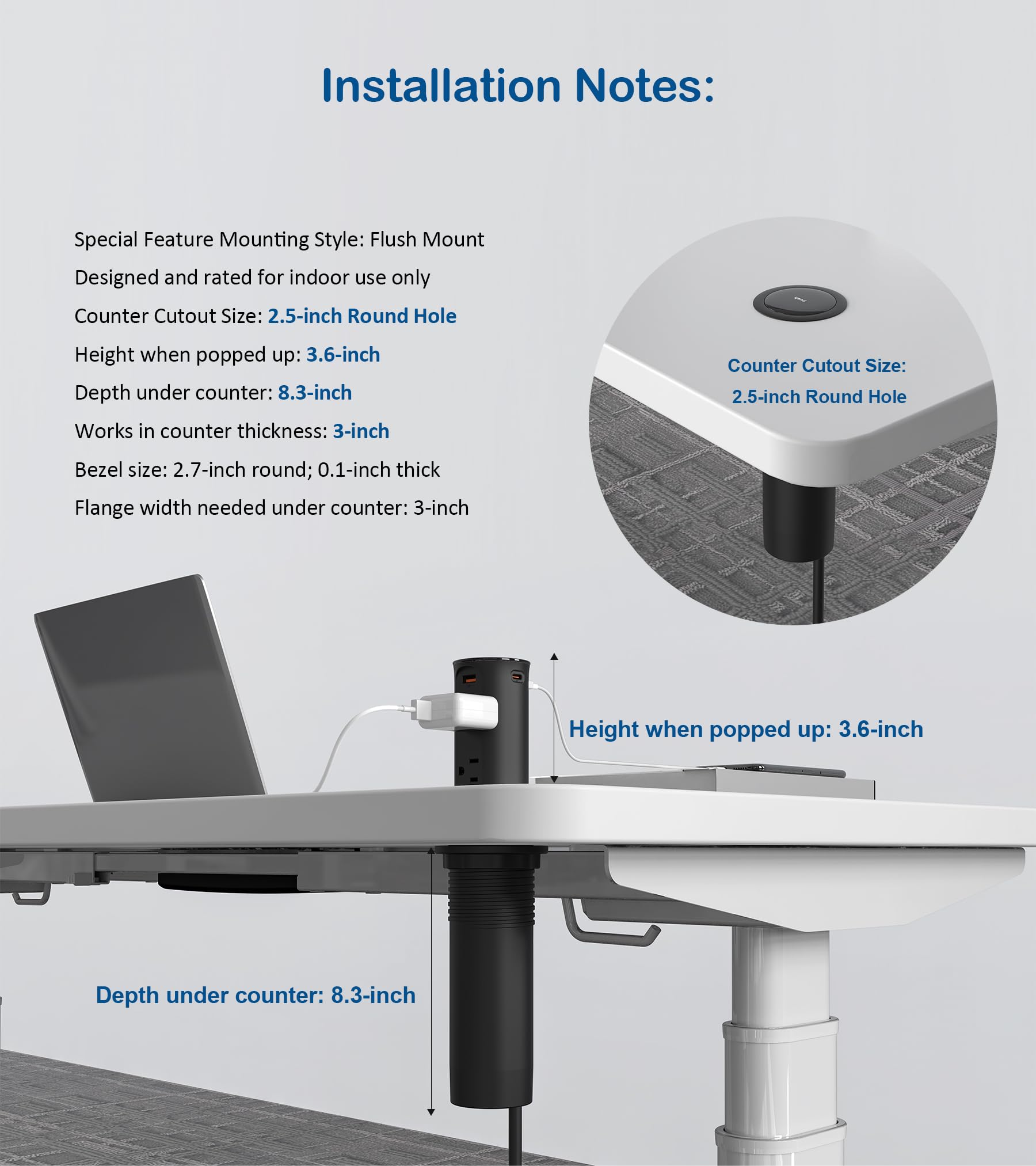 【Easy Installation】Jgstkcity pop up outlet fits a 2.5-inch (60mm) hole size,and has a built-in spring-loaded pop-up mechanism, simply press in the top to pop the unit up for use.Cut a 2.5 inch (60mm) hole, slide the outlet body in, and tighten the ring. Set up easily in your home, kitchen, office, or conference room.