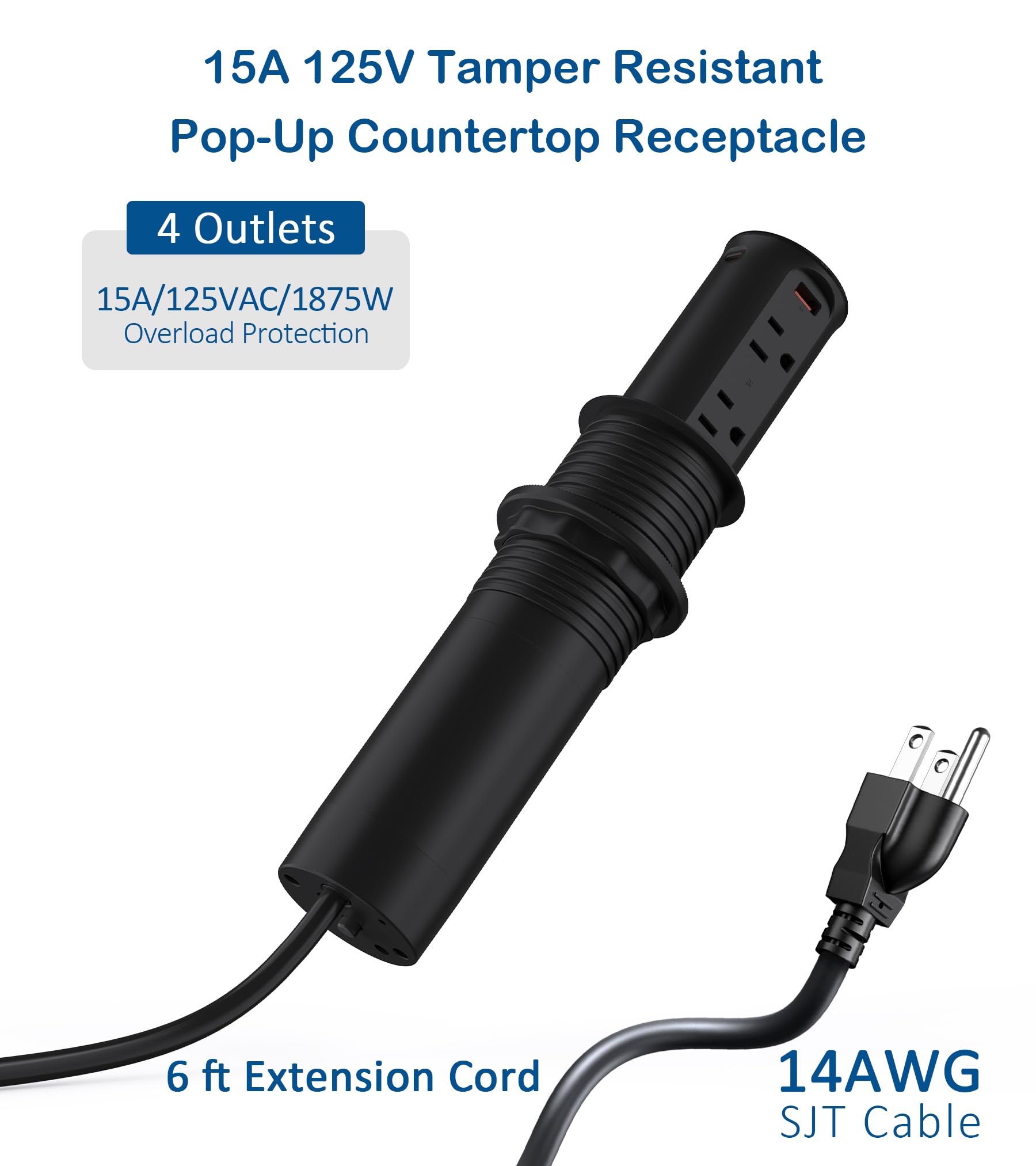 【Countertop Pop Up 15A Outlet】Power grommets come in round shapes,and hide in your granite or quartz out of sight, but pop up when needed.Use the 15 Amp rated receptacle for powering appliances. The socket is Tamper Resistant (TR) to meet code and keep children from electrocuting themselves.