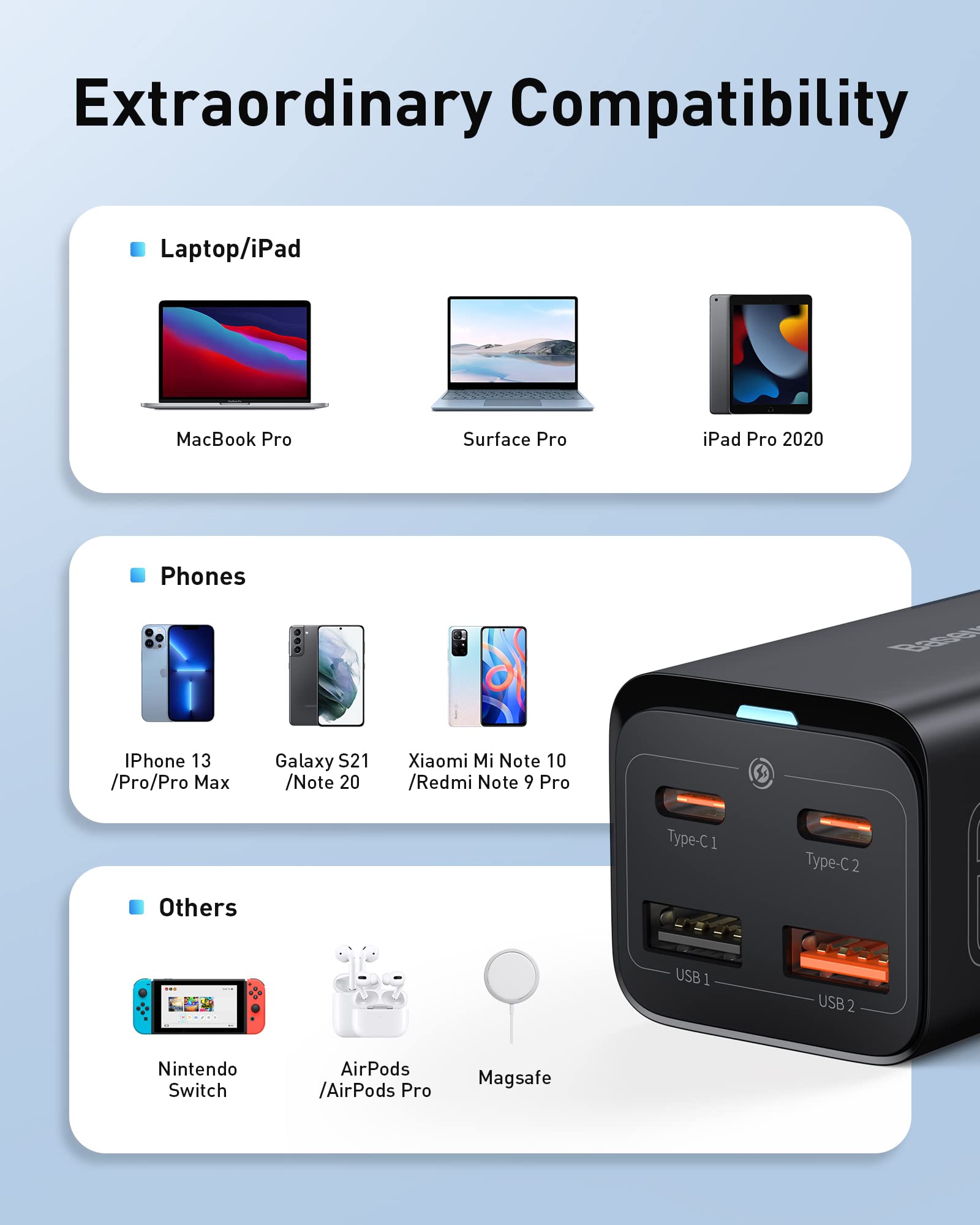 The New GaN3 USB-C Charger: Say goodbye to old, bulky chargers. Baseus 65W desktop charger brings you a charging experience you've never had before. With just one charger, you have the power to charge your phone, tablet and USB-C laptop quickly.