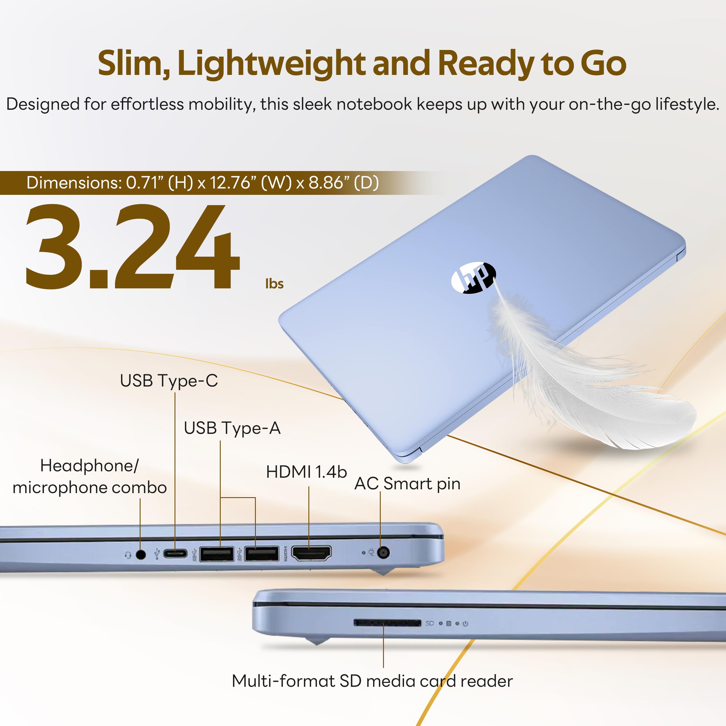 【Windows 11 】Work smarter with a sleek, powerful operating system that enhances productivity and creativity.【Dimensions & Weight】Item: 12.76 x 8.86 x 0.71 inches, 3.24 lbs.【Ports】1x USB Type-C, 2x USB Type-A, 1x Headphone/microphone combo, 1x Media card reader, 1x HDMI 1.4b, 1x AC Smart pin. Wi-Fi 6, Bluetooth 5.4.【Bonus Docking Station Set】1x 7-in-1 Docking Station with 128GB Storage, 1x 32GB MicroSD Card with Adapter, 1x Type-C Data Cable, 1x 3-in-1 Charging Cable, 1x Suede Cleaning Cloth.