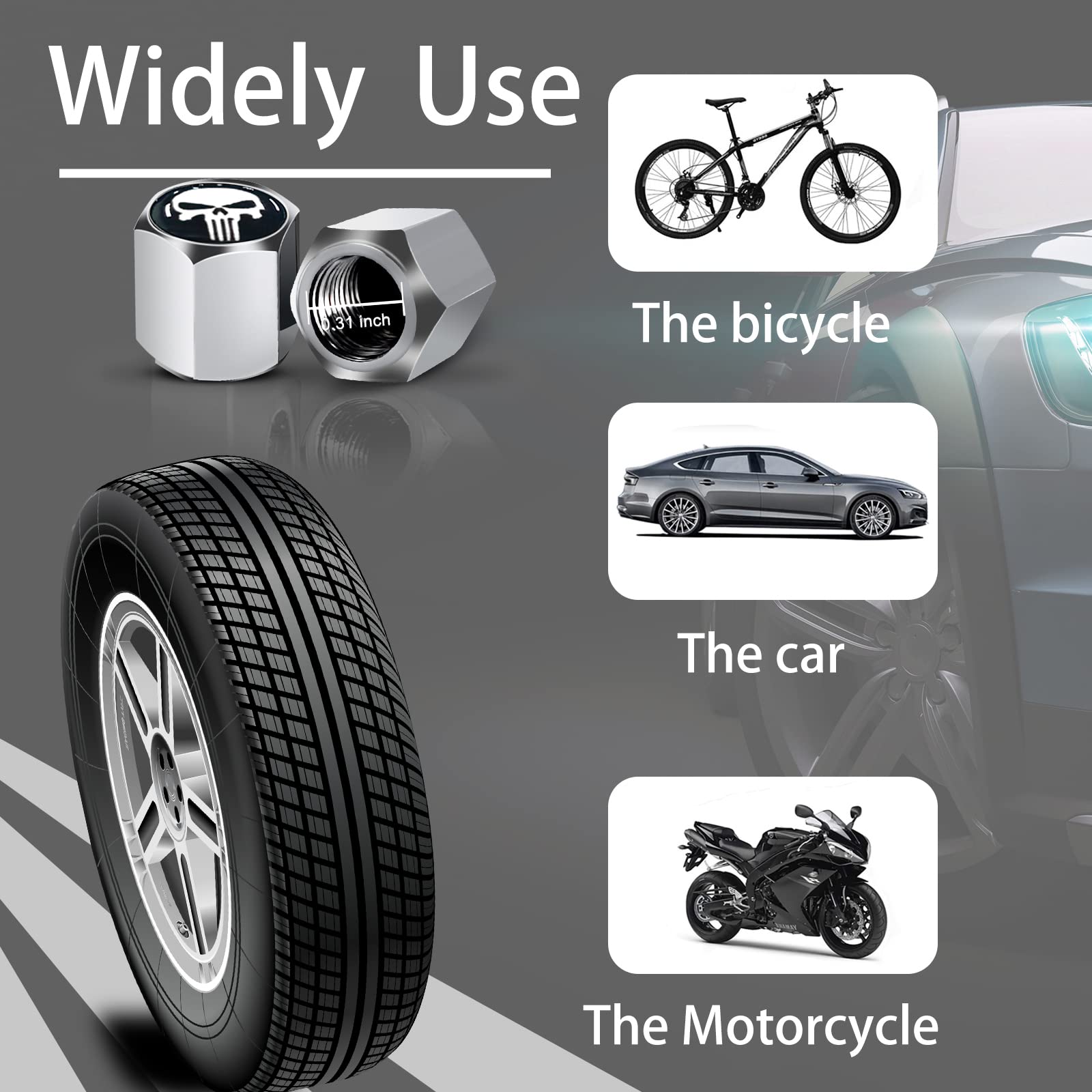 Widely Use: Before purchase, make sure your tires have standard American type valves. This cap is measuring 13mm*11mm, General for most cars, vehicles, bicycles, trucks, motorcycles, etc.