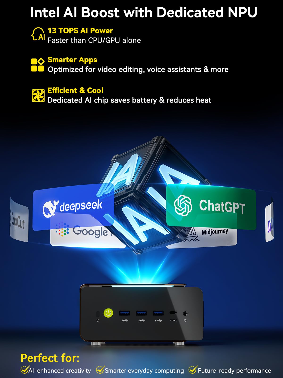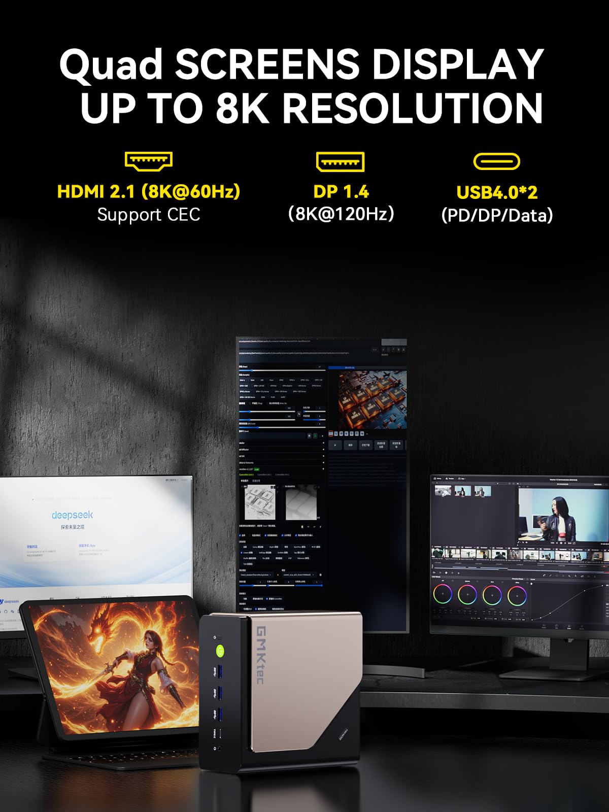 QUAD SCREEN 8K DISPLAY SUPPORT - EVO-T1 AI Mini PC support 4-screen 4K/8K output via HDMI 2.1 (8K@60Hz), DisplayPort 1.4 (4K@60Hz), and USB Type-C Transfer speed (supporting PD3.0/DP1.4/DATA). Ideal for gaming, video editing, and multitasking, it provides expansive and crisp multi-display support.