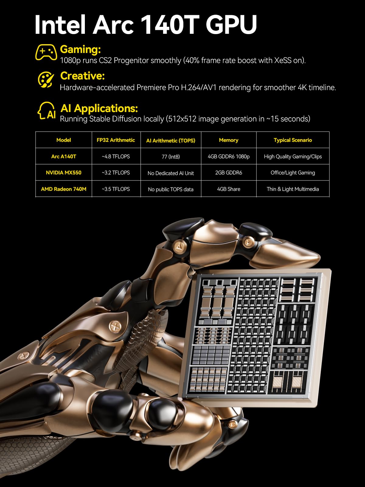 INTEL ARC 140T GAMING PC - The Arc 140T GPU includes 8 Xe cores and supports features like DirectX 12, OpenGL 4.5, and OpenCL 3, making it capable of handling modern games and creative applications. It also supports Quick Sync Video for efficient video encoding and decoding, as well as AV1 encoding and decoding.