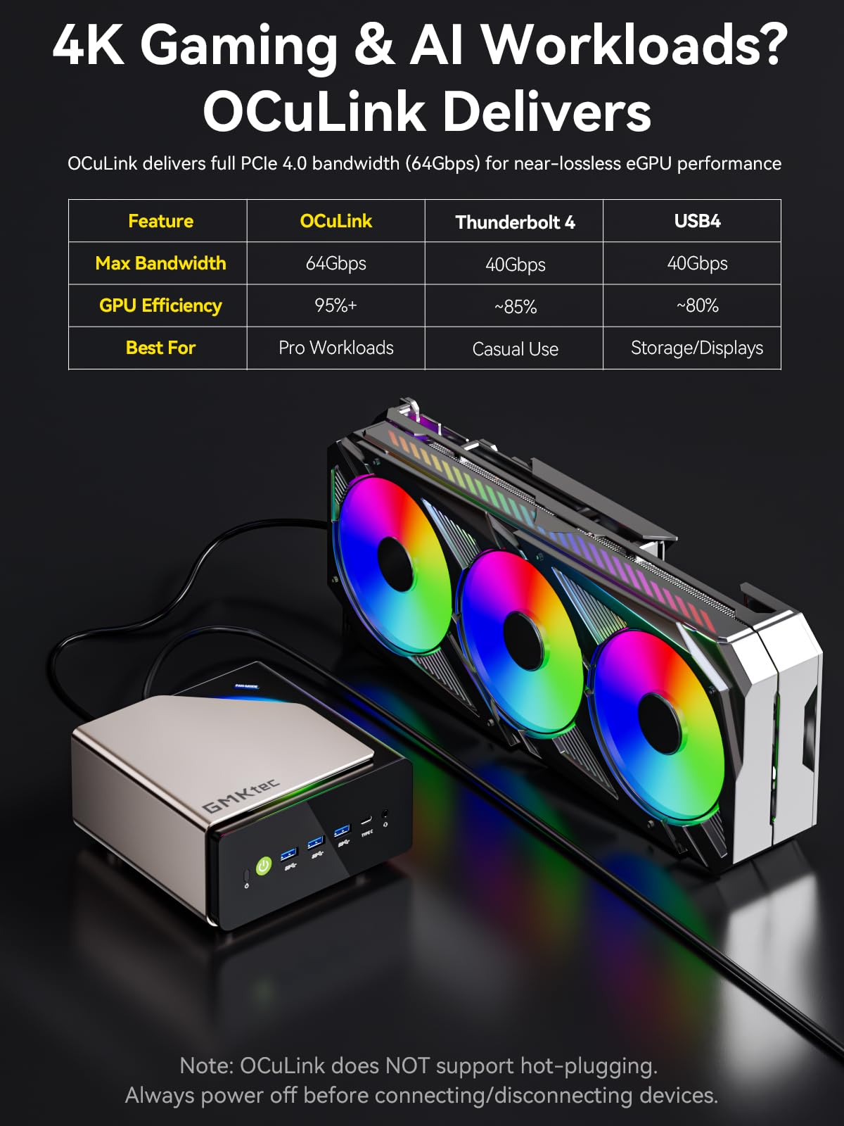 OCULINK PORT - The Oculink port enables higher bandwidth capabilities, better frame rates and lower lag. The standard also operates at PCIe x4 speeds, compared to Thunderbolt's x3. Gamers and content creators can benefit from Oculink's higher bandwidth, resulting in better performance and lower lag for eGPU setups
