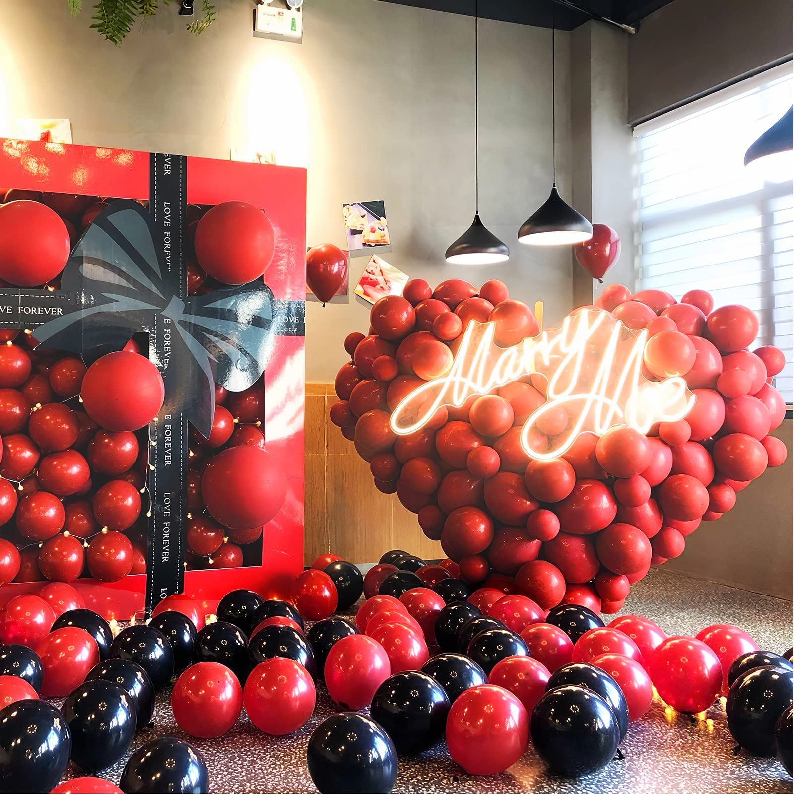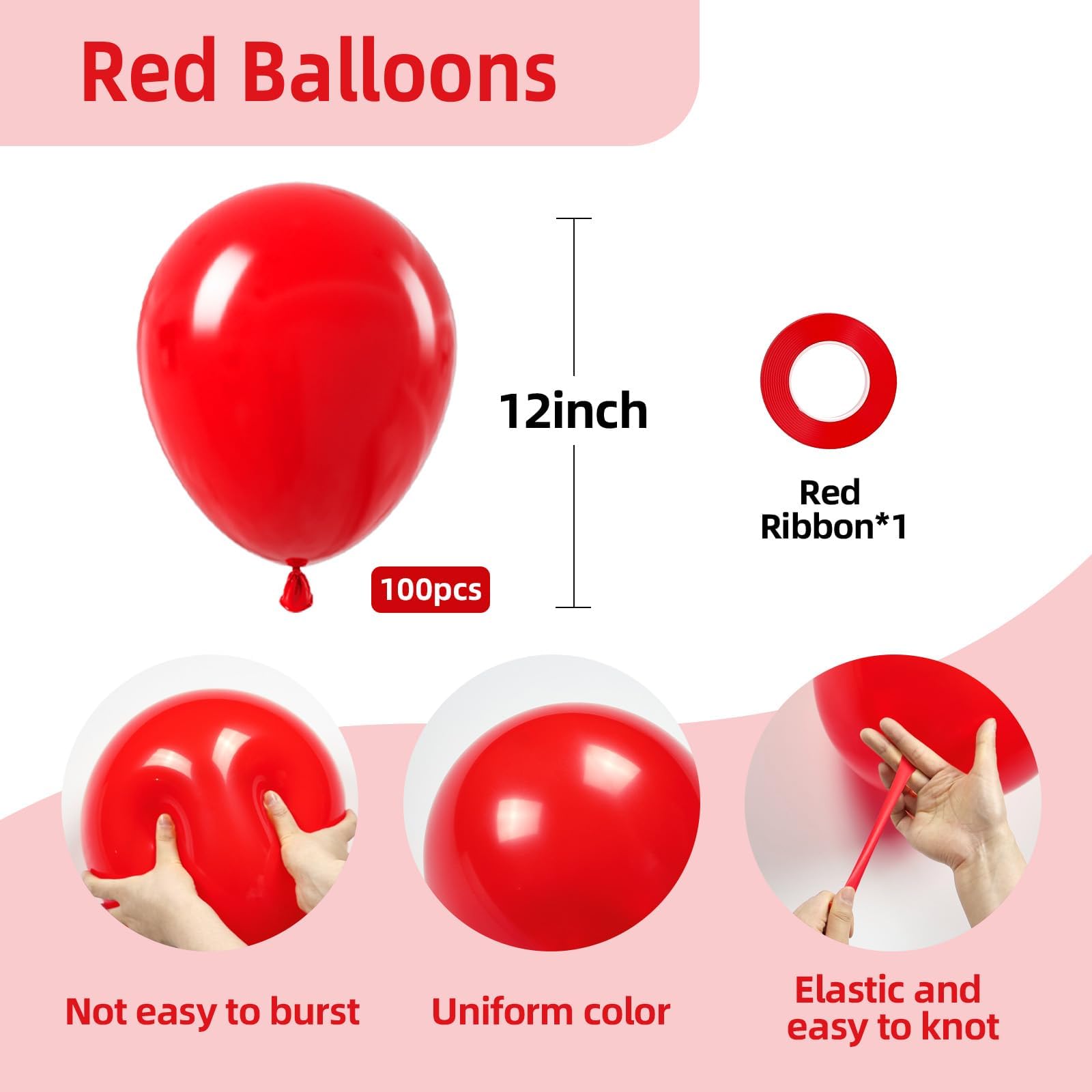 What You Get: 100pcs 12 inch red balloons, 1 roll of red balloon ribbon