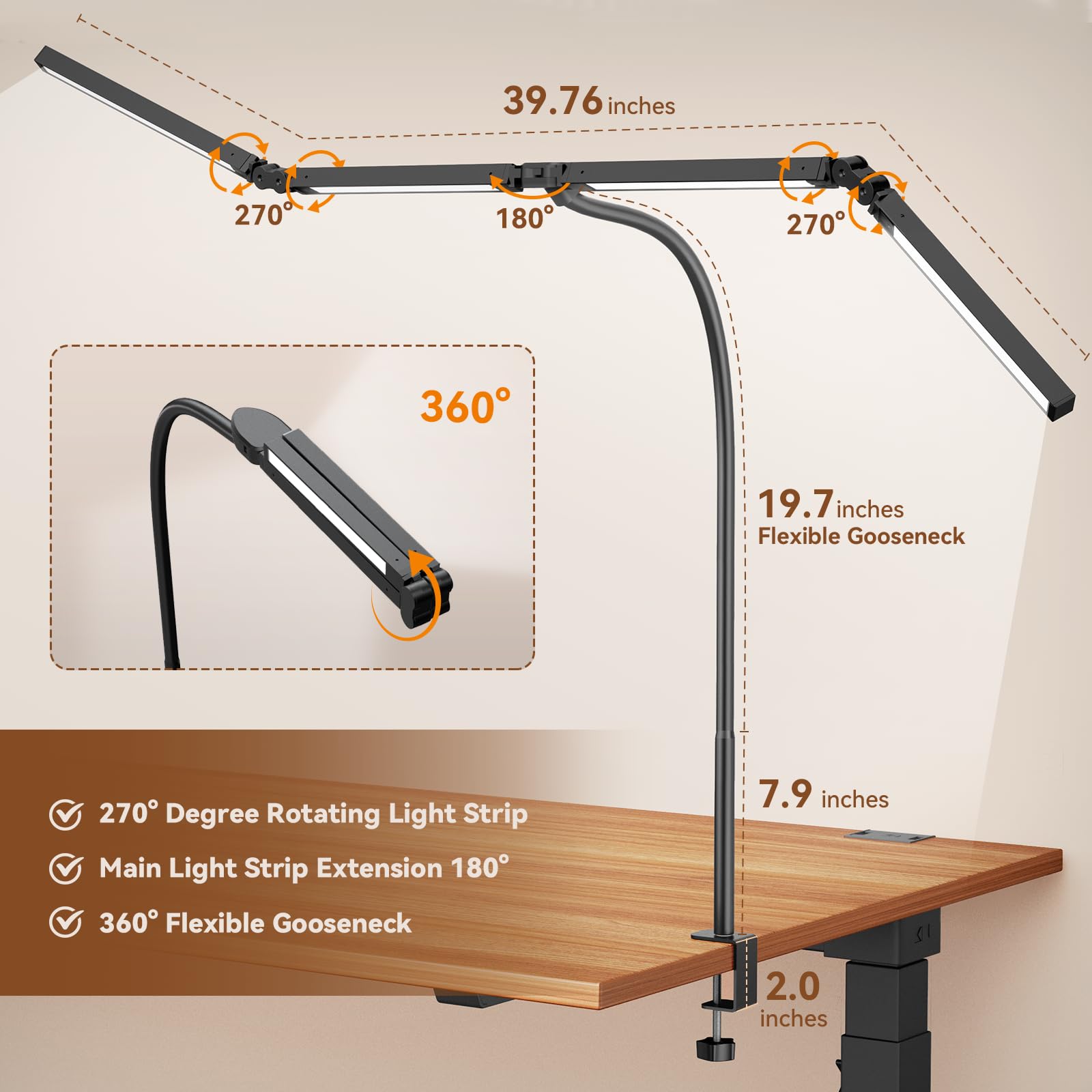 Four Adjustable Lamp Heads: This LED desk lamp features 4 rotating lamp heads with a 360° gooseneck and 270° foldable swing arms, allowing you to adjust the lighting angle and direction to suit your needs.
