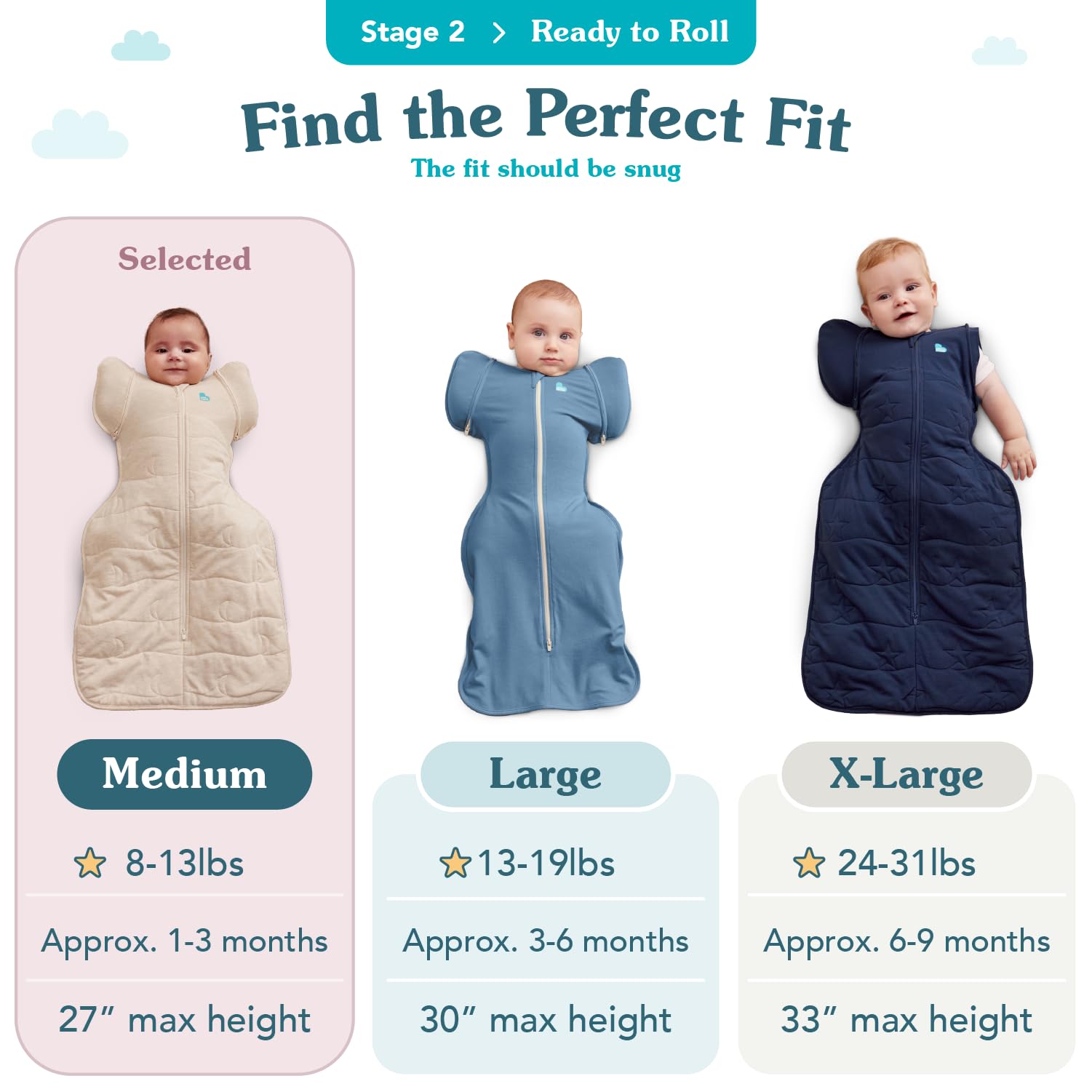 𝐑𝐈𝐆𝐇𝐓 𝐒𝐈𝐙𝐄 = 𝐁𝐄𝐓𝐓𝐄𝐑 𝐒𝐋𝐄𝐄𝐏: Choose the SIZE M (MEDIUM) Baby transition bag made for 13 – 19 lbs. Tap the size chart to confirm weight and height, then buy with confidence. The right weight based fit keeps this arms up newborn swaddle snug at the shoulders while hips stay free, stops fabric creeping over faces, reduces returns, and lets every tired parent enjoy longer, comfortable sleep night after night