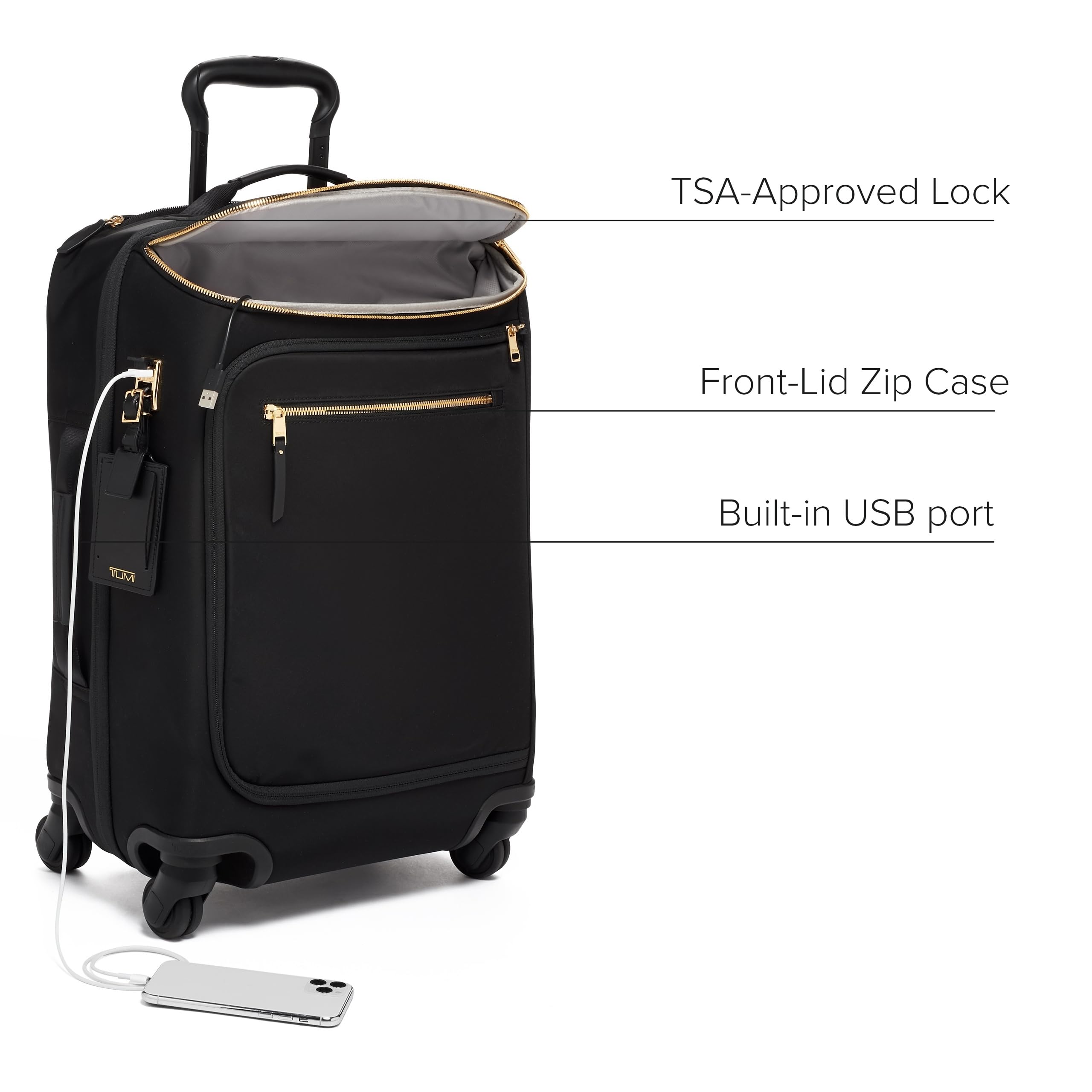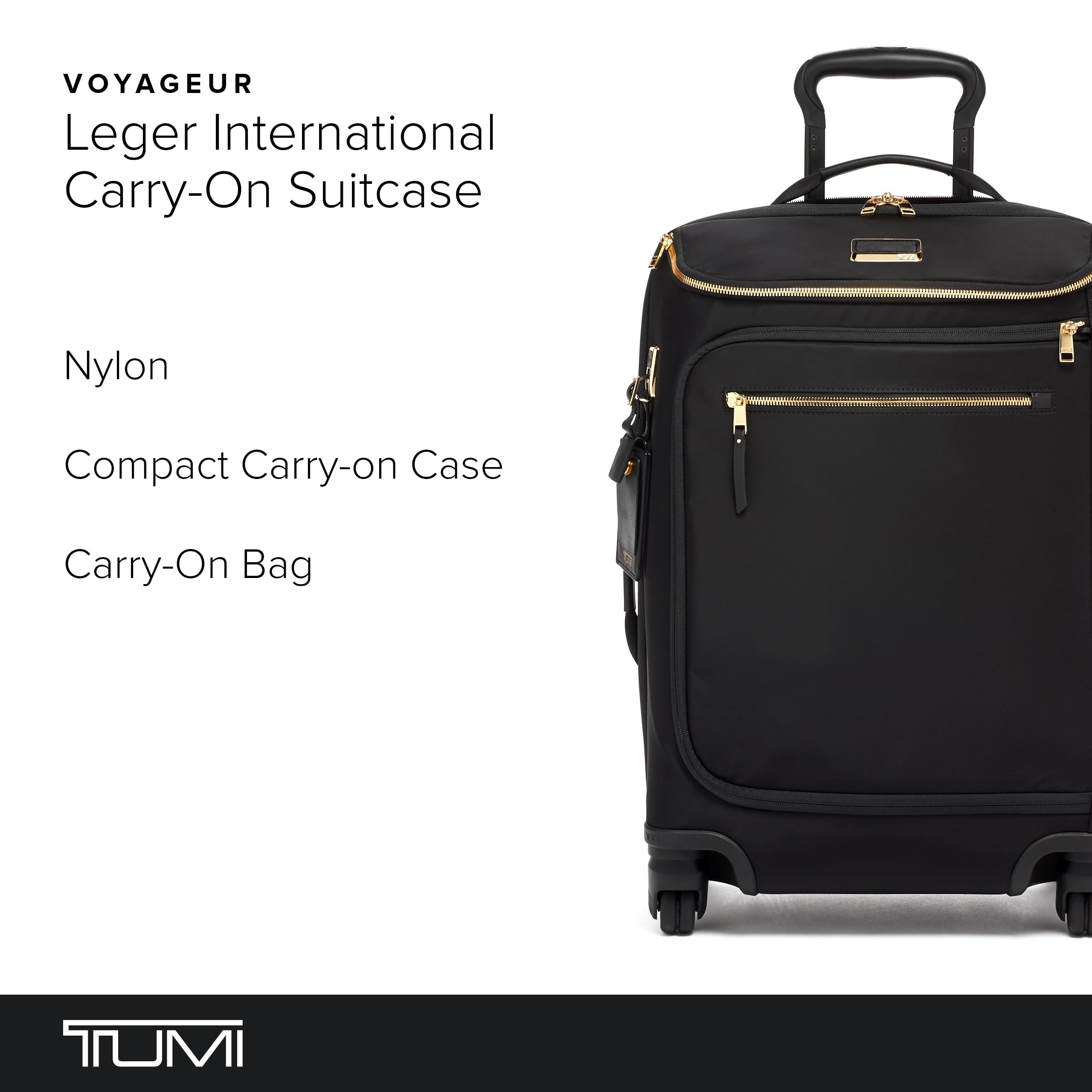 Description The Tumi Voyageur Leger International Carry-On has a split case zip entry and interior pockets to carry all your essentials. Front-lid or split-case zip entry to main compartment. Exterior features: built-in USB port, front top-zip compartment (houses USB cable), front straight-zip pocket, front U-zip pocket accesses front lid compartment. Interior features: zip lid pocket, zip section divider with pocket, media pocket, compression straps. 3-stage telescoping handle. Constructed with nylon materials.