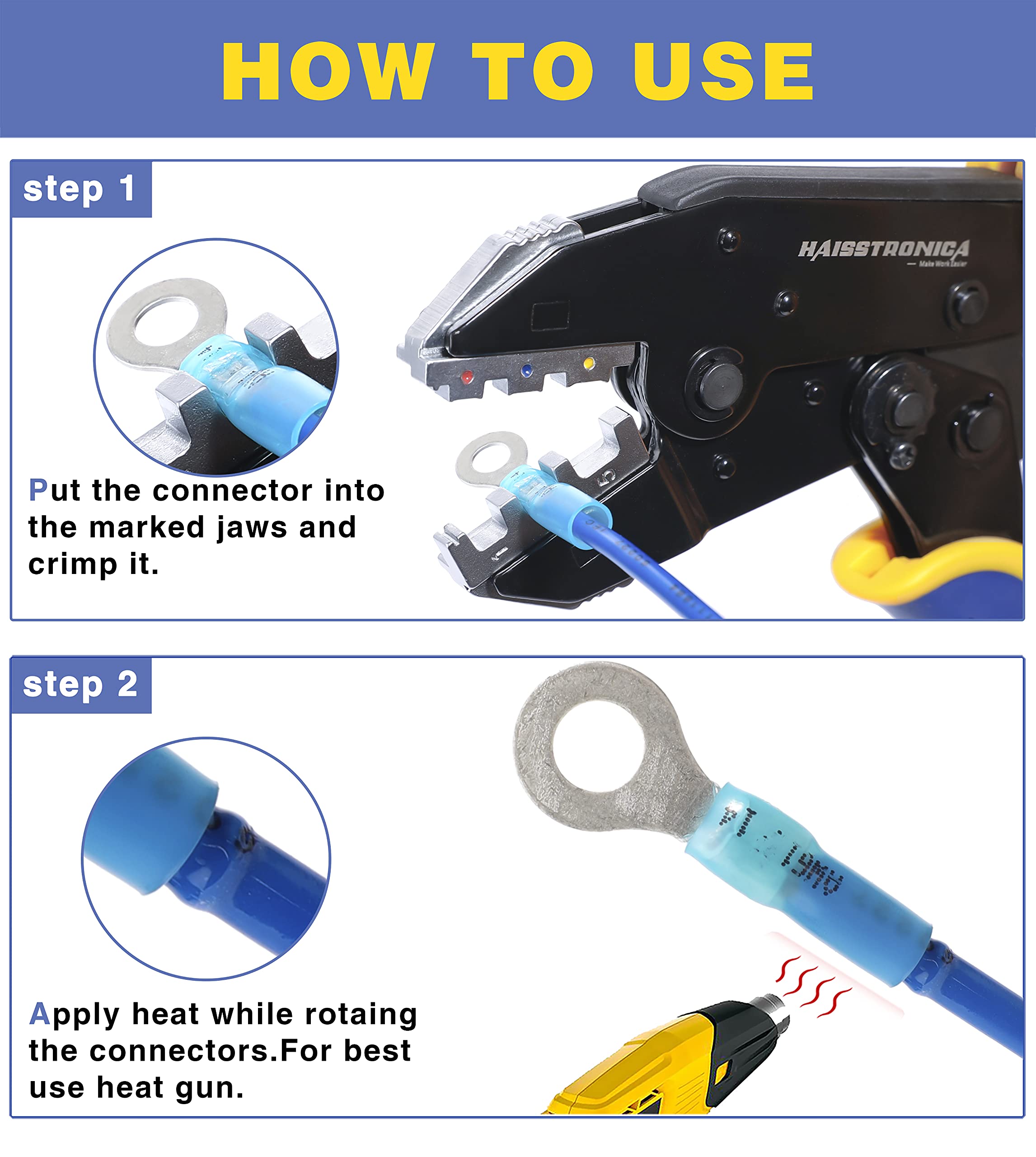 Live Without Limits:Don't be held back by a humble looking wire connectors.Haisstronica heat shrink connectors are made of tinned copper.The tinning process is designed to effectively prevent copper from being oxidized and reduce resistance.While higher purity copper enhances electrical conductivity