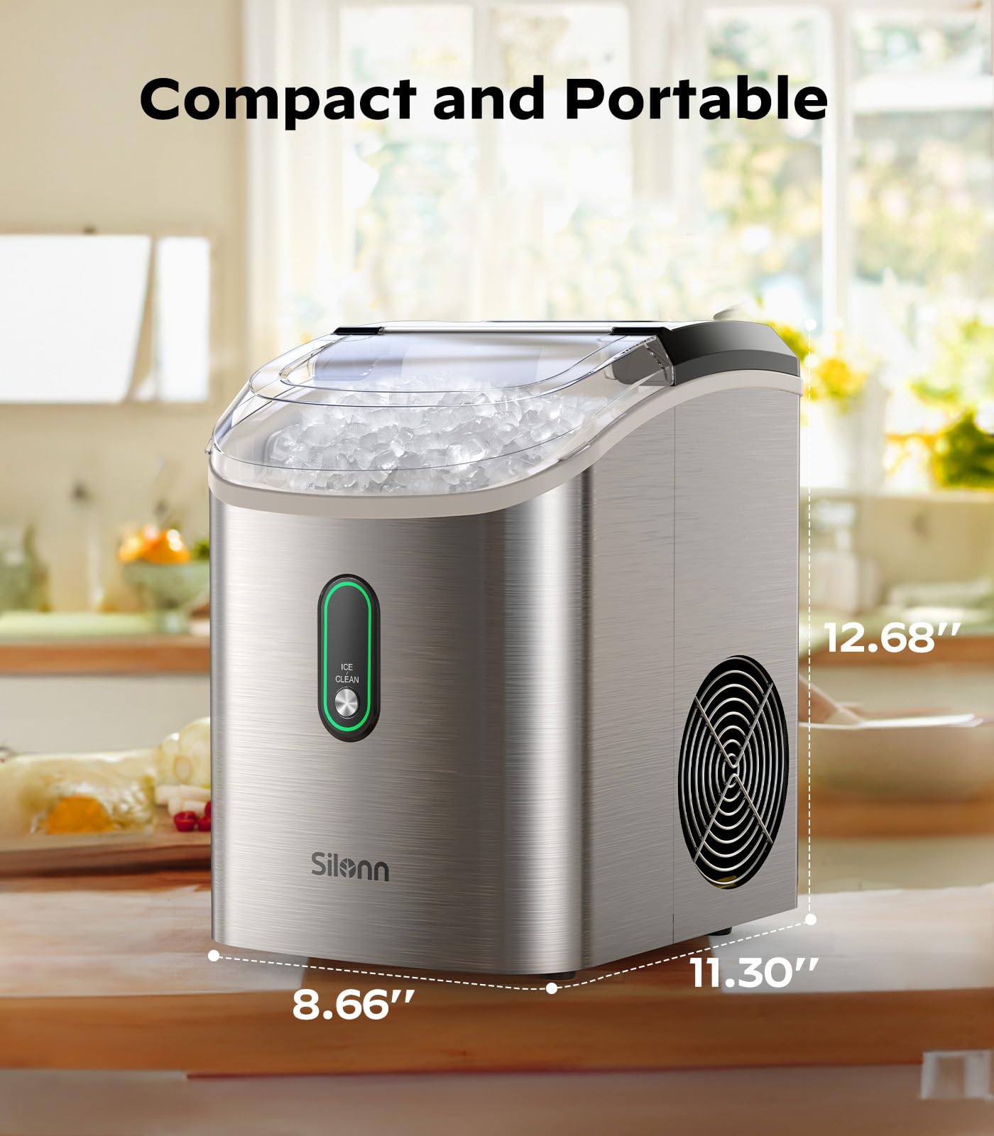 Compact and Portable Design: Measuring just 11.3″ W x 8.66″ D x 12.68″ H, our nugget ice maker is compact enough to fit seamlessly on your countertop. Perfect for home, office, or parties, you can easily take Silonn ice maker anywhere to enjoy refreshing frozen treats with friends and family
