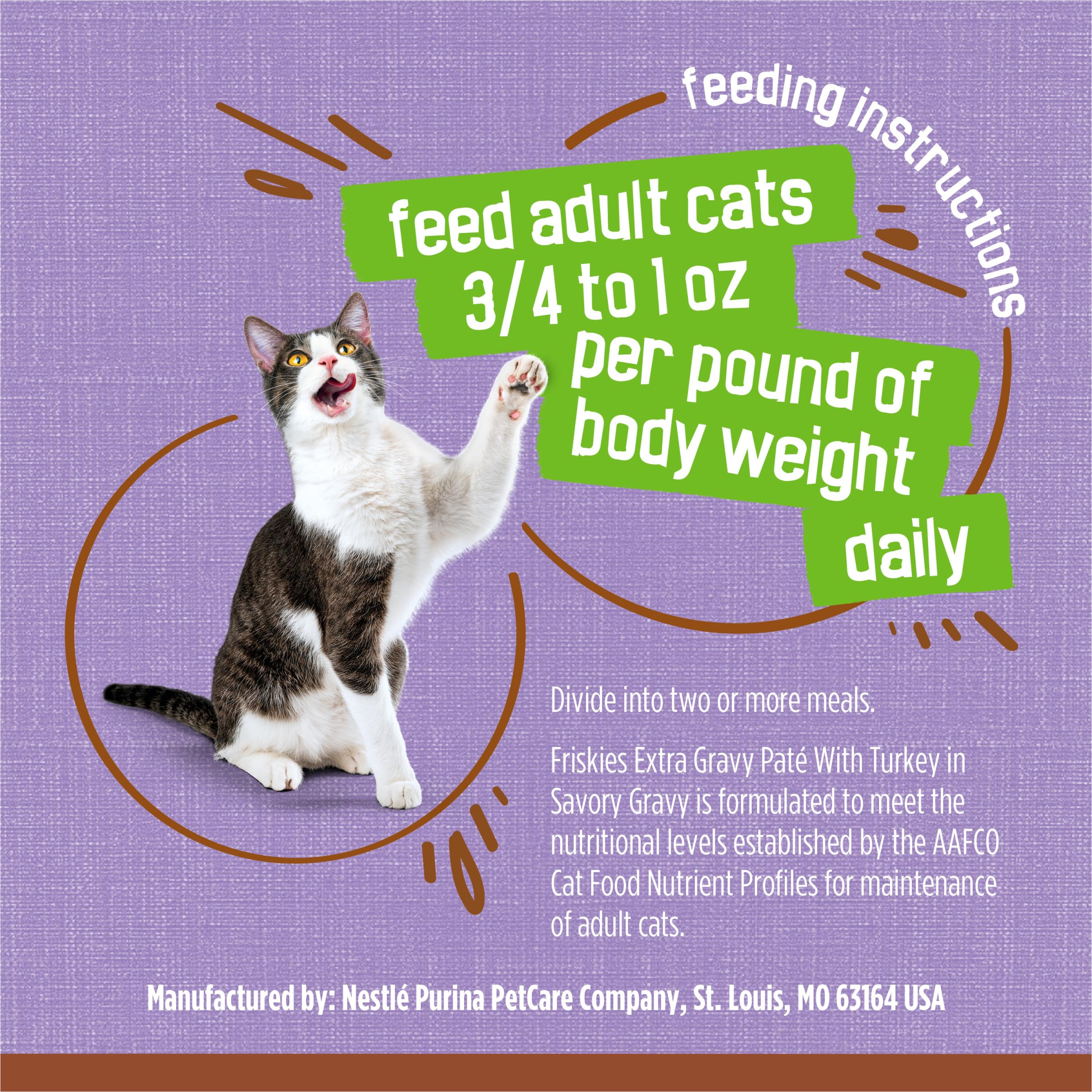 Watch your cat go gravy-crazy at mealtime when you serve up the whisker-licking taste of Purina Friskies Extra Gravy Pate With Turkey in Savory Gravy adult wet cat food. This recipe features a delicious turkey flavor smothered in an extra helping of lickable, lappable gravy for a meal she's sure to savor. Watch your feline friend come bounding to her dish in anticipation of the yummy flavor as soon as you pop open the can and she smells the tempting aroma. The soft pate texture invites her to dig in and lick her way to the bottom of the bowl, giving her plenty of energy to keep up with all her playful pursuits and curious adventures. Indulge your quirky cat with a scrumptious, gravy-licious meal when you serve this Purina Friskies wet cat food recipe, and show her just how much you appreciate the fun and happiness she brings to your life every day. Show your cat just how much you love her with an order of Purina Friskies Extra Gravy Pate With Turkey in Savory Gravy wet cat food today.