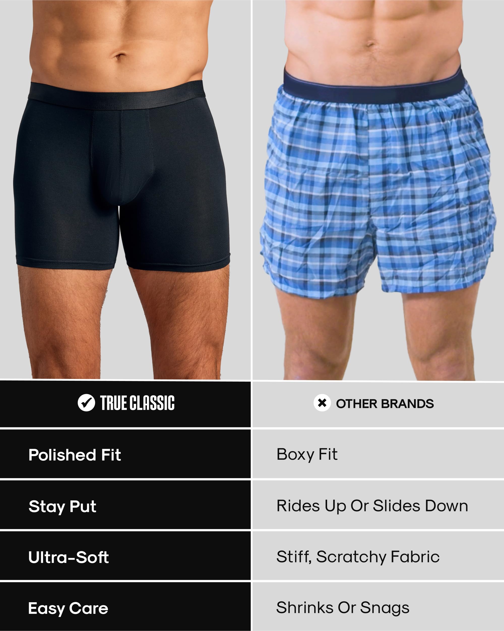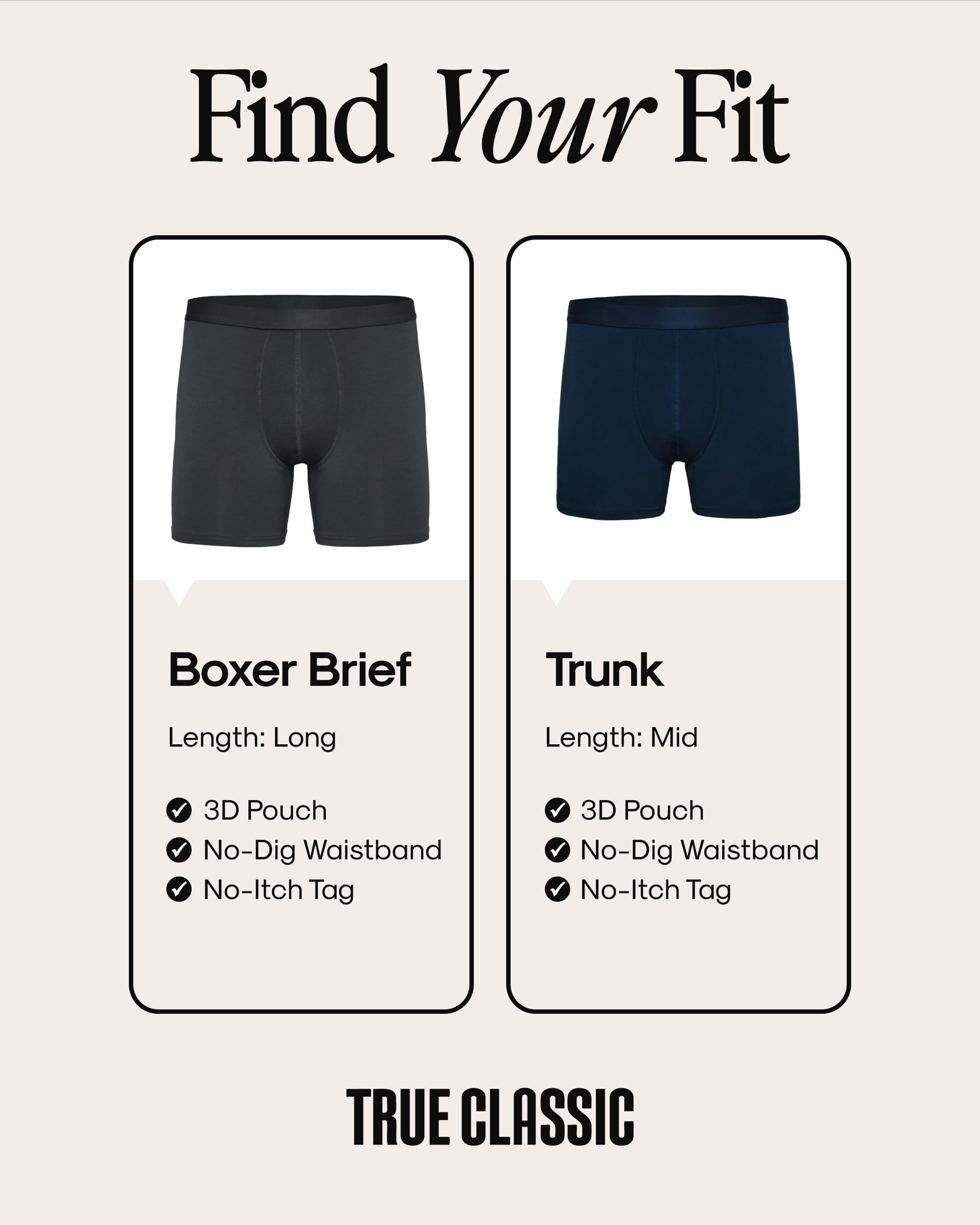 YOUR LENGTH, YOUR STYLE: Choose 6β inseam for extended coverage (boxer brief) or 4β inseam for a modern trunk. Our logo men's boxer briefs feature the True Classic waistband. Our mens boxers come in Black, Carbon, and Navy, sizes S-3XL.