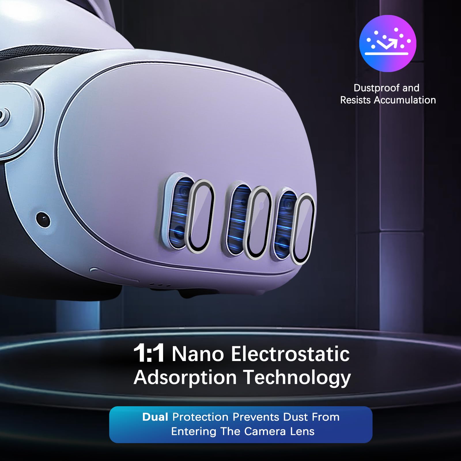 【Powerful Adsorption】Enhanced Nano-static adsorption technology makes oculus quest 3 camera lens protector effectively adsorb on the lens, tightly protects it and not easy to detach, The surface is plated with anti-fingerprint barrier technology to prevent fingerprints, sweat and grease residue.