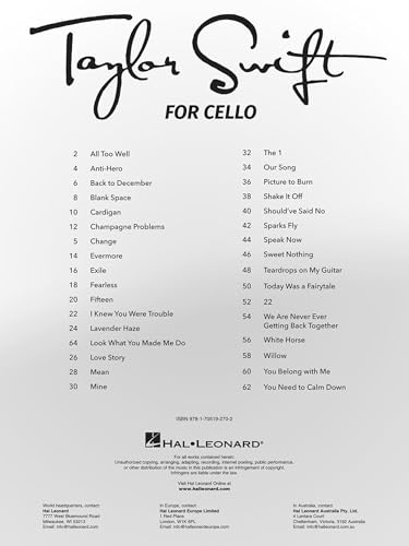 (Instrumental Folio). This collection lets instrumentalists play 33 of Taylor Swift's most popular songs, including: All Too Well * Anti-Hero * Blank Space * Cardigan * Fearless * Fifteen * Lavender Haze * Love Story * Mean * The 1 * Picture to Burn * Shake It Off * Speak Now * Teardrops on My Guitar * 22 * We Are Never Ever Getting Back Together * Willow * You Belong with Me * You Need to Calm Down * and more.
