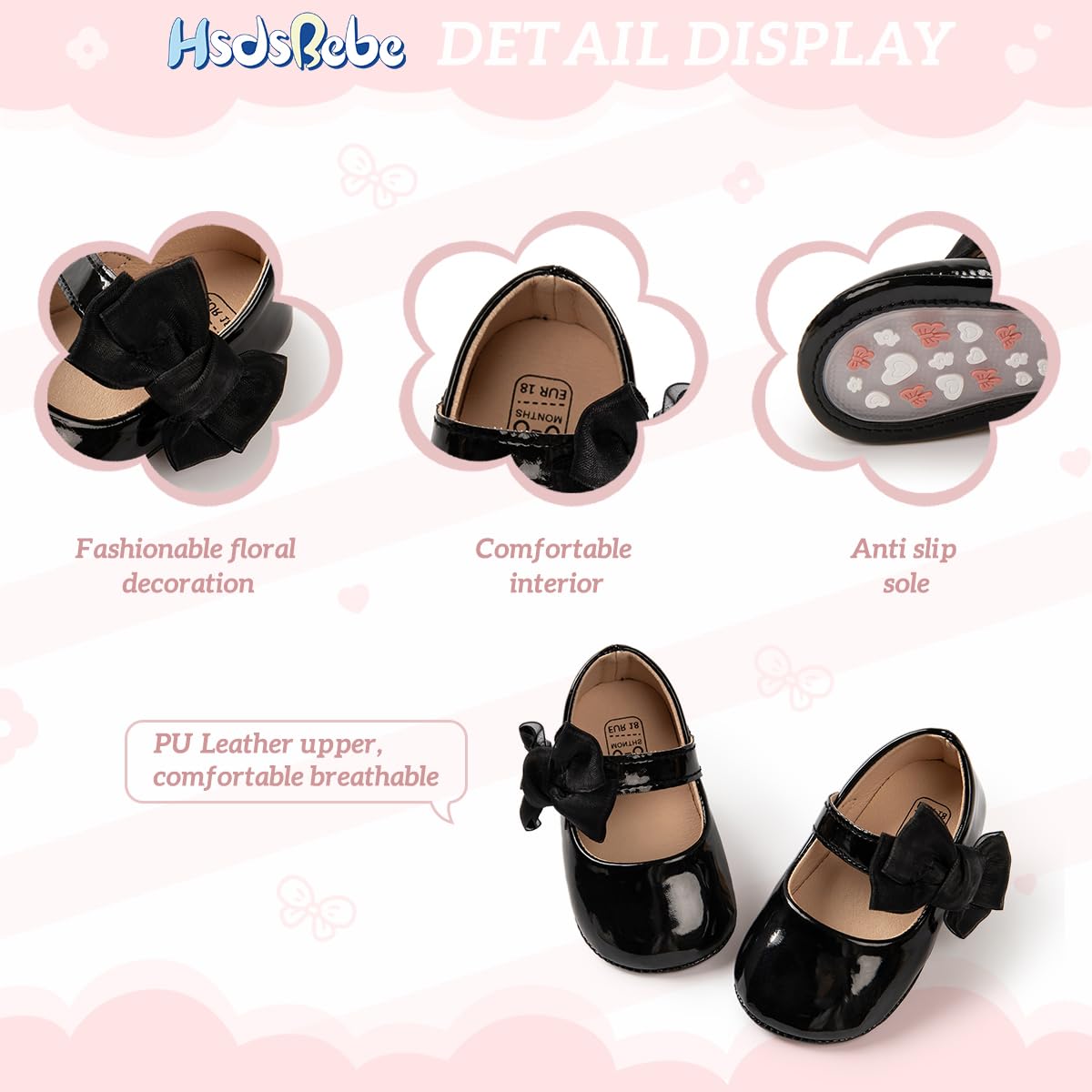 Material: PU Leather upper,breathable cotton lining.Anti-skid bottom.Which is good for baby's feet to Learning walking.Very soft material and rubber soles makes it easier to walk in on hard surfaces.No Any Stimulation to the Skin of Baby's Feet