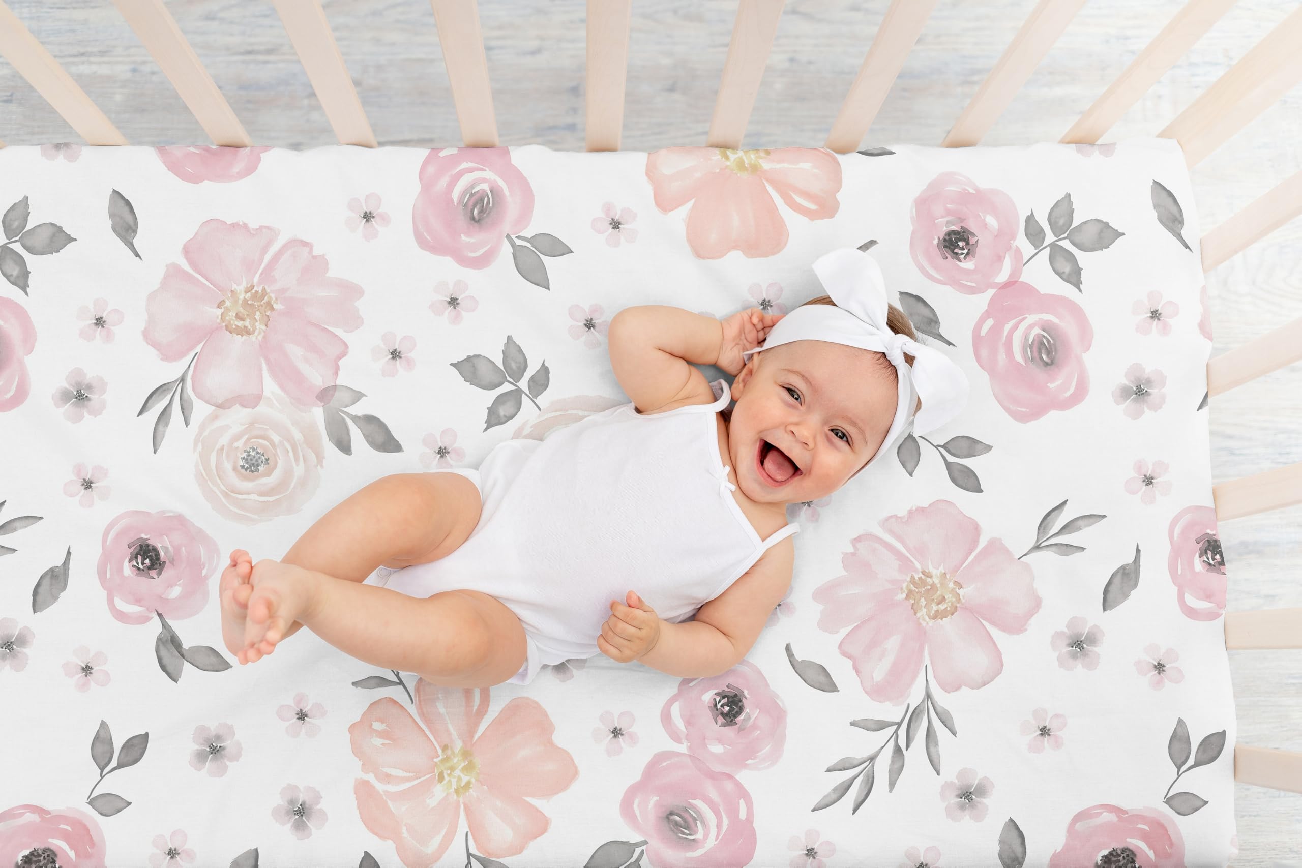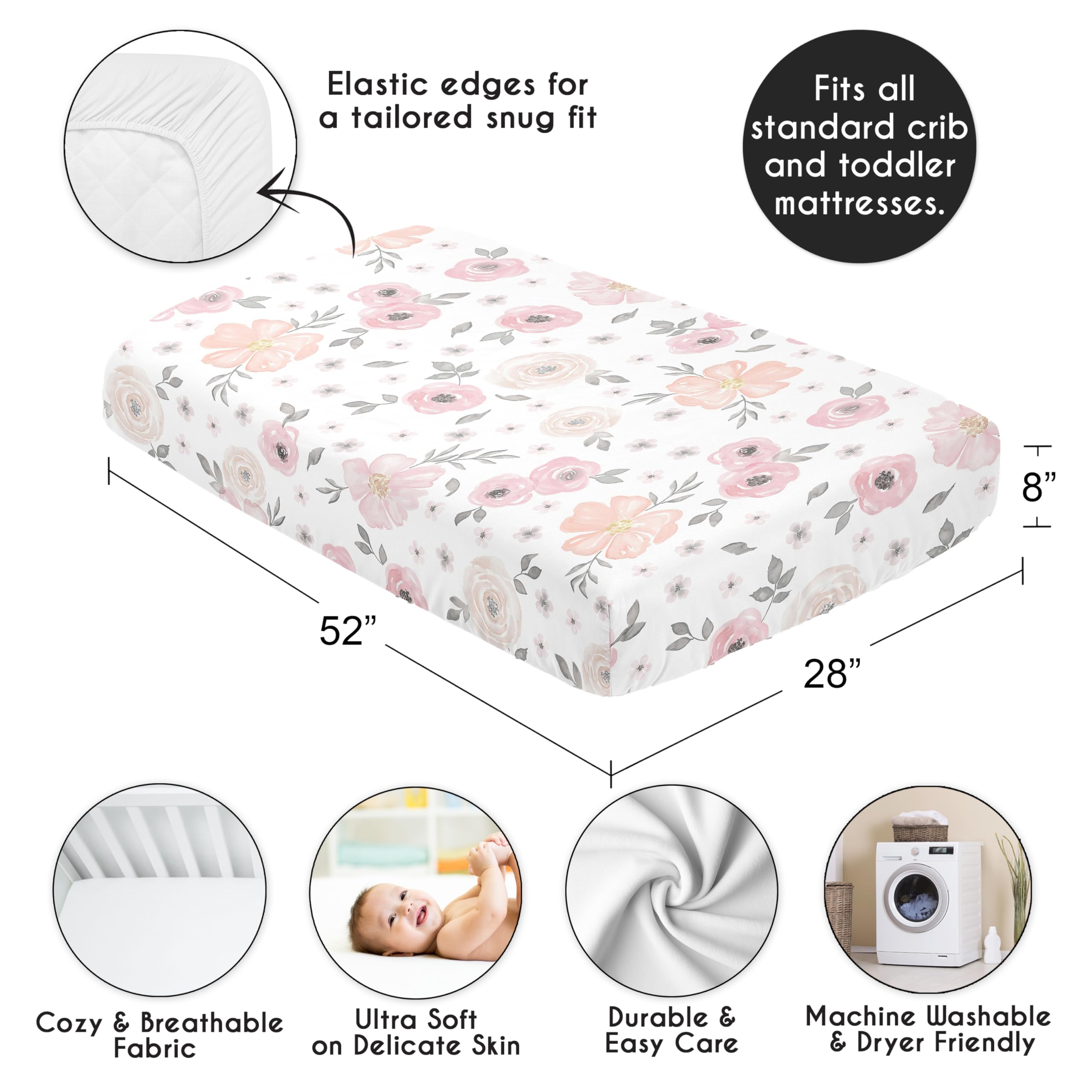 SNUG FIT: Includes (1) Fitted Crib Sheet 52in. x 28in. x 8in. Our newborn standard crib sheets fit snugly, with premium elastic sewn around the entire bottom edge for a secure fit on most standard sized cribs and toddler beds, to reduce shifting and bunching. This brushed microfiber crib sheet features an exclusive design of a blush pink, grey & white boho, garden, watercolor floral, shabby chic, leaf, wildflower, flower print & is gentle on delicate skin to foster a soothing sleep environment.