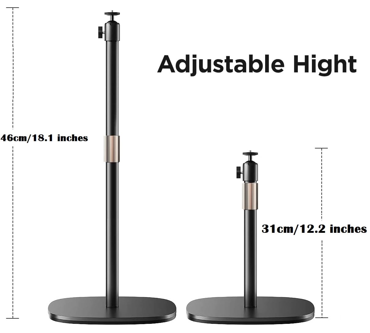 Product Total Height with ball-head adapter : 46cm/18 inches; Metal Base Dock diameter 22cm/8.66 inches; 2 Sections Folding Pole can easy to adjust height for your purpose;Product total weight 2.7 lbs to Stabilized support provided,Max load devices weight 2kg/4.4 lbs;