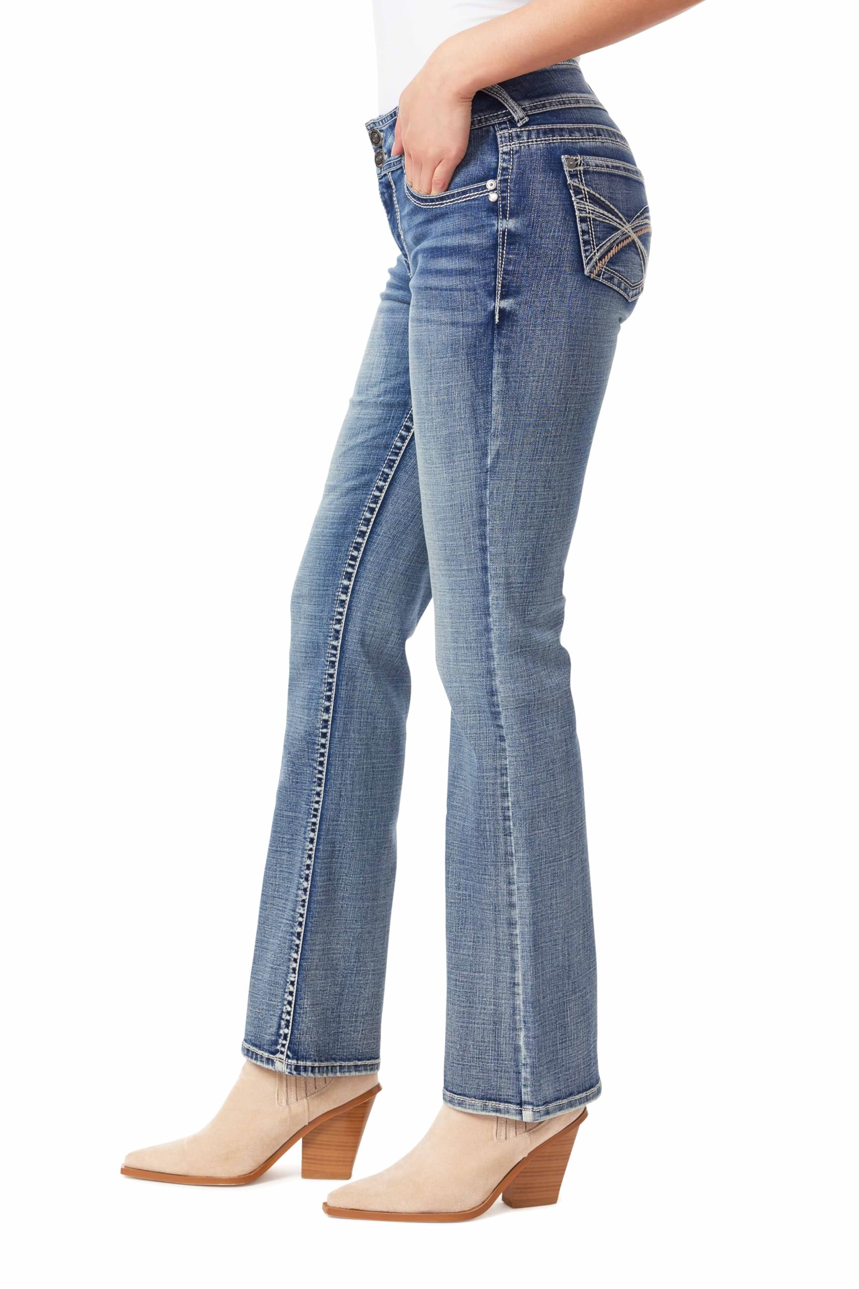 All in the Details - Featuring a classic double-button closure and a perfect kick leg opening, these women's stretch jeans keep you cool and casual. Whether you're on horseback or heading back to school, theyโre perfect for completing your 90s, Y2K, festival, or everyday looks