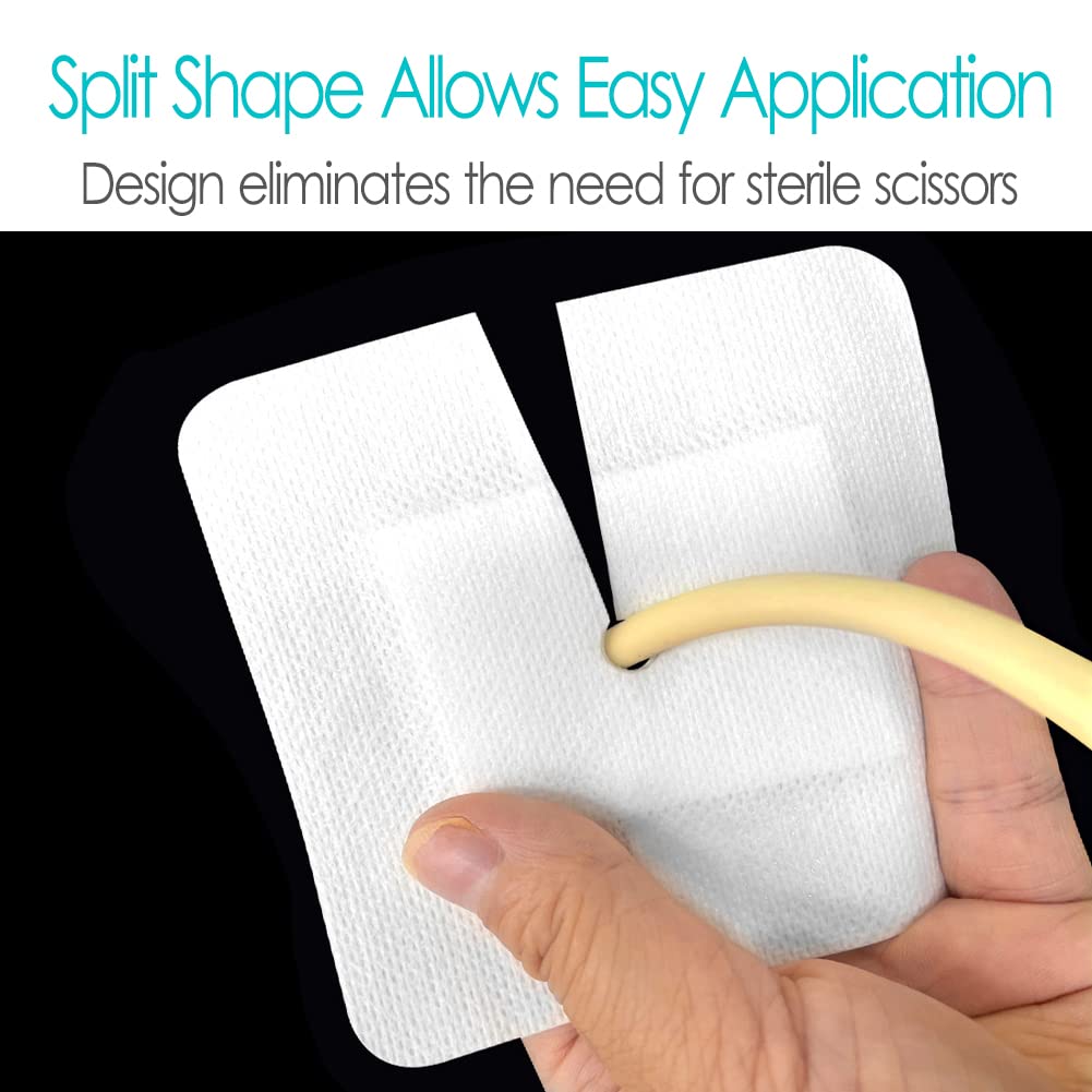 MULTIFUNCTIONAL SPLIT DRAIN BANDAGES - This island dressing bordered gauze is designed to secure transfer set, provides protective concealment for tube users. Life-saver for active women, men and kids, tube patients, sensitive skin, dialysis, nursing home who need to carry medical supplies such as PEG tube, G tube, J tube, PD catheter, IVs, Tracheostomy, drains and abdominal feeding tube. The wound dressings are for single-use only. Simply peel & stick, and get on with the rest of your day!