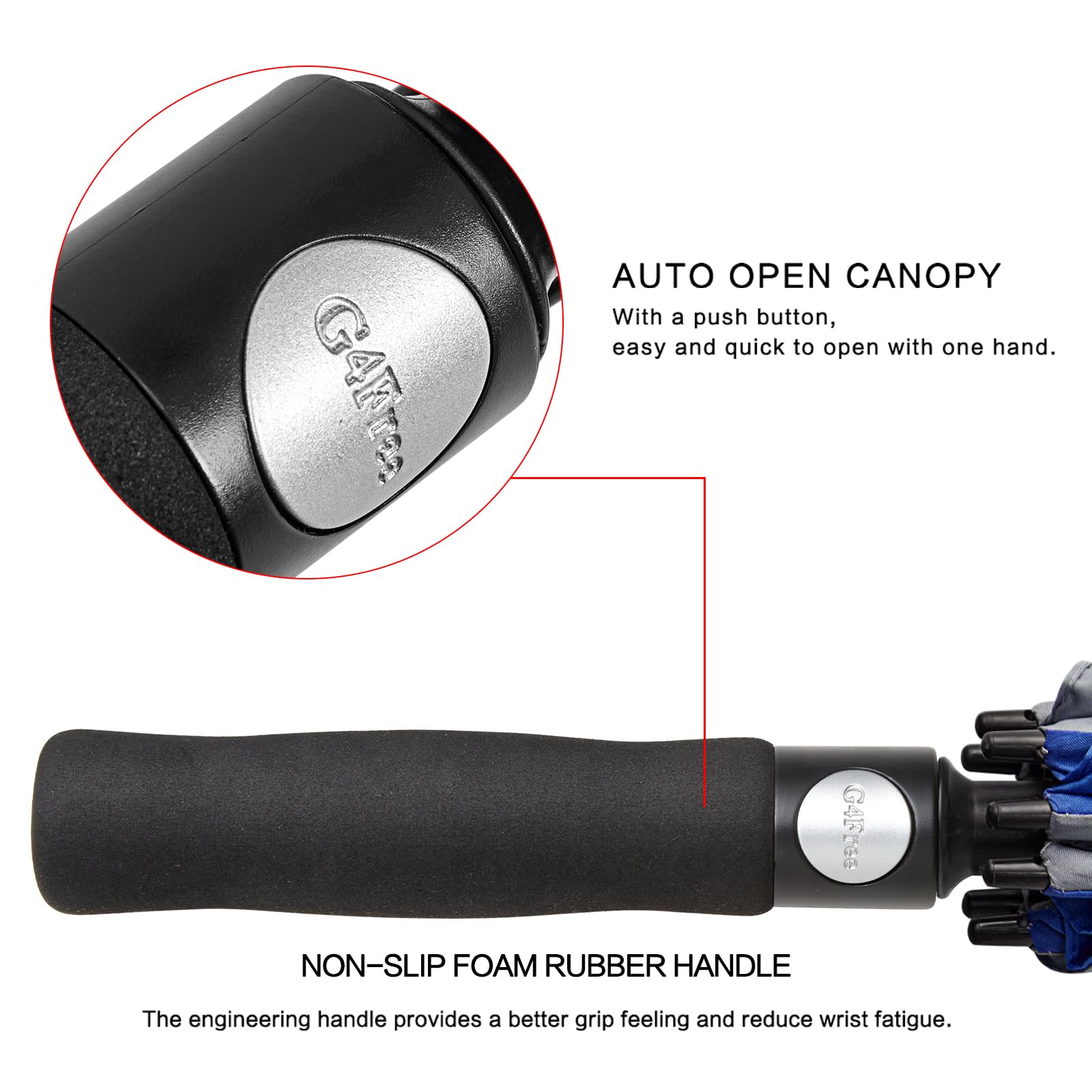 THE ULTIMATE GOLF UMBRELLA With a 47/54/62/68-inch canopy and heavy-duty design, the G4Free Ultimate Golf Umbrella is an ideal companion for golfers, and business professionals, or for daily life. With its sleek all-black design, comfortable EVA grip, sturdy frame, and auto open mechanism, the G4Free Ultimate Golf Umbrellas are perfect in a metropolitan city or a sports field!