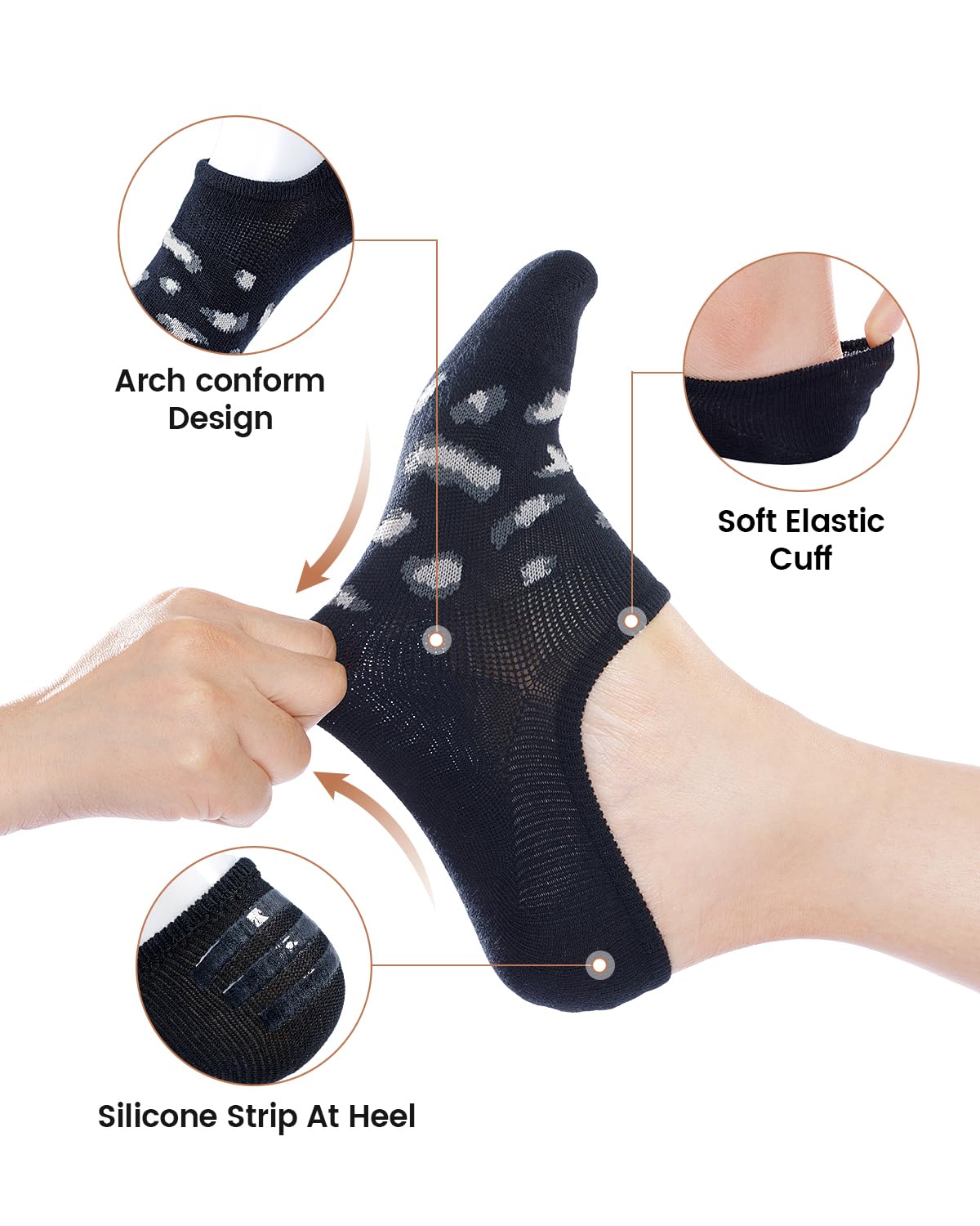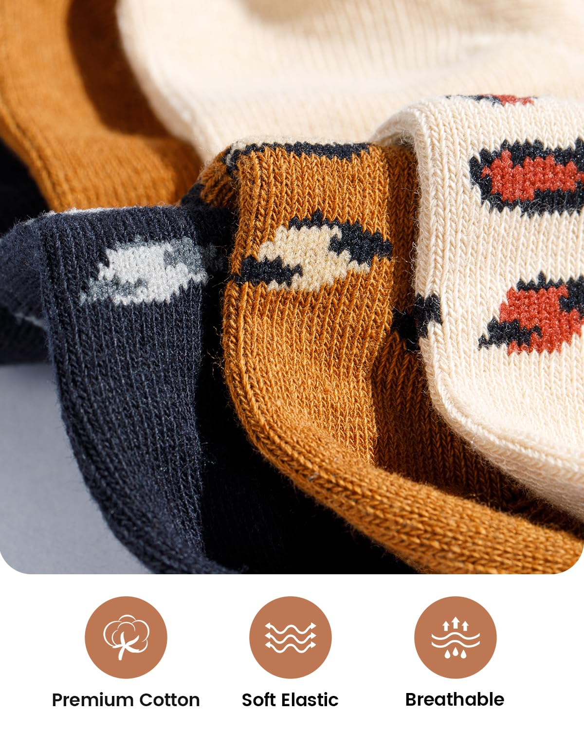 Premium Material for Comfort:Crafted from a blend of soft and breathable fabrics, including cotton, spandex, and polyester. The cotton offers natural breathability, keeping your feet fresh throughout the day. Spandex provides just the right amount of stretch, ensuring a snug fit, while polyester adds sturdiness to withstand daily wear.