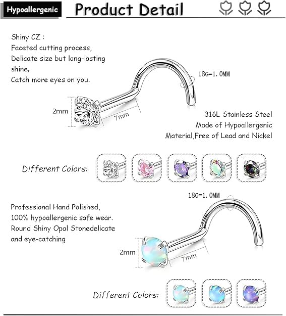 🆕Practical Specifications: The nose studs are 18 gauge (1.0mm) with a 7mm pin length, ensuring a secure fit. Easy to wear and remove, these 18g nose studs are ideal for everyday use or special occasions