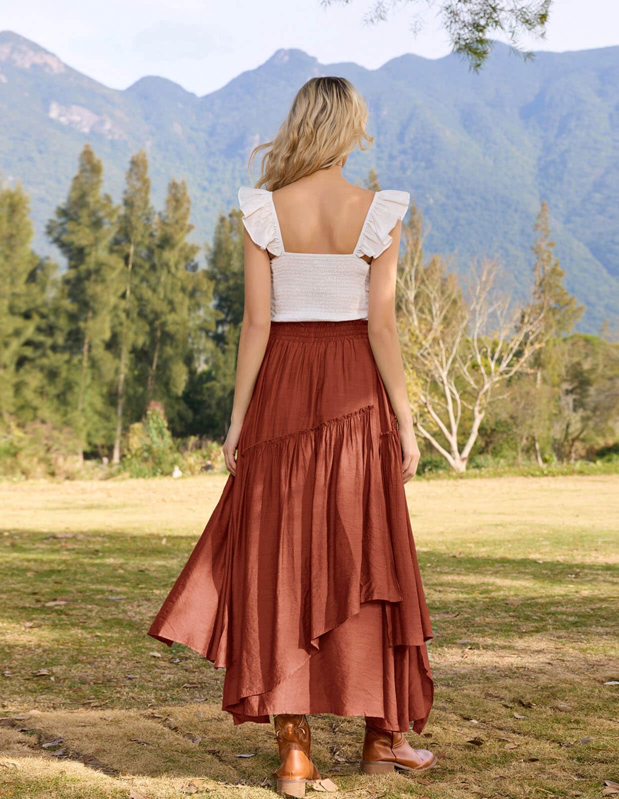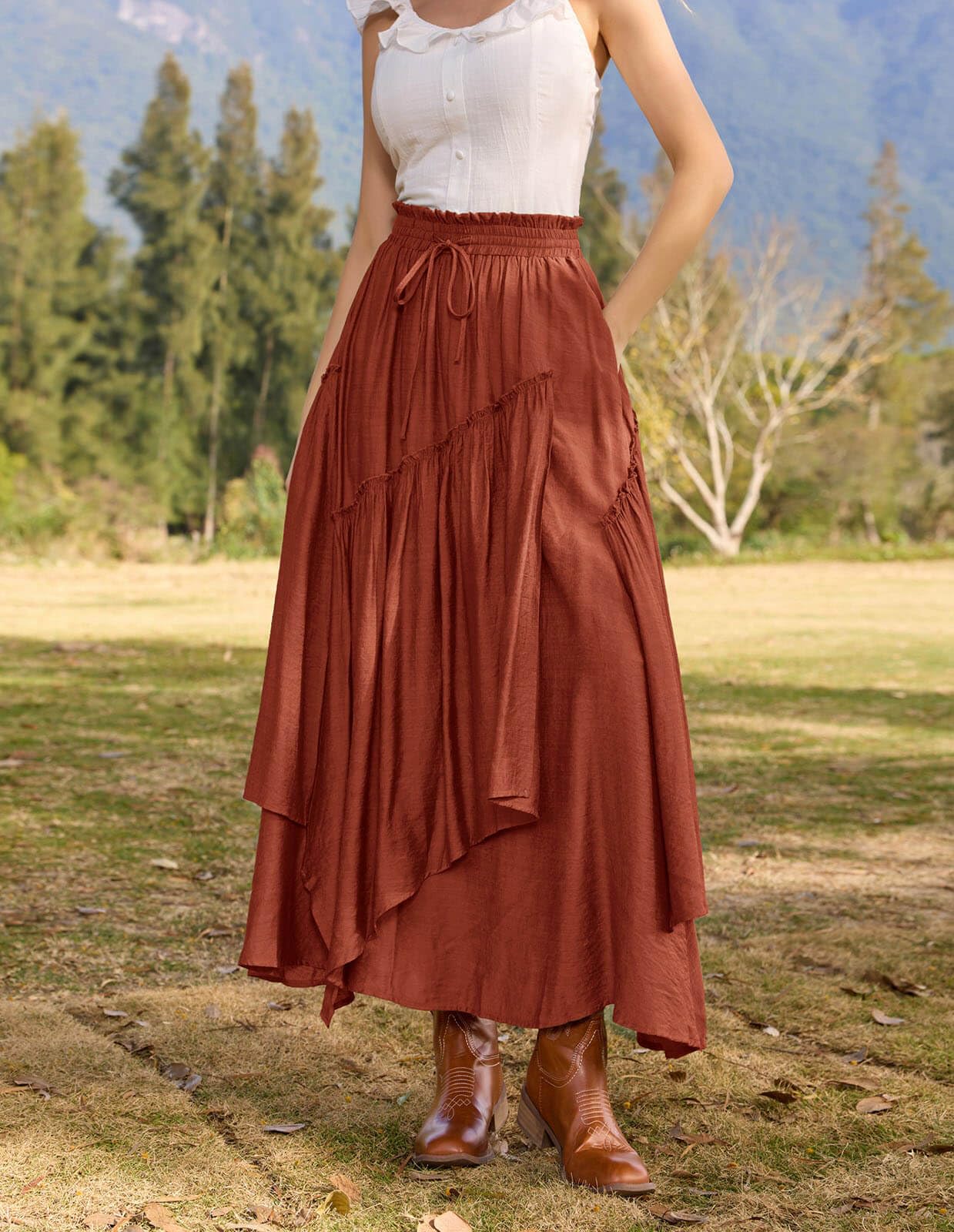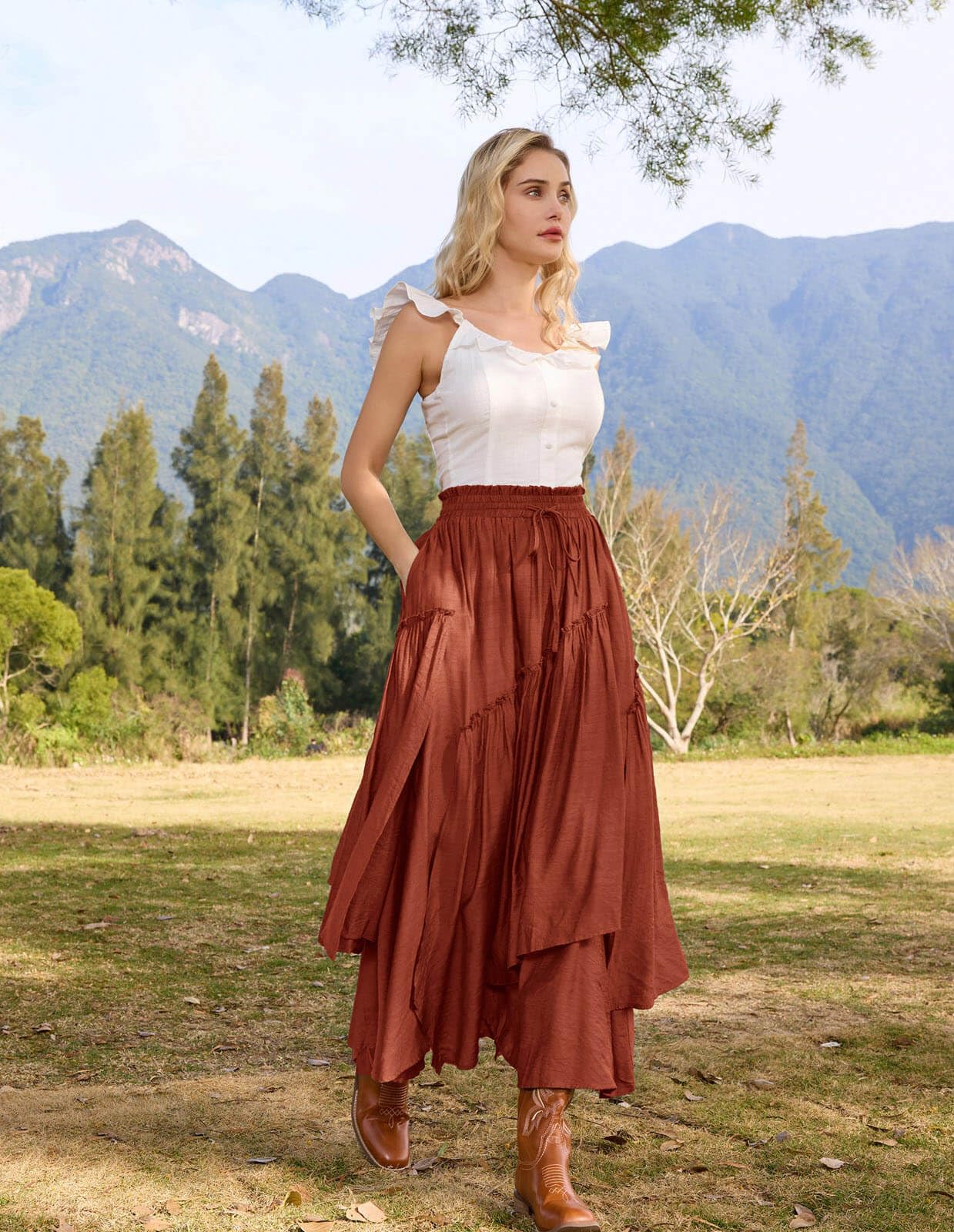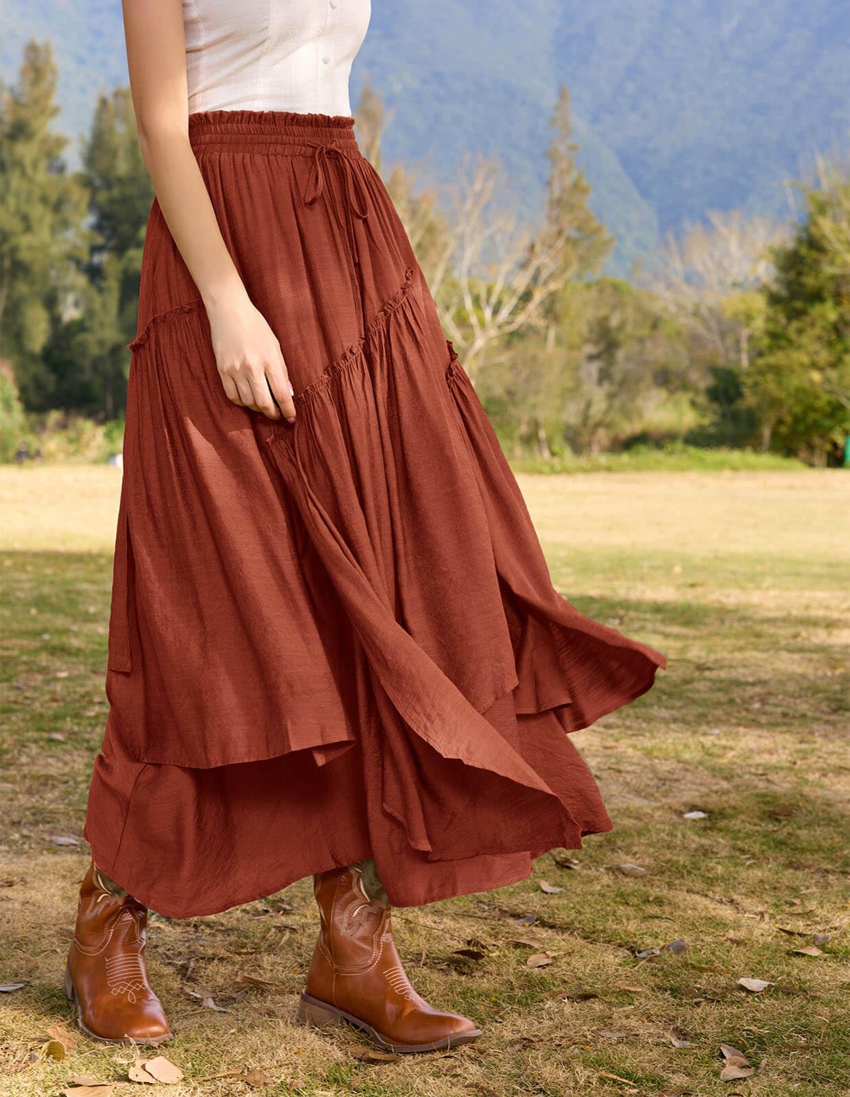 Feature - Designed with side-seam pockets, elastic high waist with drawstring, ankle length flowy a-line hem, slant seam overlay tiered, with lined not see through