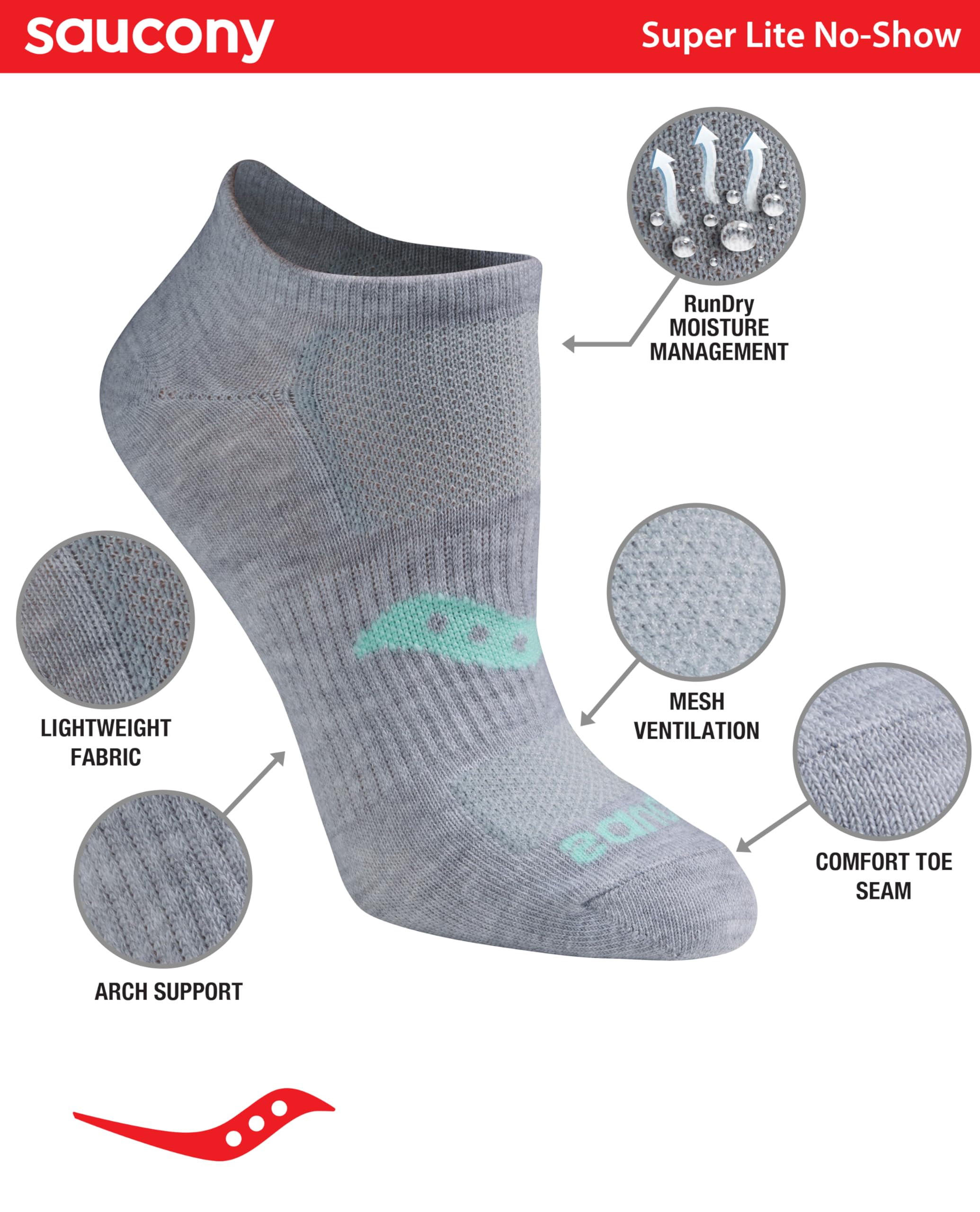 Description Saucony women's performance super lite no show socks is a perfect combination of comfort and support. Great for the toughest training sessions. Features arch support and air mesh venting for lasting comfort. Run for Good - Saucony was founded way back in 1898. Ever since, we have been loyal to the sport, building goodness into every product and inviting millions around the world to run with us. At Saucony, we exist for runners, Runners inspire us, bringing us new idea, force us to be better, they drive our design and engineering. They keep us competitive. They keep us hungry. They keep us honest. This focus and passion fuels us as we strive to create the best running shoes and apparel on the planet. We leave work each day knowing we’ve done everything to make runners live just a little better.