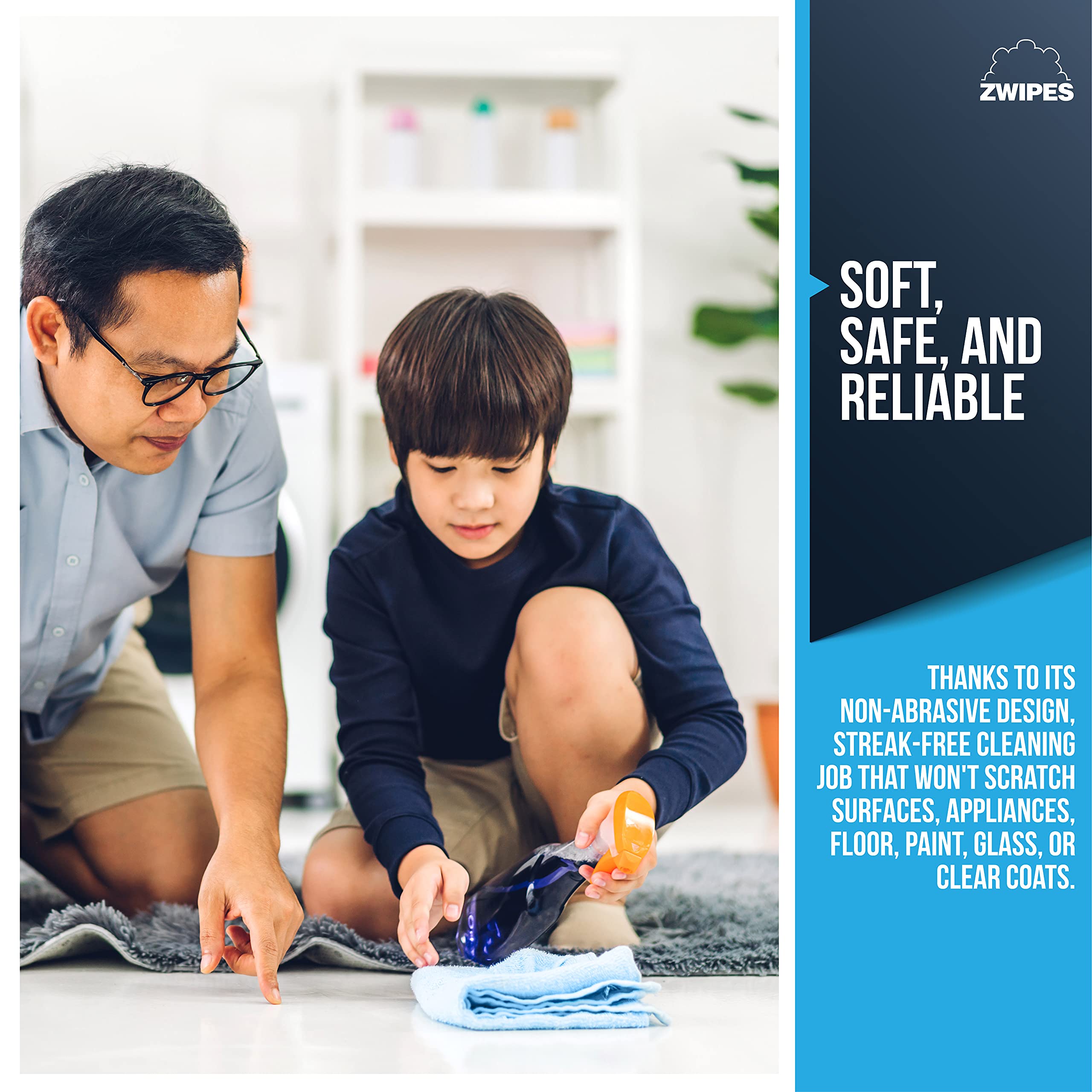 Zwipes are constructed with a super-soft plush microfiber design that safely and effectively cleans surfaces with or without chemical detergents. They hold eight times their weight in liquid, can be washed hundreds of times, and will dry in half the time of ordinary towels. Zwipes are ideal for providing a streak-free, lint-free shine on household and automotive surfaces; and can also easily clean up spills, grease, oil and more. Each cloth measures 12" x 16".