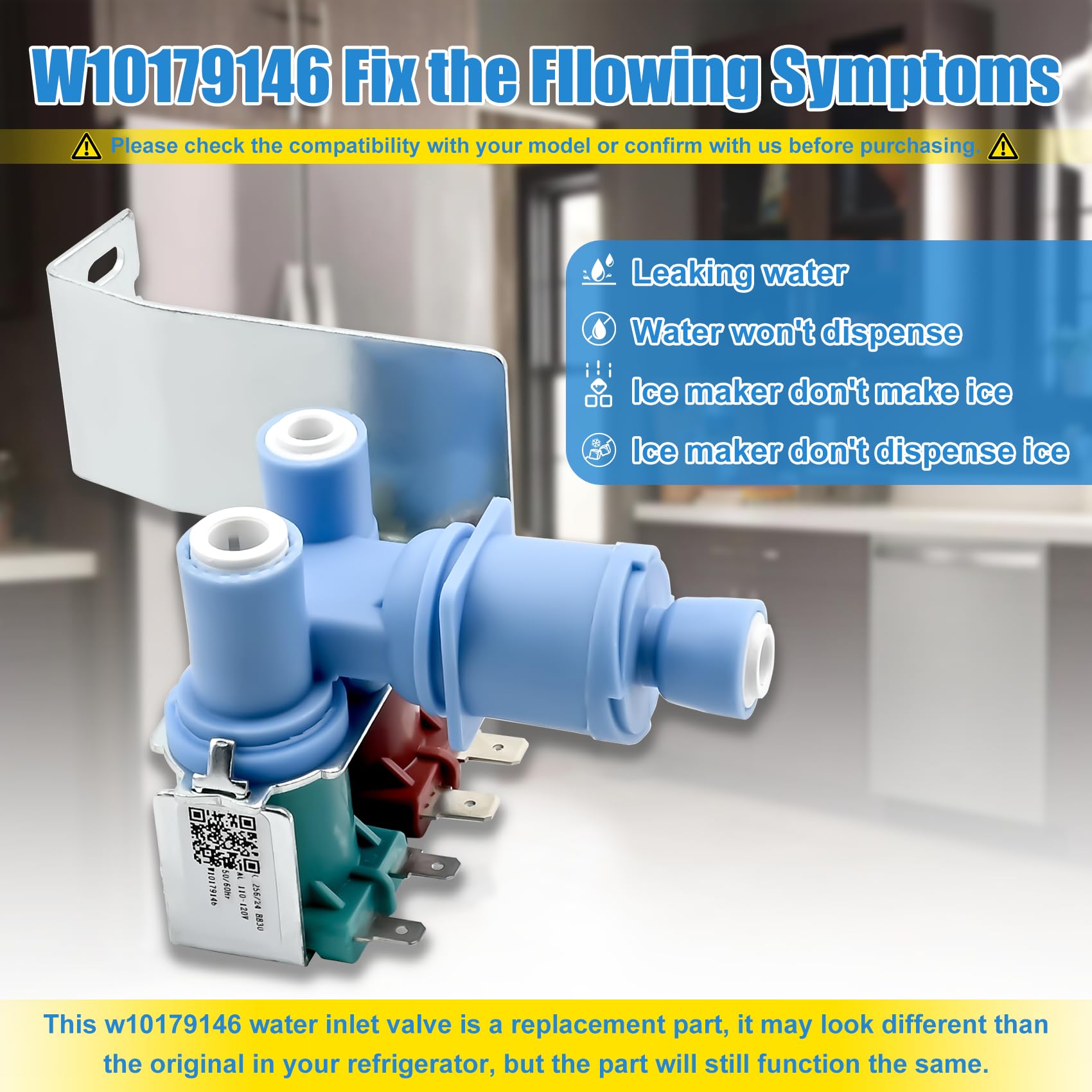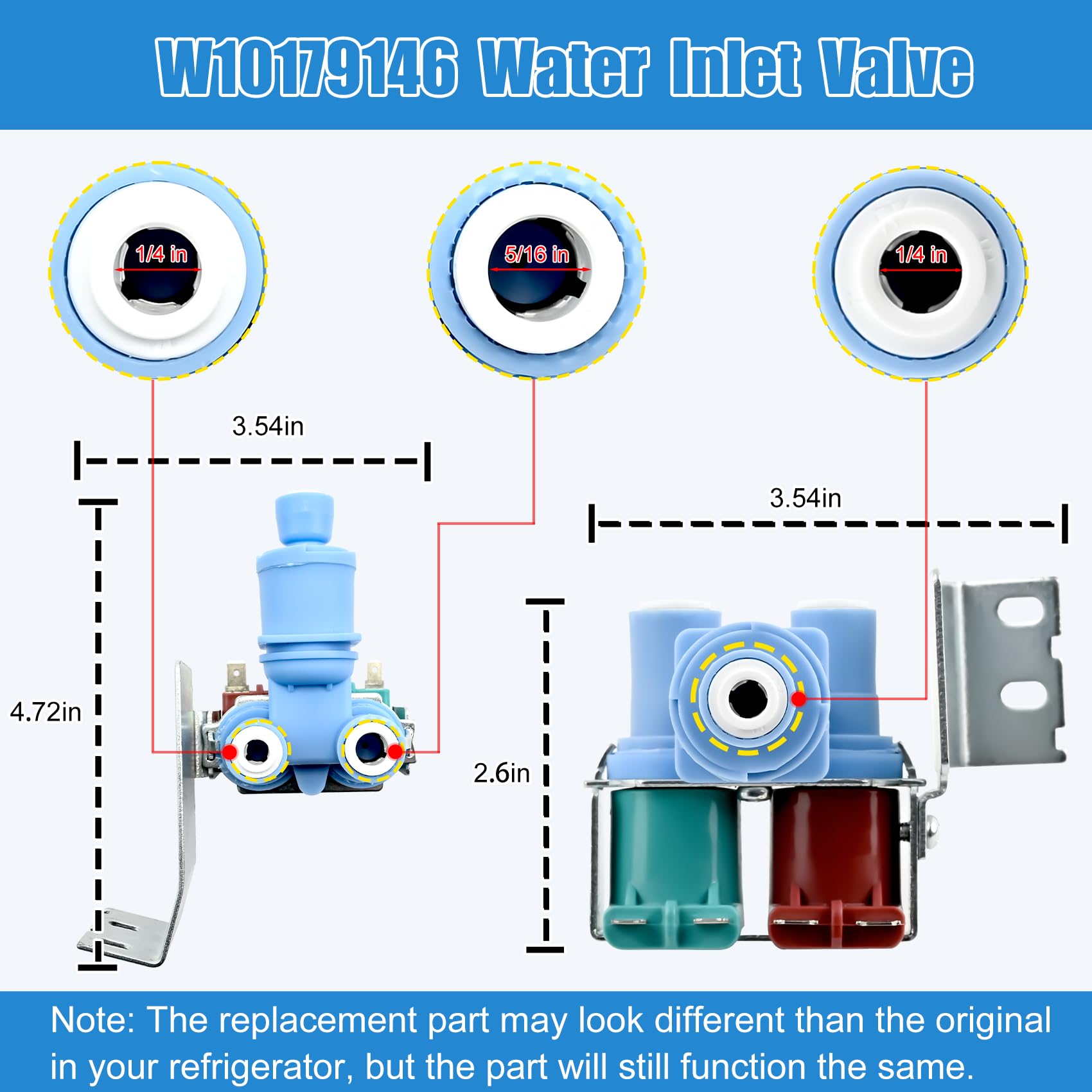 【Purchase Notes】This w10179146 water inlet valve is a replacement part, it may look different than the original in your refrigerator, but the part will still function the same. NOTE: It is NOT W10408179 and the refrigerator models they fit are not compatible. Some parts may look the same, but there may be small variations in size and installation.