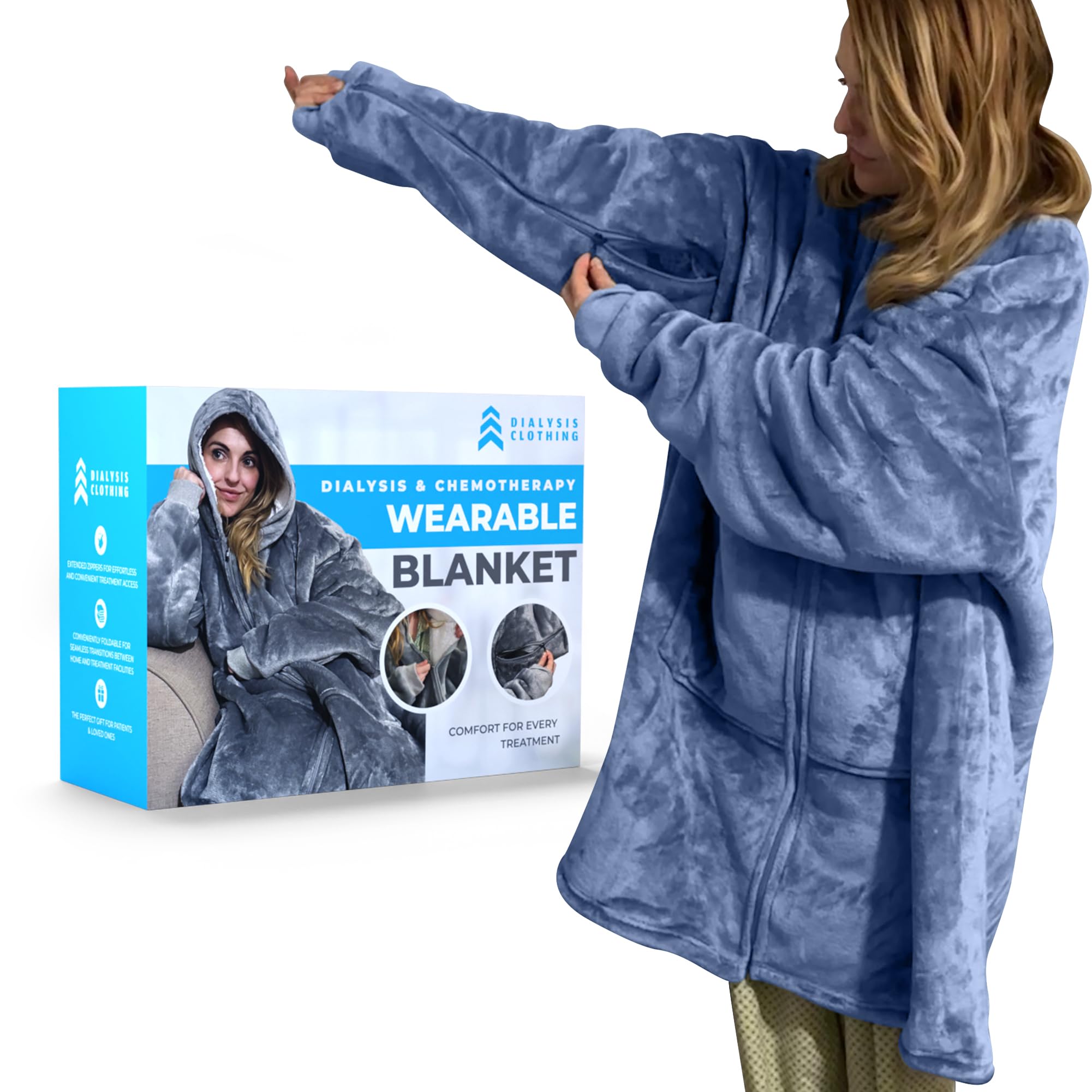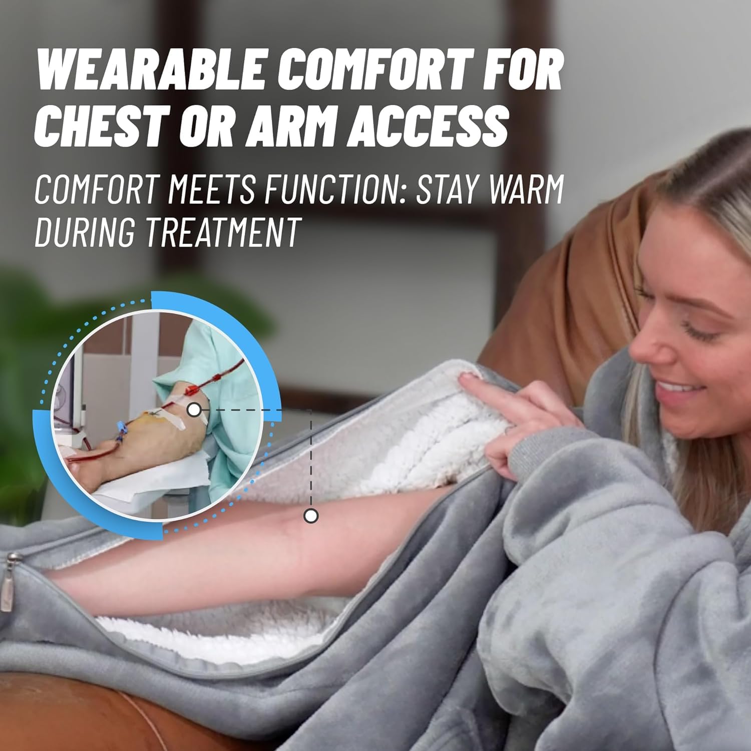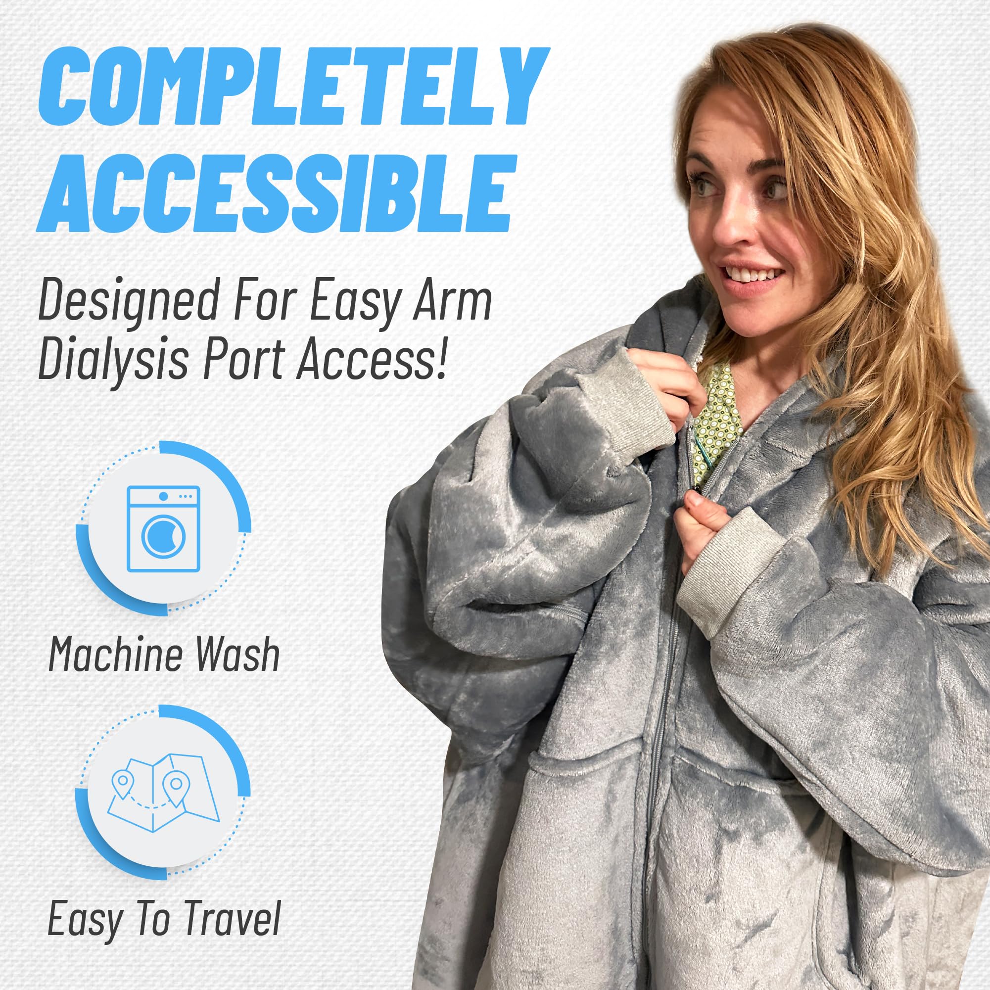 Oversized Arm Zipper Openings for Flexible Access to a Fistula or PICC Line on Either Arm.