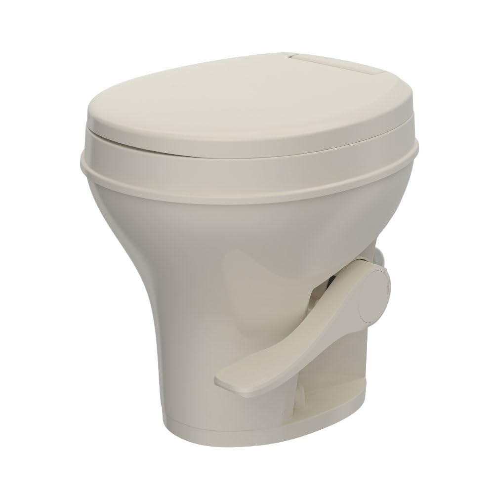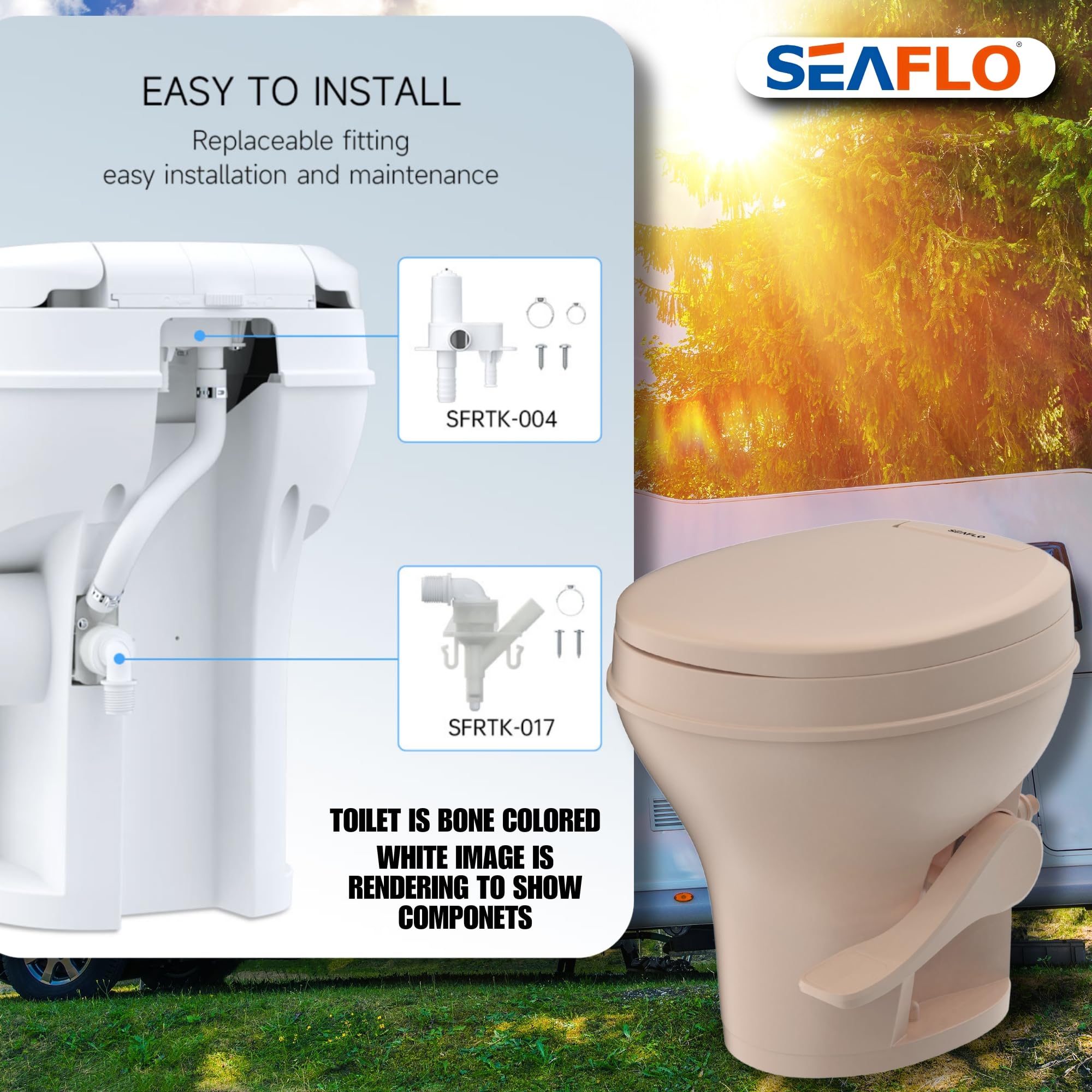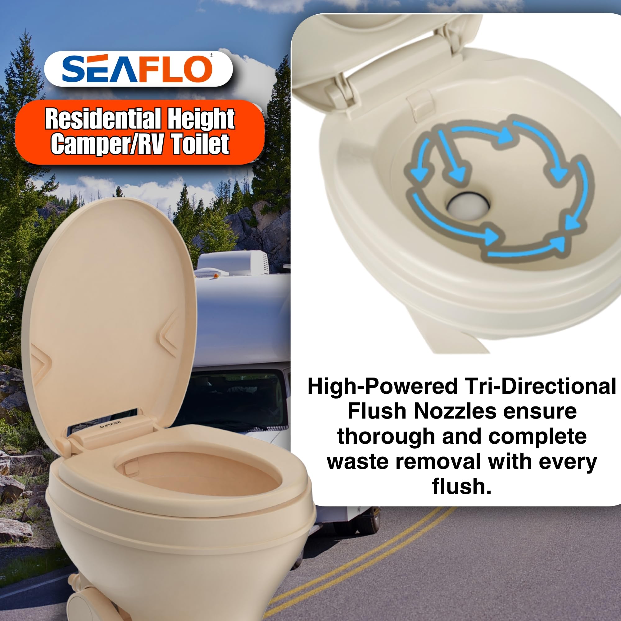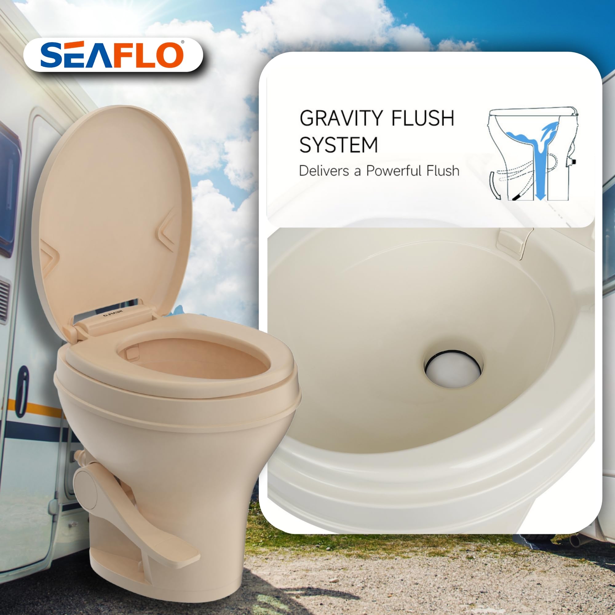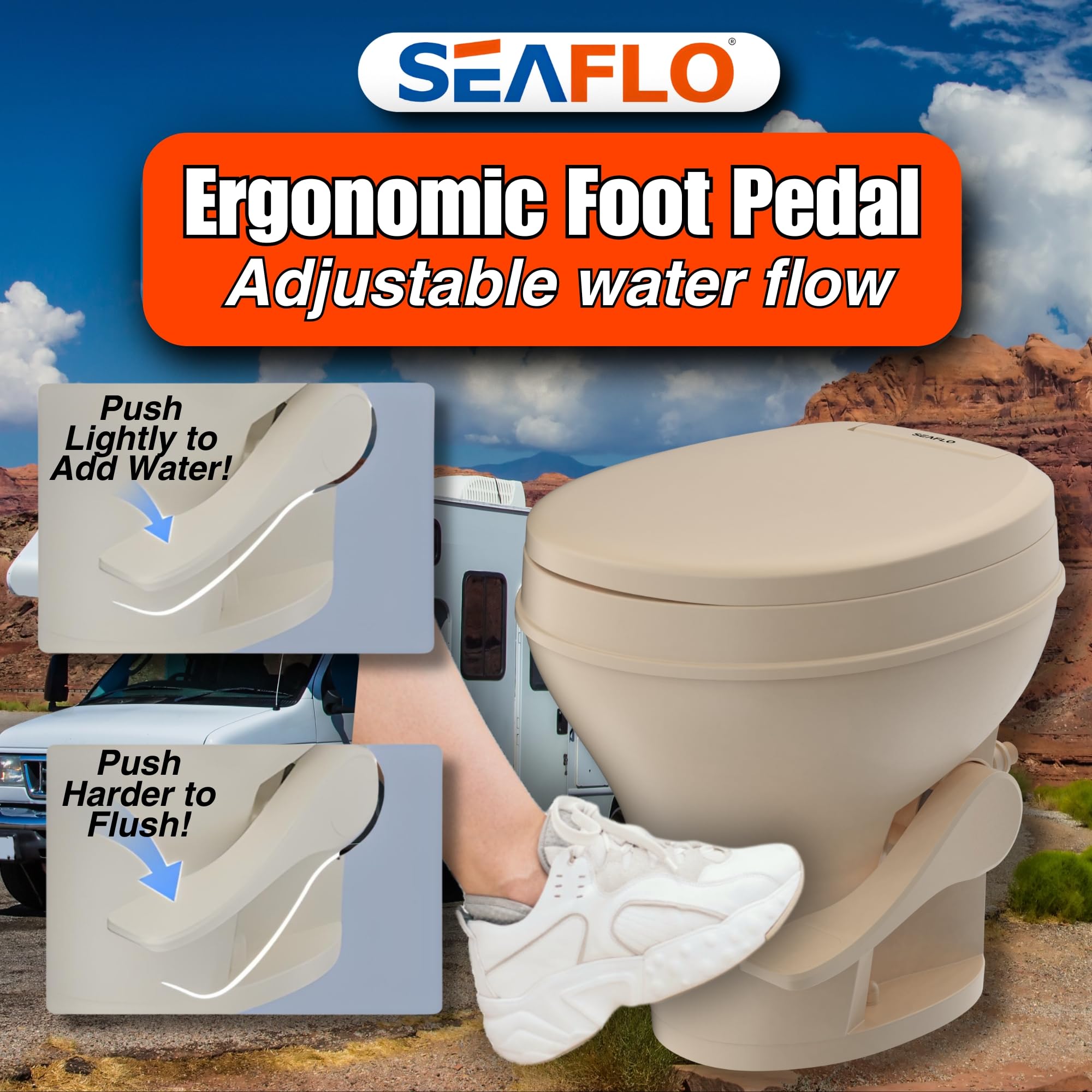 [ SPECIFICATIONS ]: Model: SFRTPH-02-01 | Color: Bone (Beige) | Standard Height: 18.5" | Dimensions: 17.8" x 15.3" x 18.4" (452 x 388 x 468 mm) | Flush System: Gravity Foot Pedal Operation | Bowl: Oversized Elongated Design | Bowl Type: Oversized Anti-Stick | Material: Lightweight, Durable Plastic | Soft-Close Seat | Works with Standard RV Plumbing | Floor Flange Sold Separately | 4-Year Warranty.