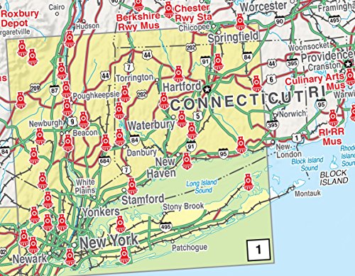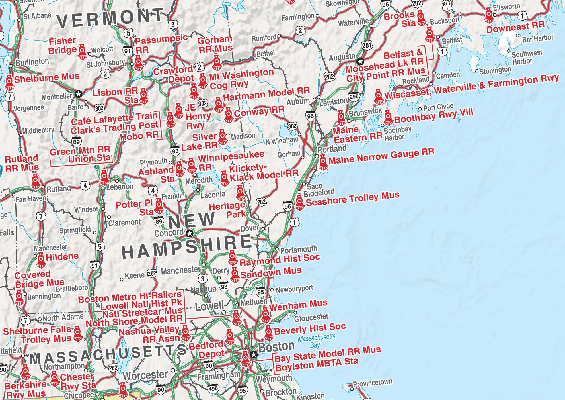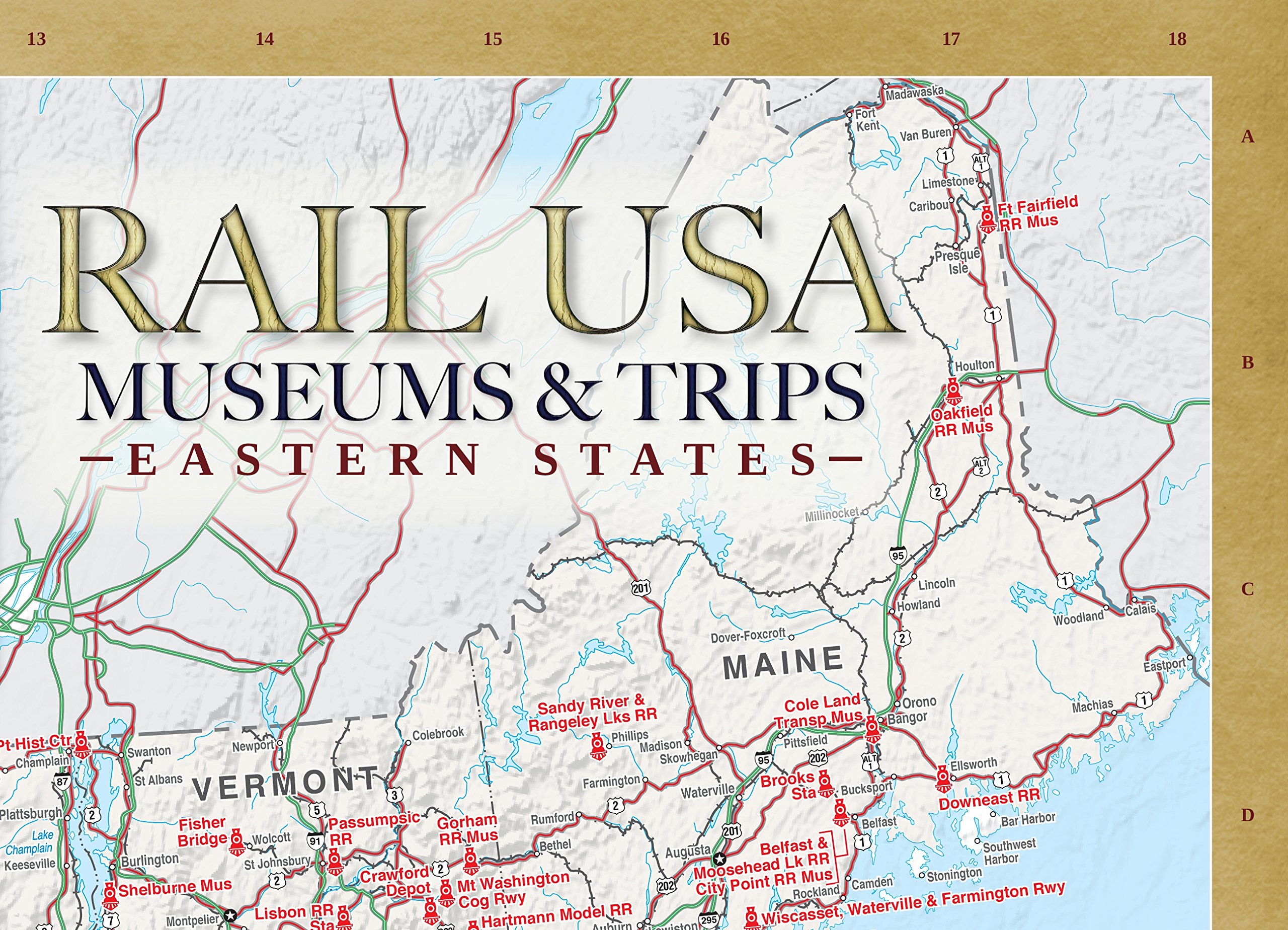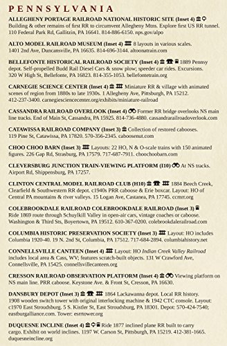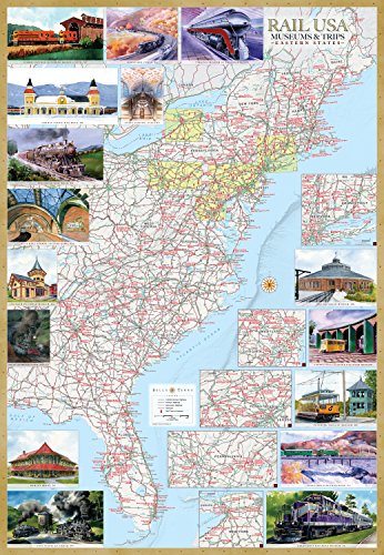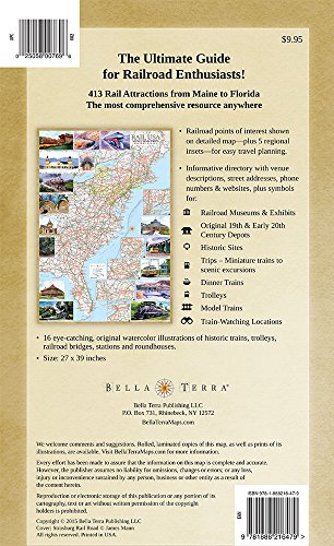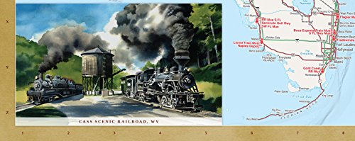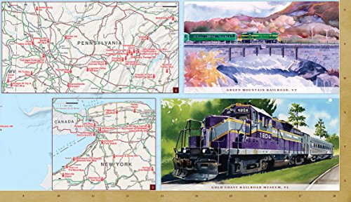The Ultimate Guide for Railroad Enthusiasts! Information on more 413 rail attractions from Maine to Florida -- the most comprehensive and up-to-date listing anywhere. Includes Railroad Museums & Exhibits, Historic Depots, Scenic Railroads, Dinner Trains, Trolley Rides & Museums, Miniature Railroads, Model Layouts & Antique Toy Trains, Railroad Historic Sites, and Train Viewing Platforms & Locations These railroad points of interest are shown on a detailed map for easy travel planning. Sixteen beautiful original watercolor illustrations of trains, stations and roundhouses. 27" x 39", folded to 6" x 9 3/4", printed two sides. Includes: Connecticut, Delaware, DC, Florida, Georgia, Maine, Maryland, Massachusetts, New Hampshire, New Jersey, New York, North Carolina, Pennsylvania, Rhode Islands, South Carolina, Vermont, Virginia, West Virginia. Also available: Central States, Western States and National Edition with all 3 Regional Maps together.