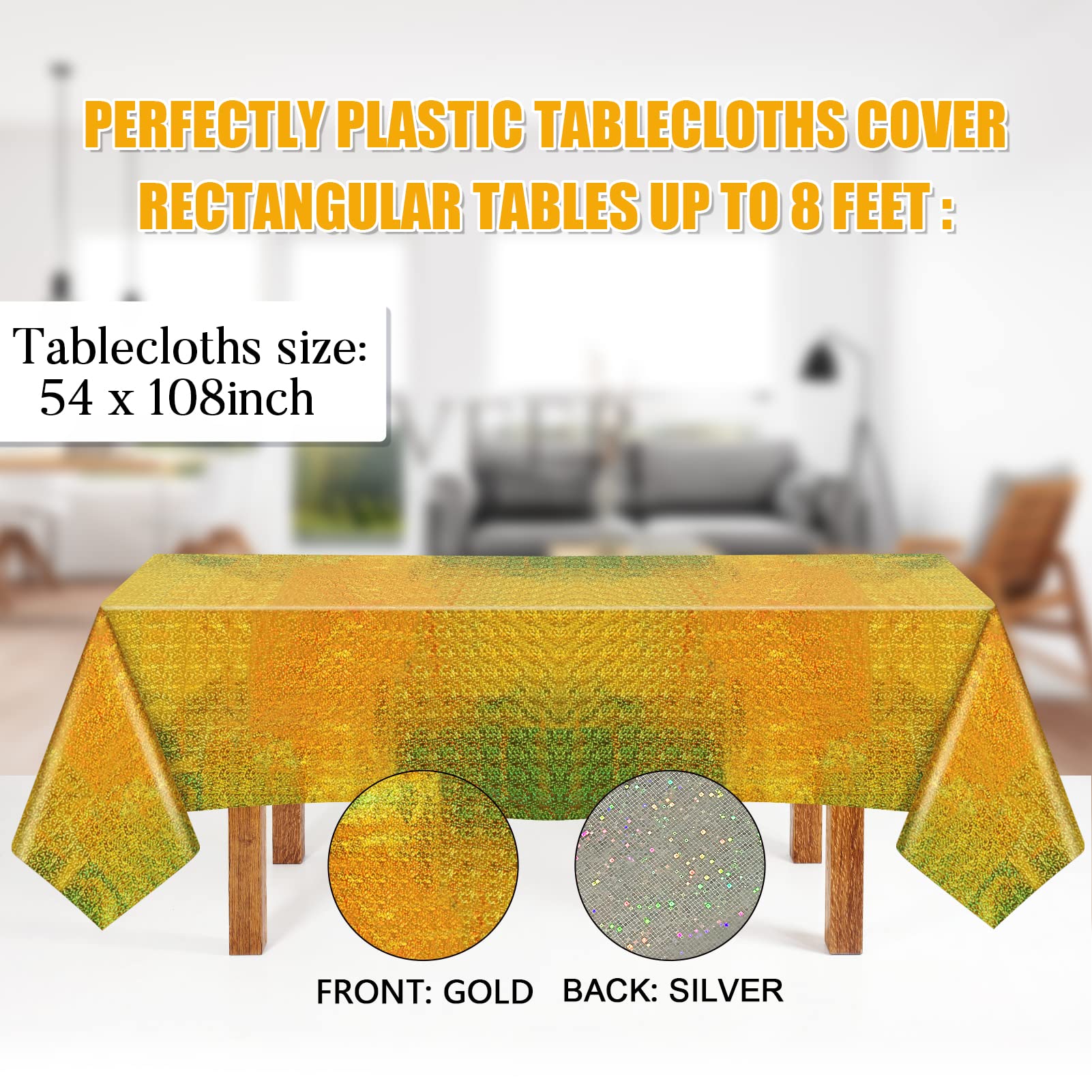 Disposable Tablecloth Package Include: 3 Pcs plastic tablecloth, the size of tablecloth is 54 x 108 inch, they will cover up to an 8-foot table. The plastic table cover is a perfect choice as iridescent party decorations, princess party decorations, baby shower decorations, birthday tablecloth, graduation tablecloth and other occasions