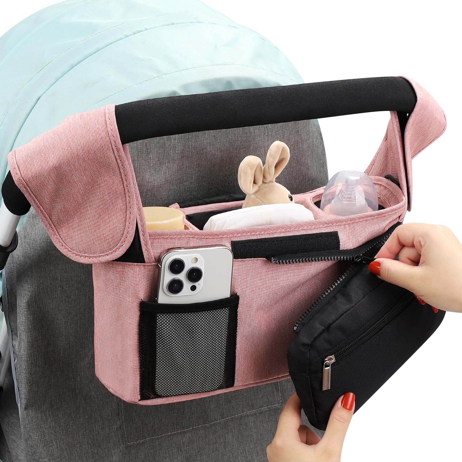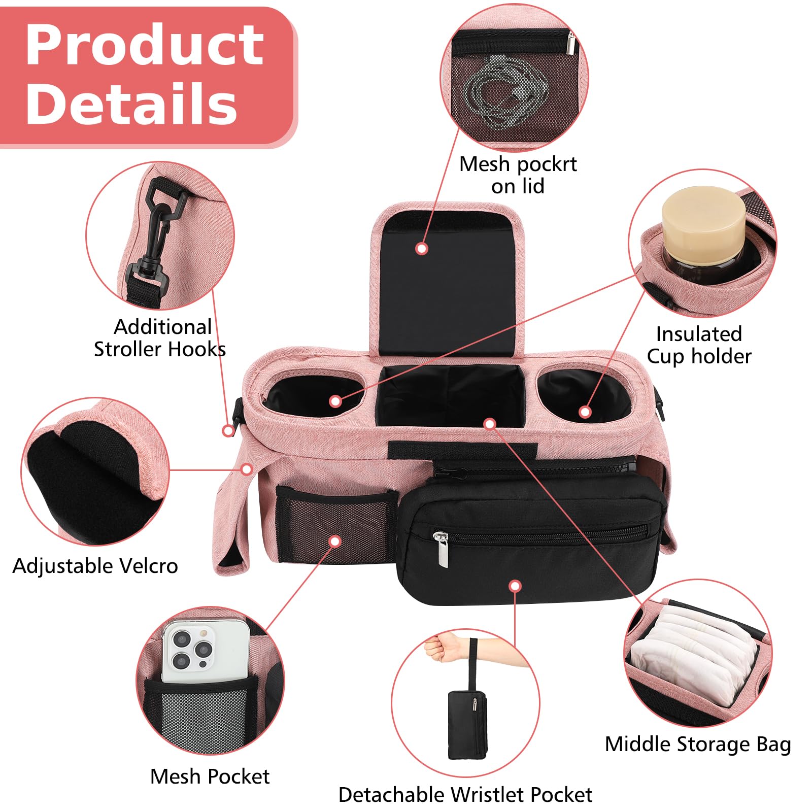 Multi Structure: This stroller storage organizer equipped with multifunctional structure: Insulated cup holders on both sides to place baby bottles and drink cups; The middle storage compartment can accommodate baby diapers, wipes, pacifiers, teething toys and other accessories; Equipped with a detachable and portable small bag, it is convenient for mothers to store important items such as cell phones, wallet etc.