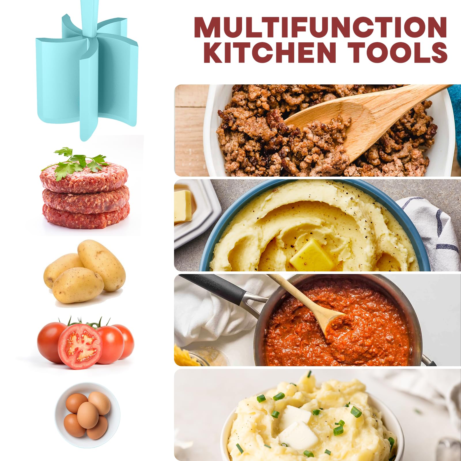 Easy To Use: Simply press the blade of the ground beef smasher into the cooked food and stir to the desired consistency; use the angled blade to scrape the sides of bowls and pots when mixing and mashing food.