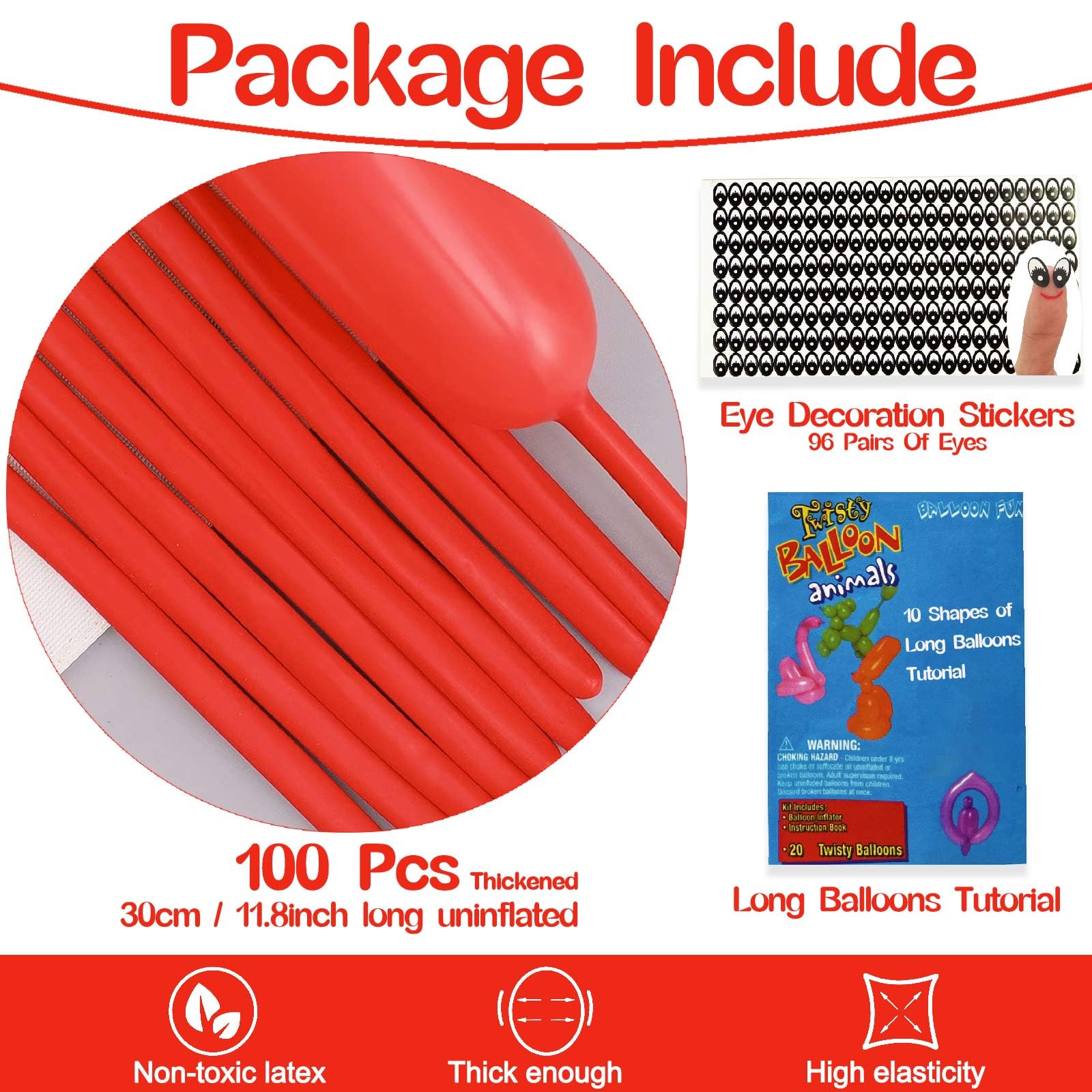 What you get: Pack of 100 Red long balloons, 30cm long uninflated, up to 150cm after inflation, each balloon has undergone rigorous testing to reduce the defect rate as much as possible