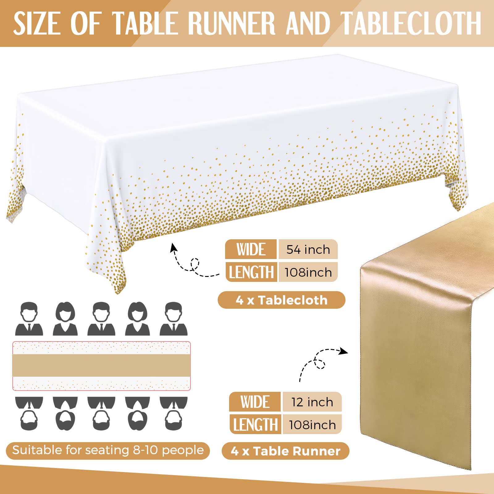 Sufficient Quantities: what you will receive are 8 packs of table covers, containing 4 pieces of plastic tablecloths and 4 pieces of satin table runners; Besides, the sets of table decorations can reduce your selection time and meet your replacement needs