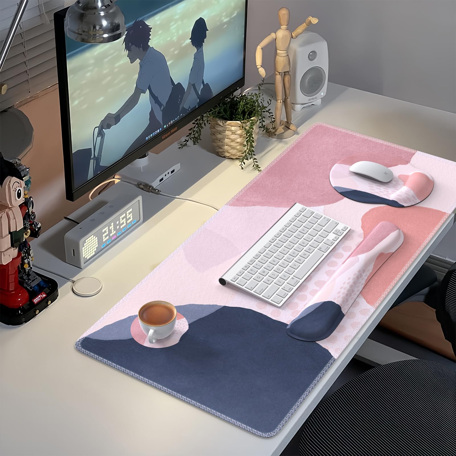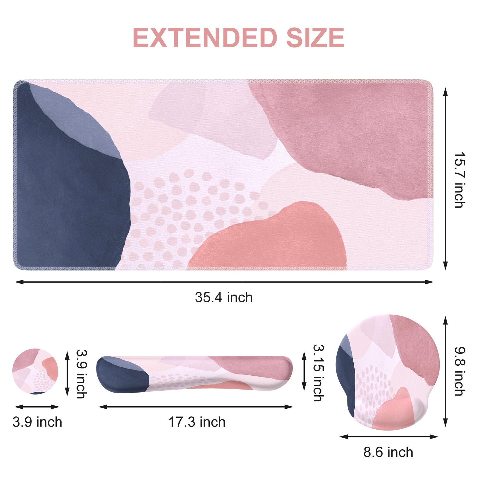 Large Mouse Pad Size: Extended mouse pad:35.4" x 15.7",wrist rest for computer keyboard:17.32" x 3.15" x 0.98",wrist rest for mouse:8.66" x 9.84" x 0.86",Coaster:3.93" x 3.93"