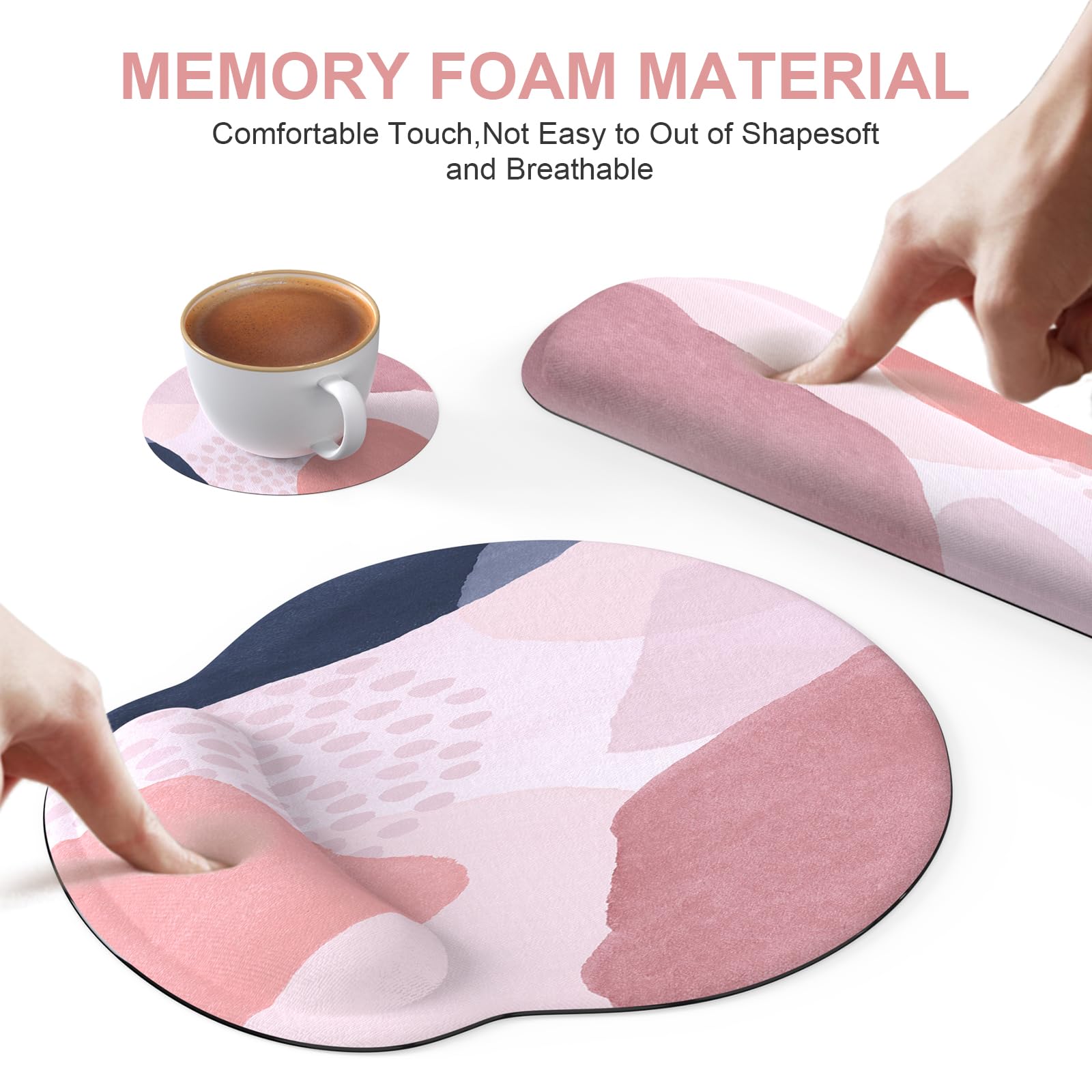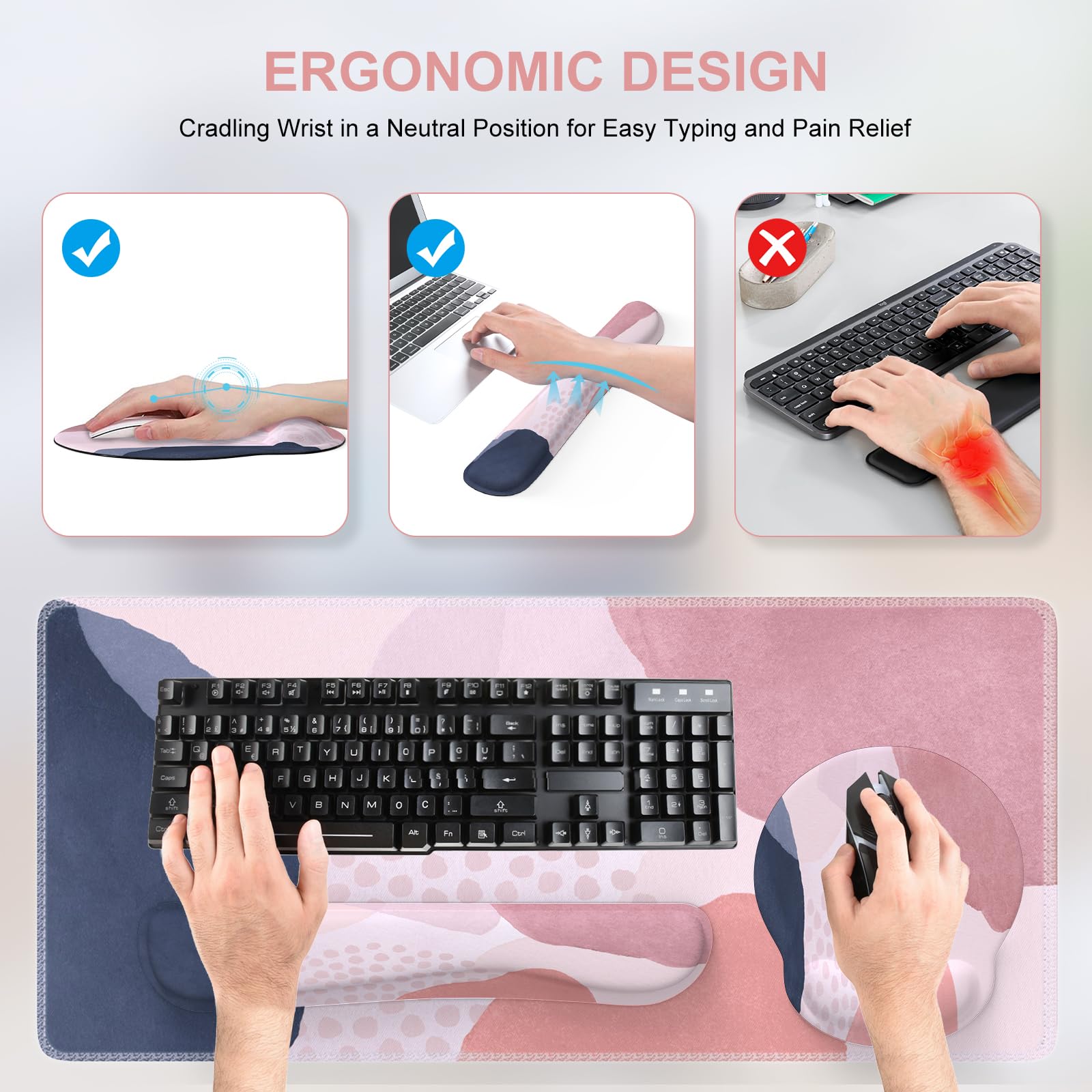 Ergonomic Design: Ergonomic mouse pad with wrist rest fits the wrist perfectly, the keyboard wrist rest and mouse wrist rest can provide a good touch and effective support for your wrist, keep your wrist and hand relaxed
