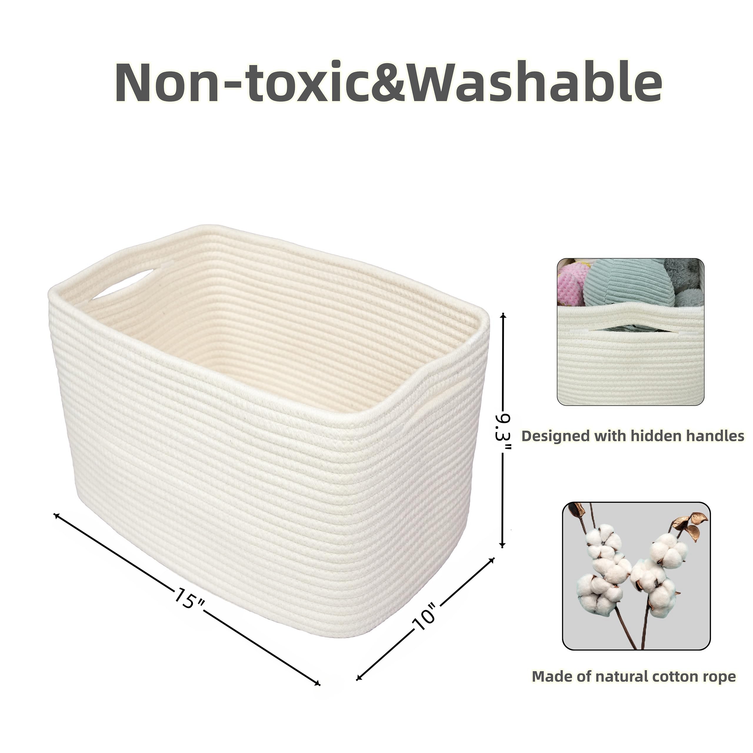 1, Medium to Large rectangle woven basket for storage: Our rope basket with handles size is 15”X10”X9.3”. Designed as home storage basket for organizing. Could use as toy basket, pet basket, book basket, towel basket, clothes basket, nursery basket, wicker basket for storage and more. Perfect as storage basket for shelves or closet storage bins to store household items.