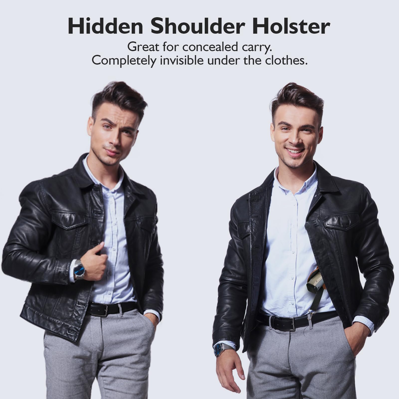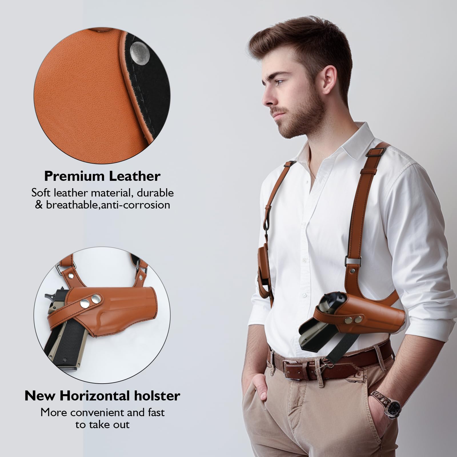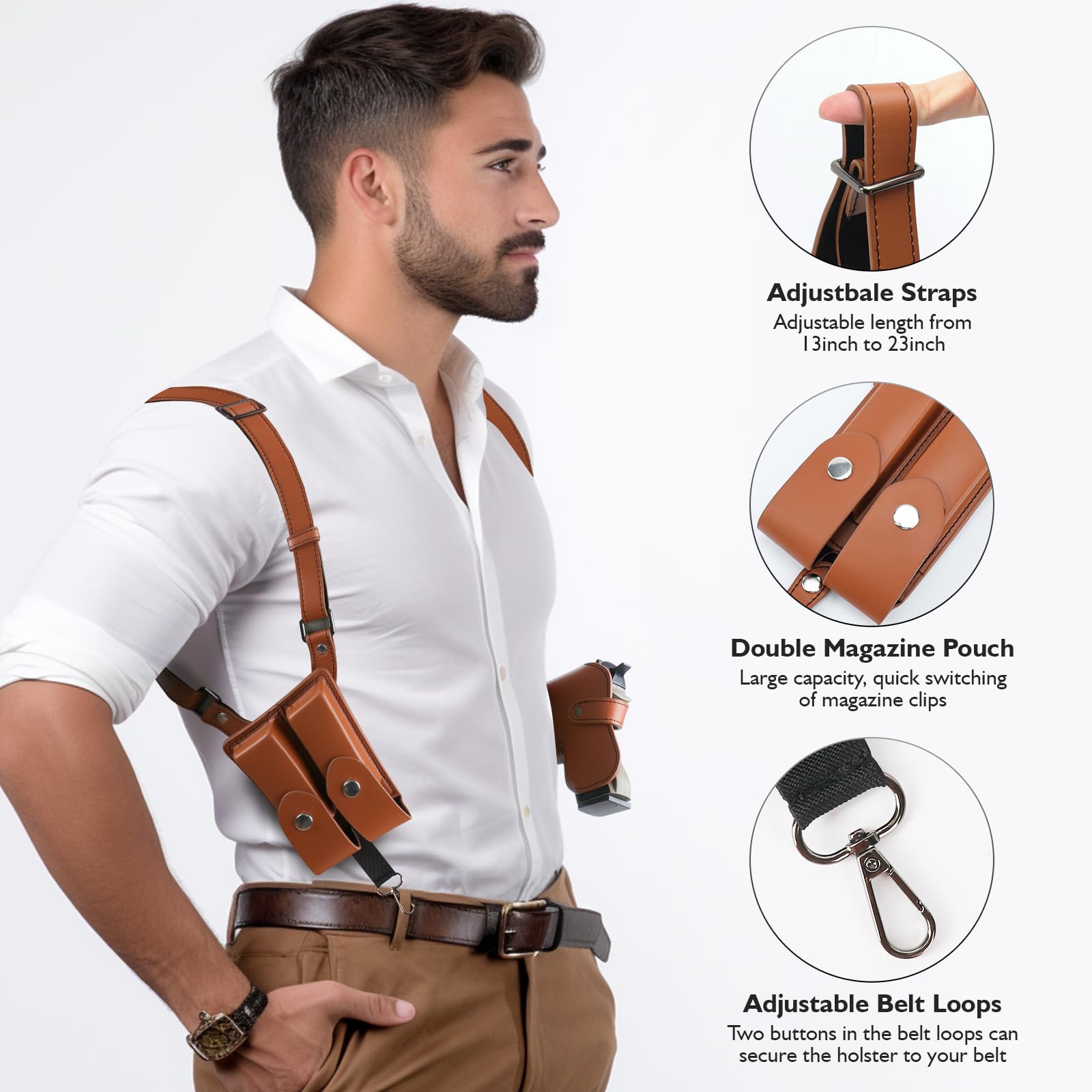 Concealed Carry Leather Gun Holster: Are you worried about how to carry a gun conveniently? Our Shoulder Holster are designed to be worn covertly under your shirt, it effectively conceals your firearm while offering remarkable comfort, with 2 pockets for storing magazines, convenient for you to store your gun and magazines and free your hands.