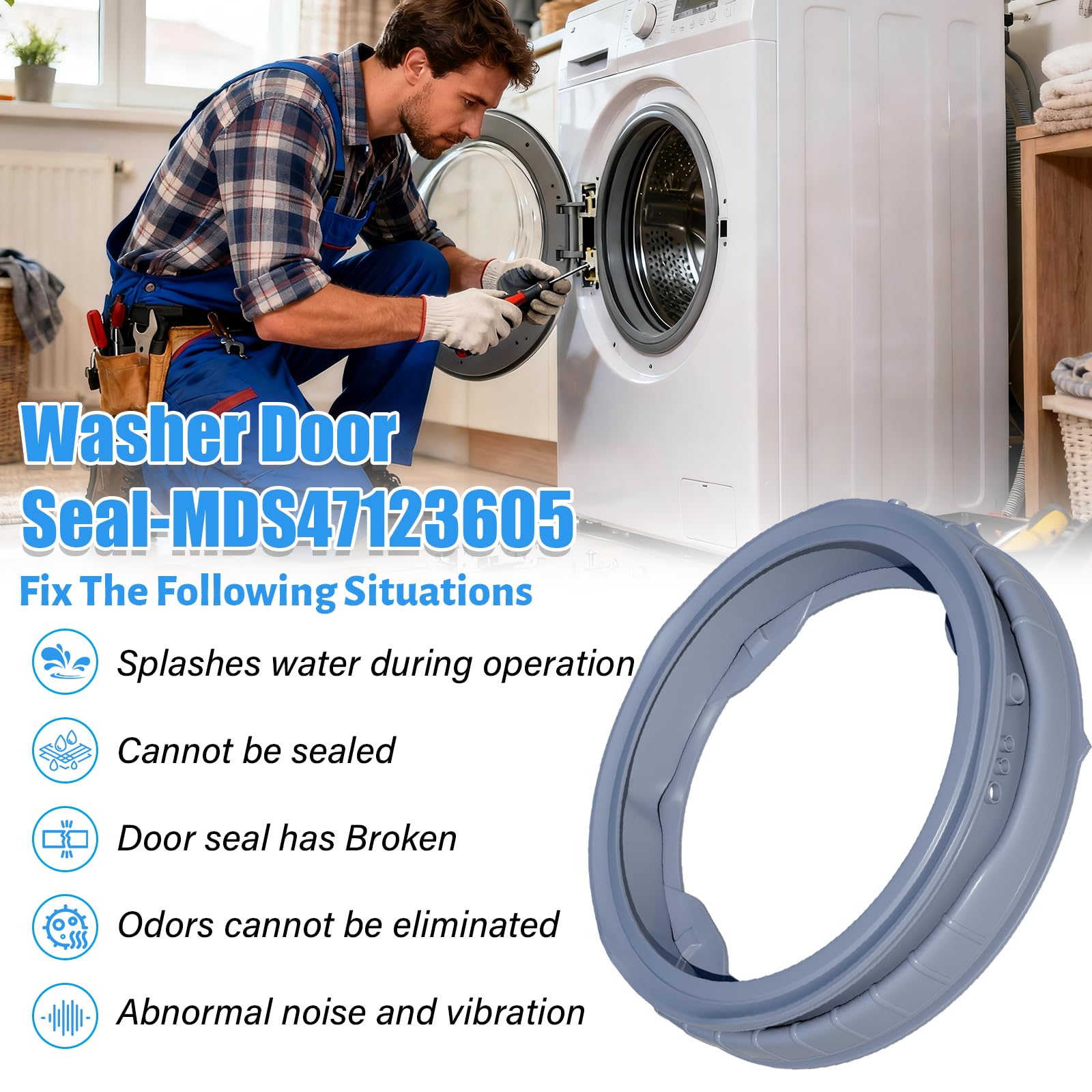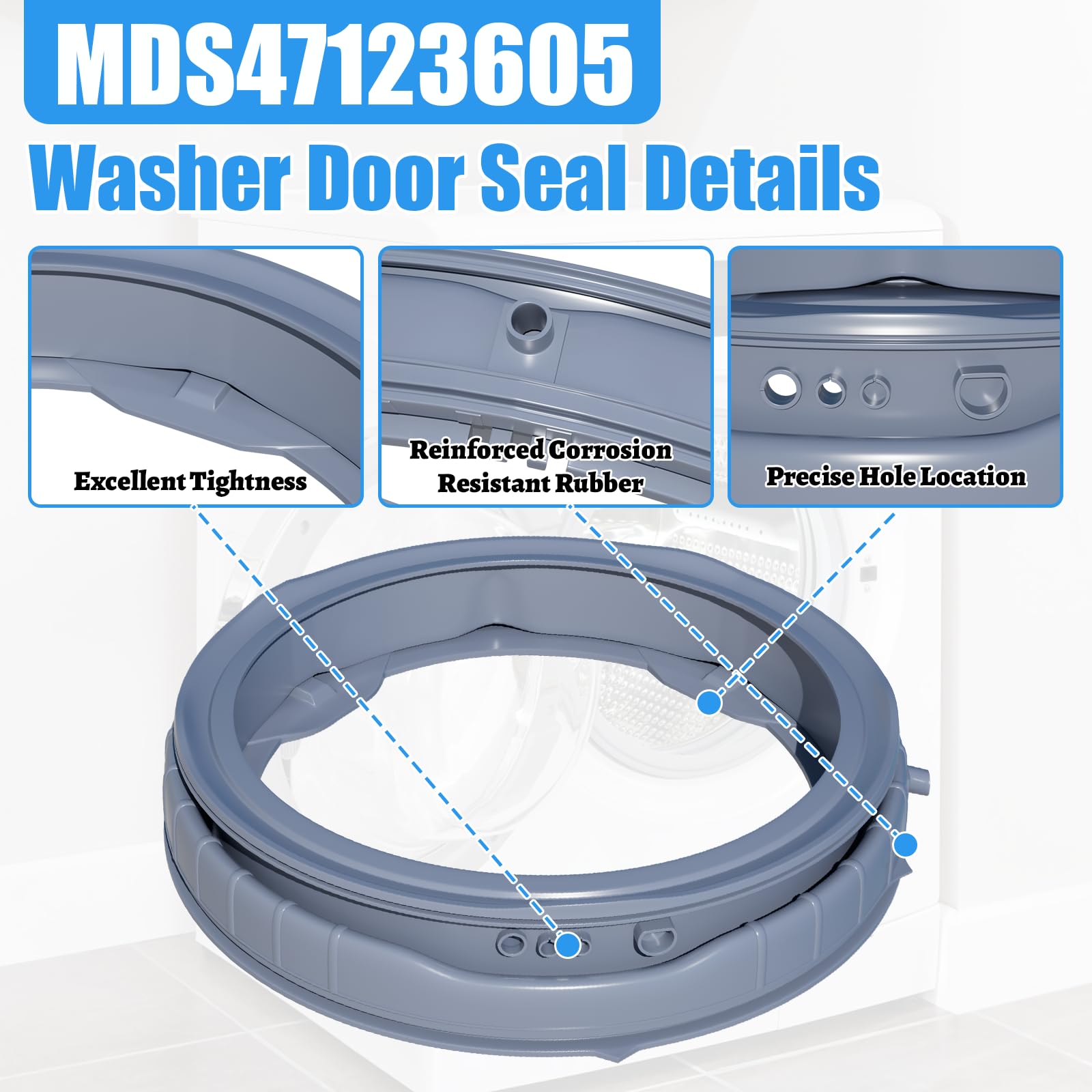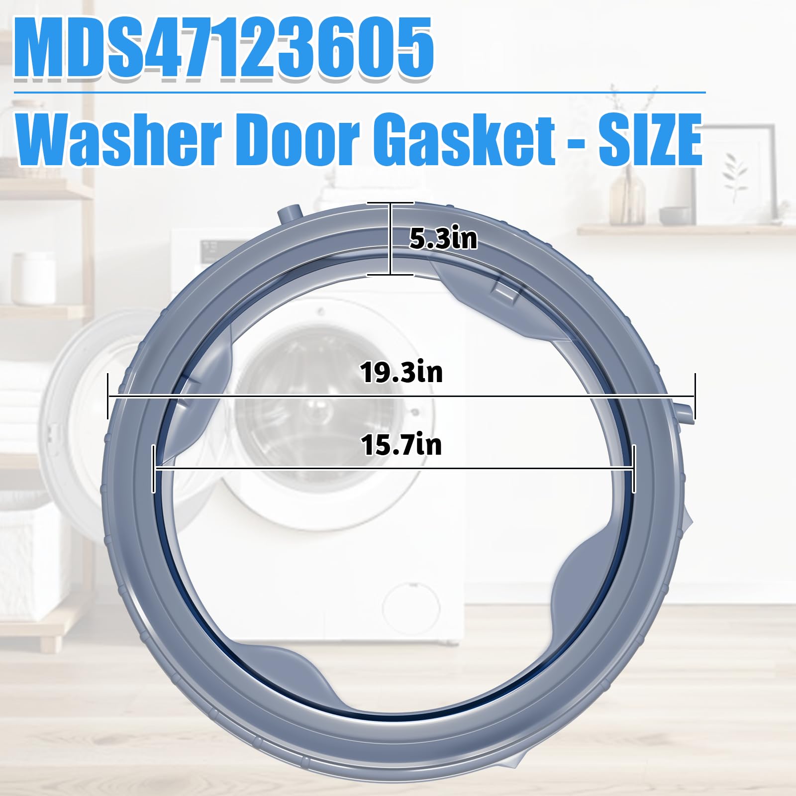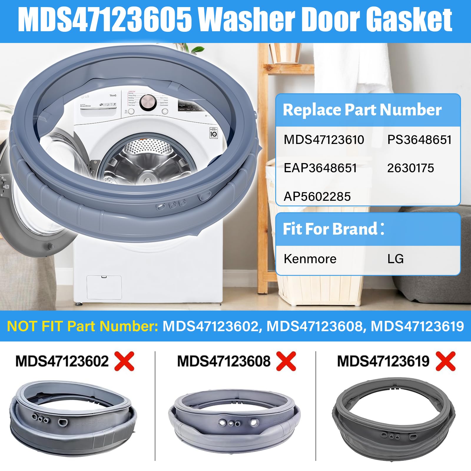 【Upgraded MDS47123605 Washer Door Boot Seal】MDS47123605 Washer door boot gasket for LG,Kenmore front load washer door seal replace part numbers: MDS47123605, AP5602285, MDS47123610, 2630175, AH3648651, EAP3648651, PS3648651.Upgraded MDS47123605 lg Washer Door seal can solve this follow issue: A: Splashes water during operation; B: Cannot be sealed; C: Door seal has Broken; D: Odors cannot be eliminated; E: Abnormal noise.
