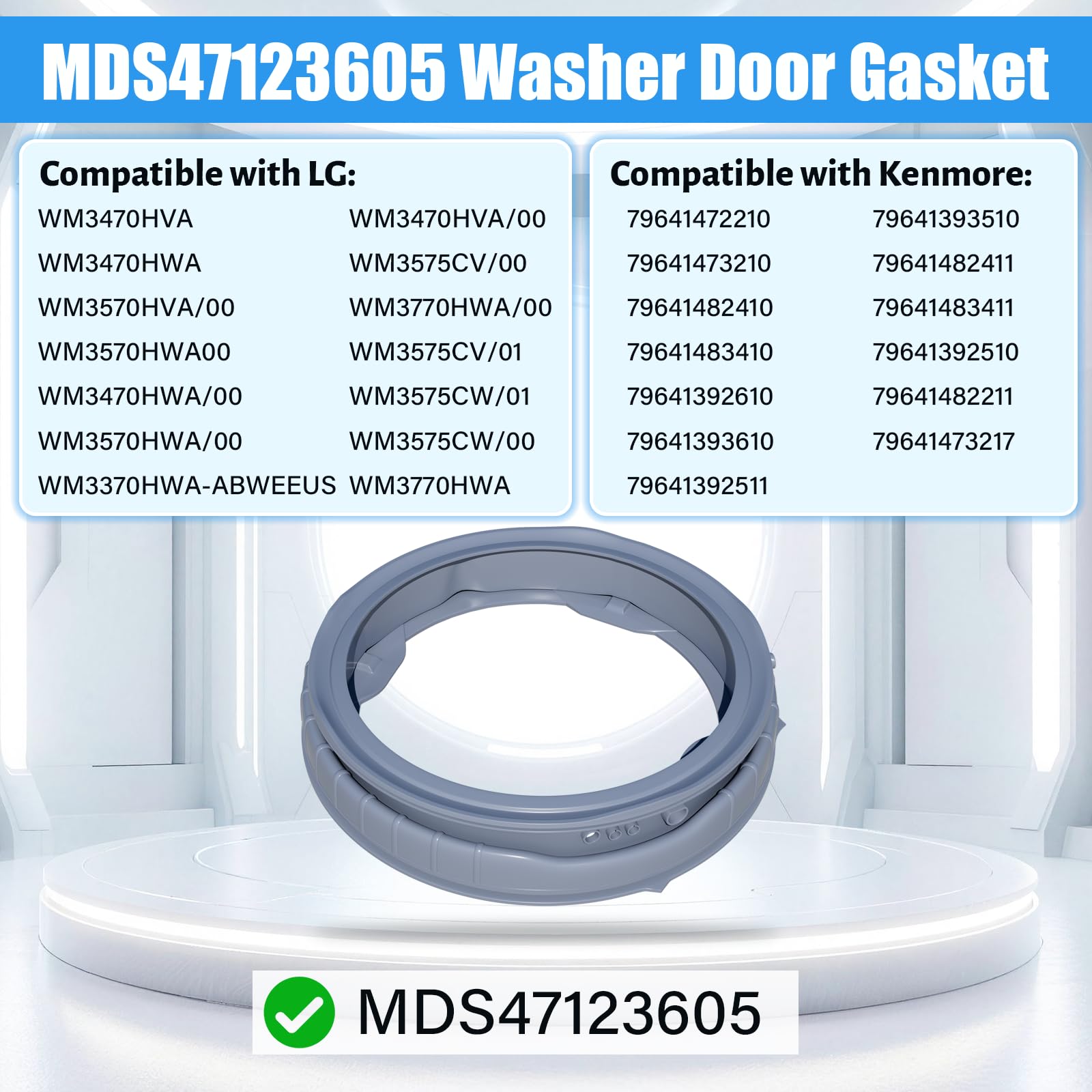 【MDS47123605 Washer Door Gasket Fits LG Washer Parts Models】MDS47123605 washer door seal for LG washer gasket fit: WM3470HVA,WM3470HWA, WM3470HWA/00, WM3470HVA/00, WM3570HWA/00, WM3570HWA00, WM3570HVA/00, WM3575CW/00, WM3575CW/01, WM3575CV/00, WM3575CV/01, WM3770HWA, WM3770HWA/00.Fit Kenmore Washer door boot seal parts: 79641472210, 79641482211, 79641482410, 79641482411, 79641392510, 79641392511, 79641392610, 79641473210, 79641473217, 79641483410, 79641483411, 79641393510, 796413936102 door seal.