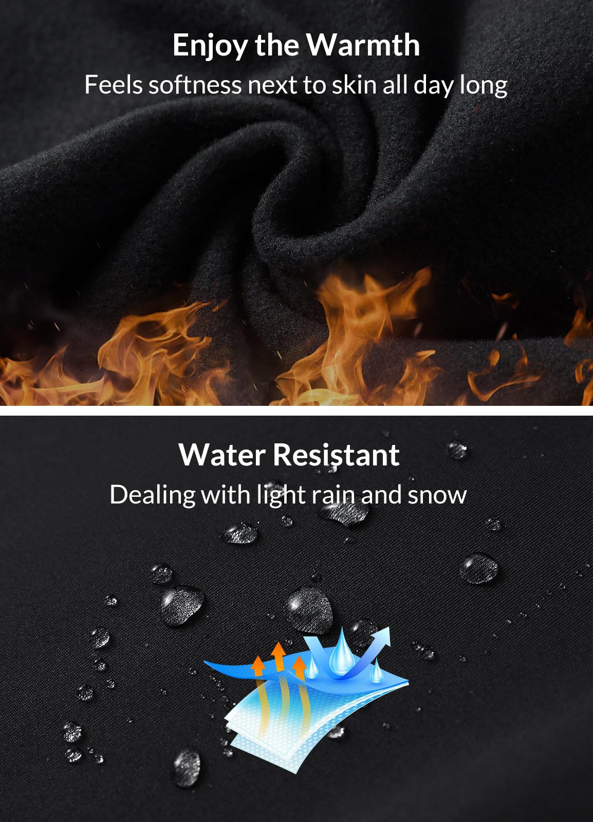 Fleece Lined: Soft fleece lining can withstand the severe cold and keep you warm, ideal for cold weather of 20°F-50°F