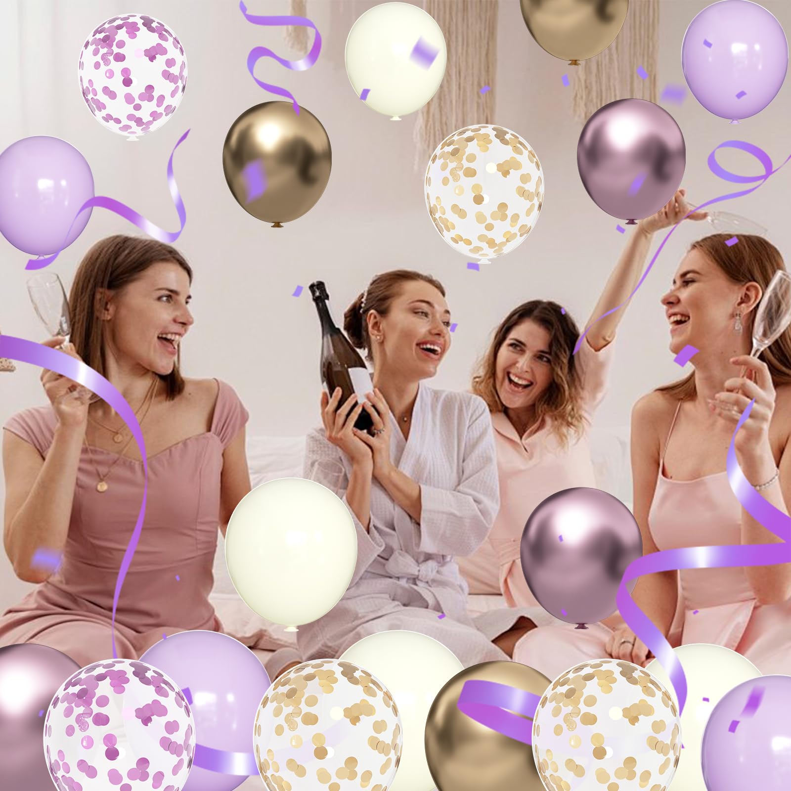 ღ【Valuable Combination】: The purple gold and white balloon arch kit includes 15 pastel purple balloons, 15 ivory balloons, 10 metallic Lavender balloons, 10 champagne balloons, 5 purple confetti balloons and 5 gold confetti balloons, 1 roll of light purple ribbon and 1 roll of gold ribbon. All balloons blow up to about 12 inches in size.