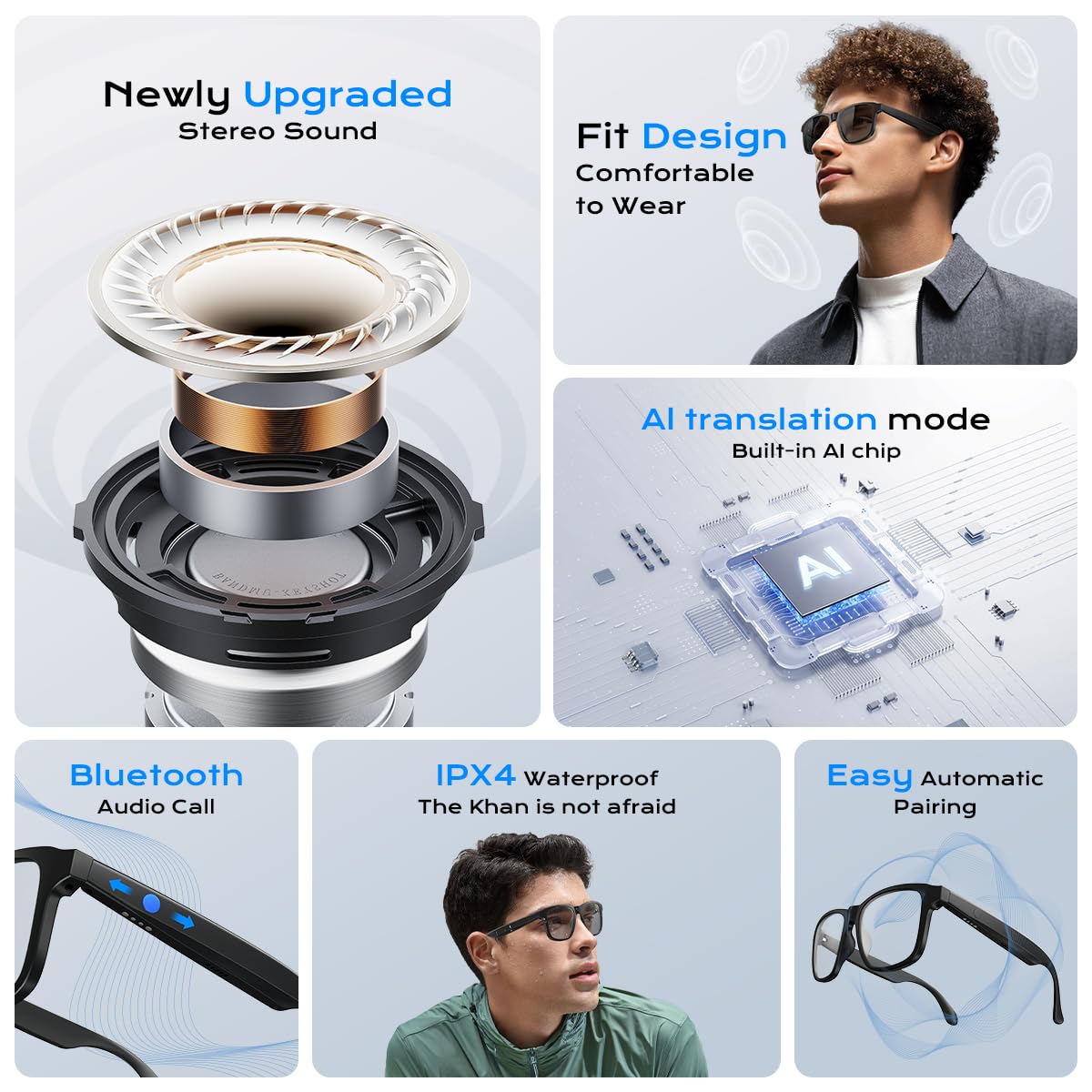【Built-in Microphone and Speaker】Speaker glasses are equipped with two superior speakers on each side and the microphone is hidden, it can 360°enhance stereo sound, with upgraded mic built into the frame, you can take calls hands-free listen and speak clearly.