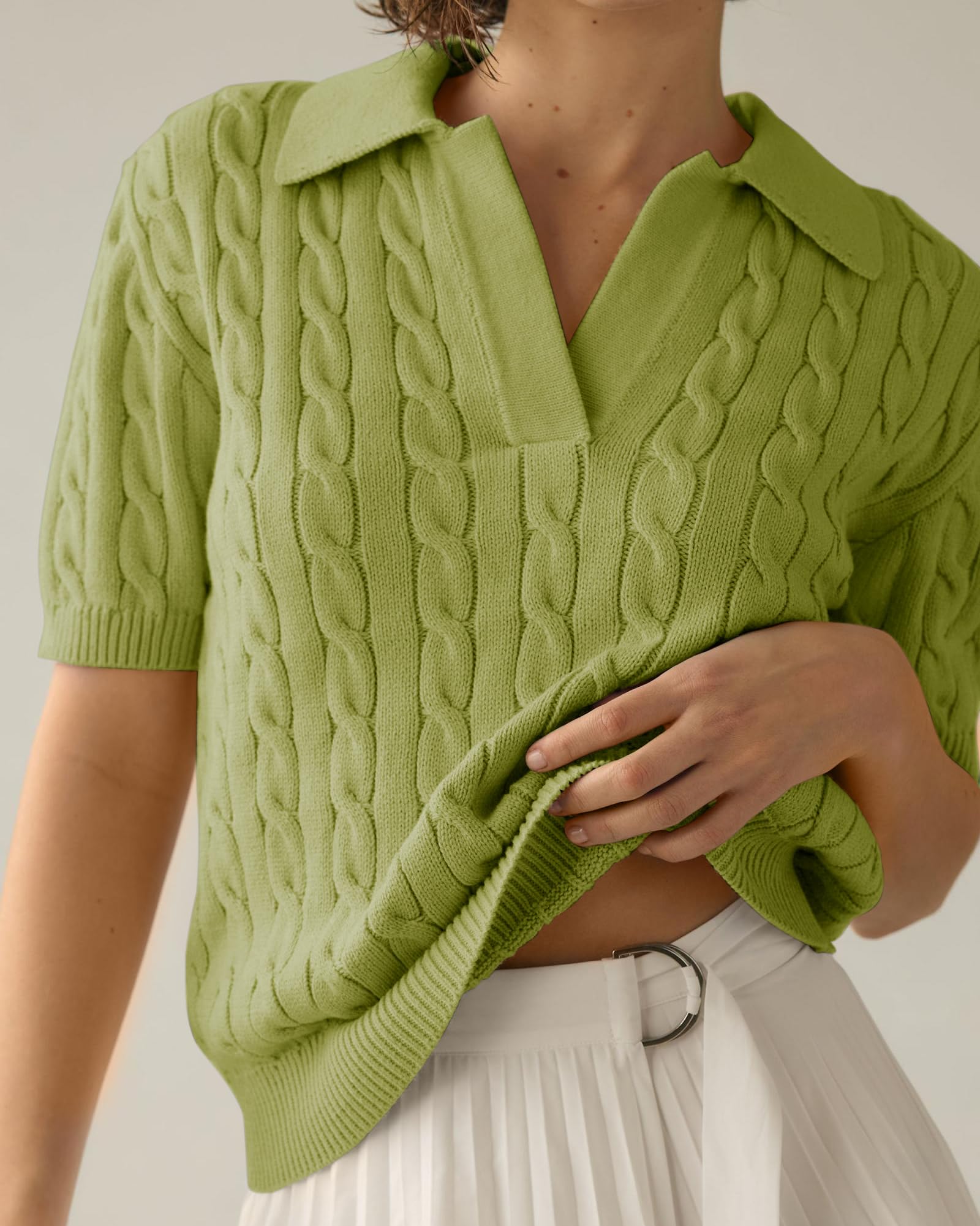 Features: Women's Cable Shirt, Short Sleeves, Slim V Neck, Small Lapels, Elasticized Ribbed Cuffs and Hem, Knit, Basic Solid Color, Loose Fit, Casual Style. Comfortable women's soft summer top.